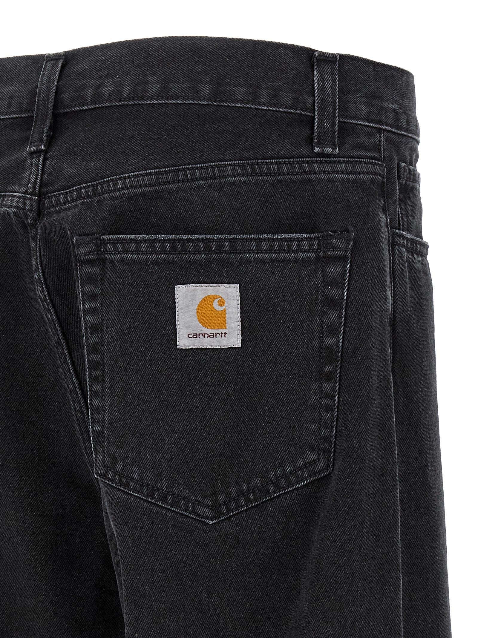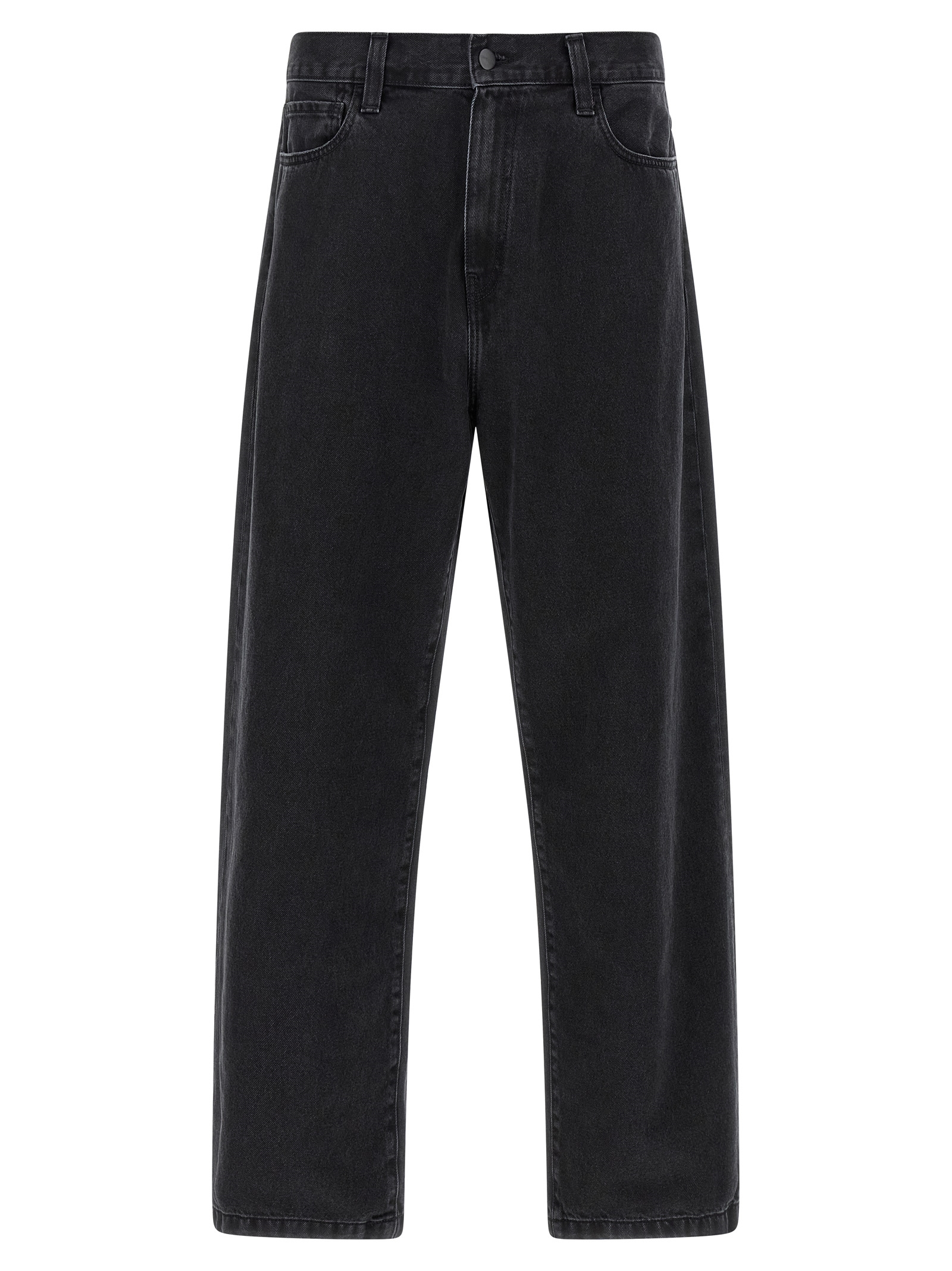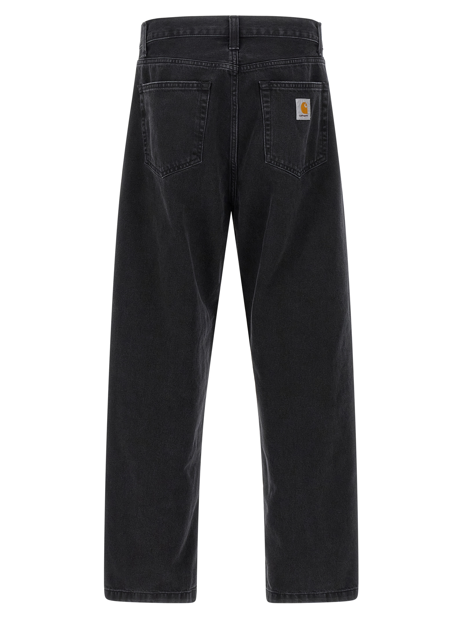 Robertson stonewashed heavy cotton denim Landon jeans, front zip and button closure, five pockets, straight leg, and back logo patch.