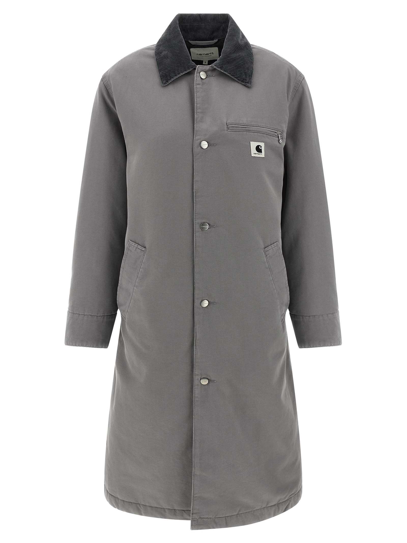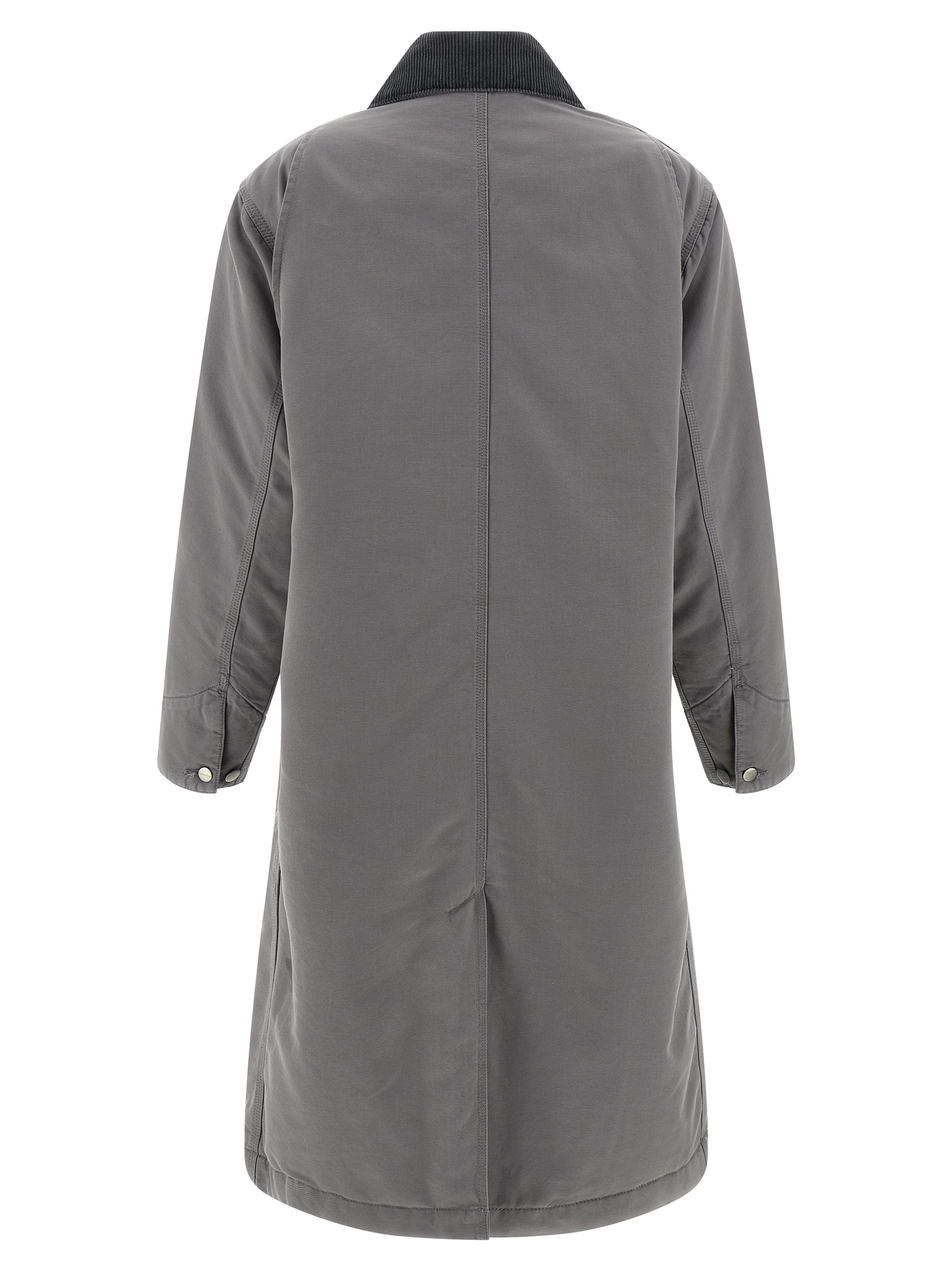 'Webster' long coat in medium-weight cotton canvas, diamond-shaped nylon lining, tone-on-tone corduroy shirt collar, logo patch and front button closure, pockets, long cuffed sleeves, back vent.