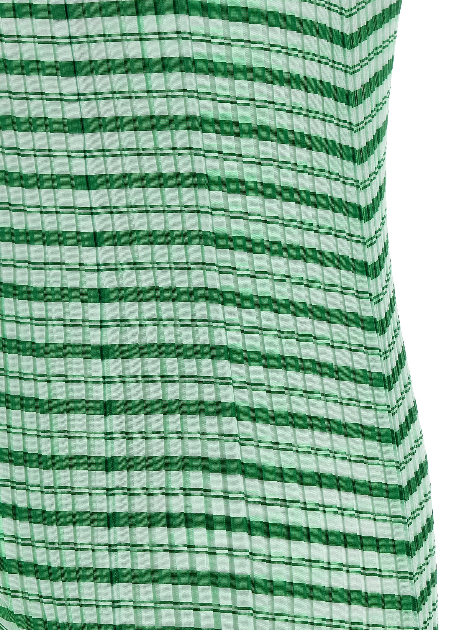 Long 'Generic Stripes (Machine Pleats)' dress in semi-transparent pleated fabric with striped moiré effect, high neck with button closure and back teardrop cut-out detail, sleeveless, asymmetrical hem with sculptural design.