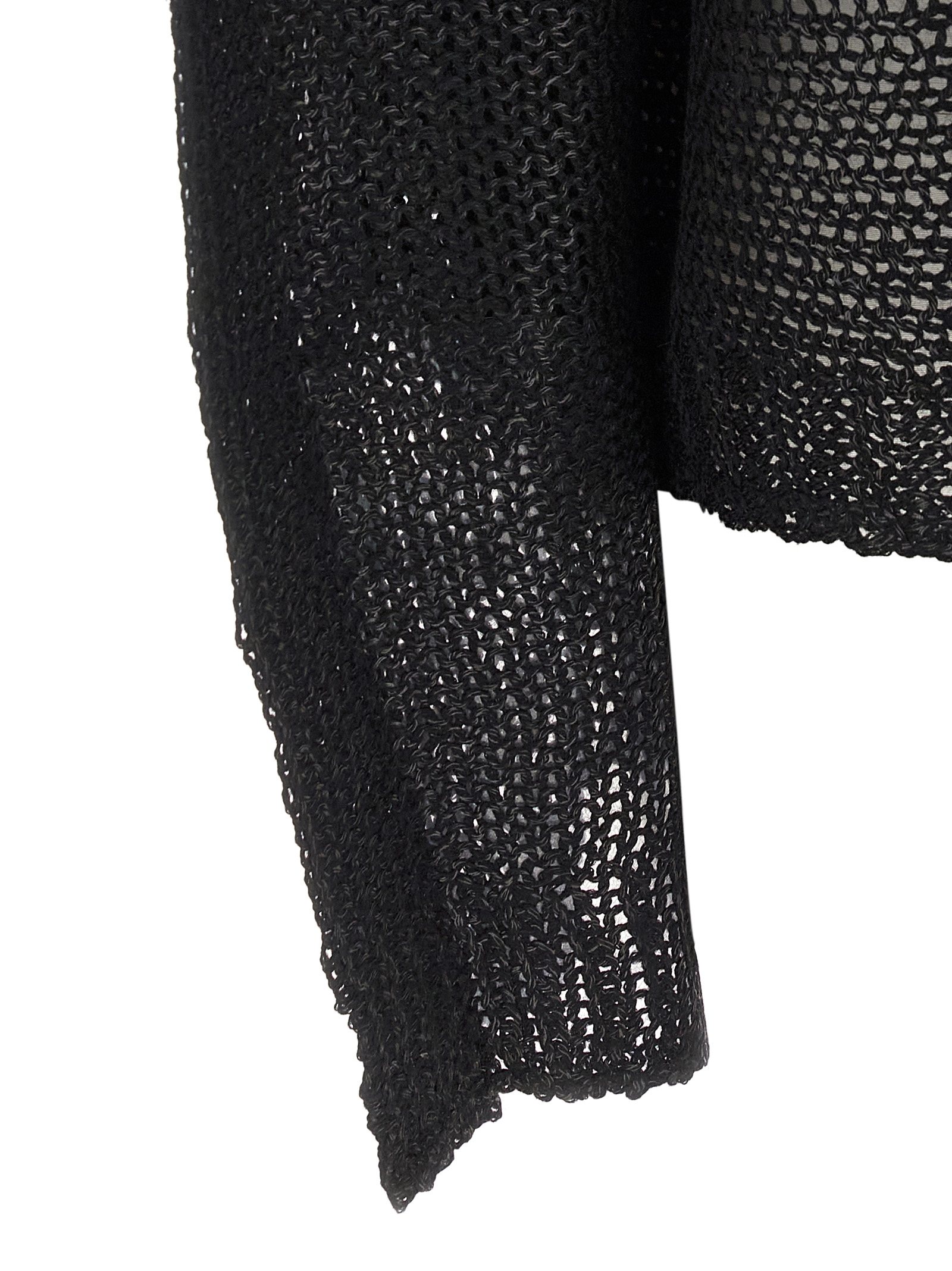 'Panini' wool and alpaca yarn blend top with thermoplastic synthetic fibers, exaggerated fake collar, extra long sleeves with slit on the cuffs.