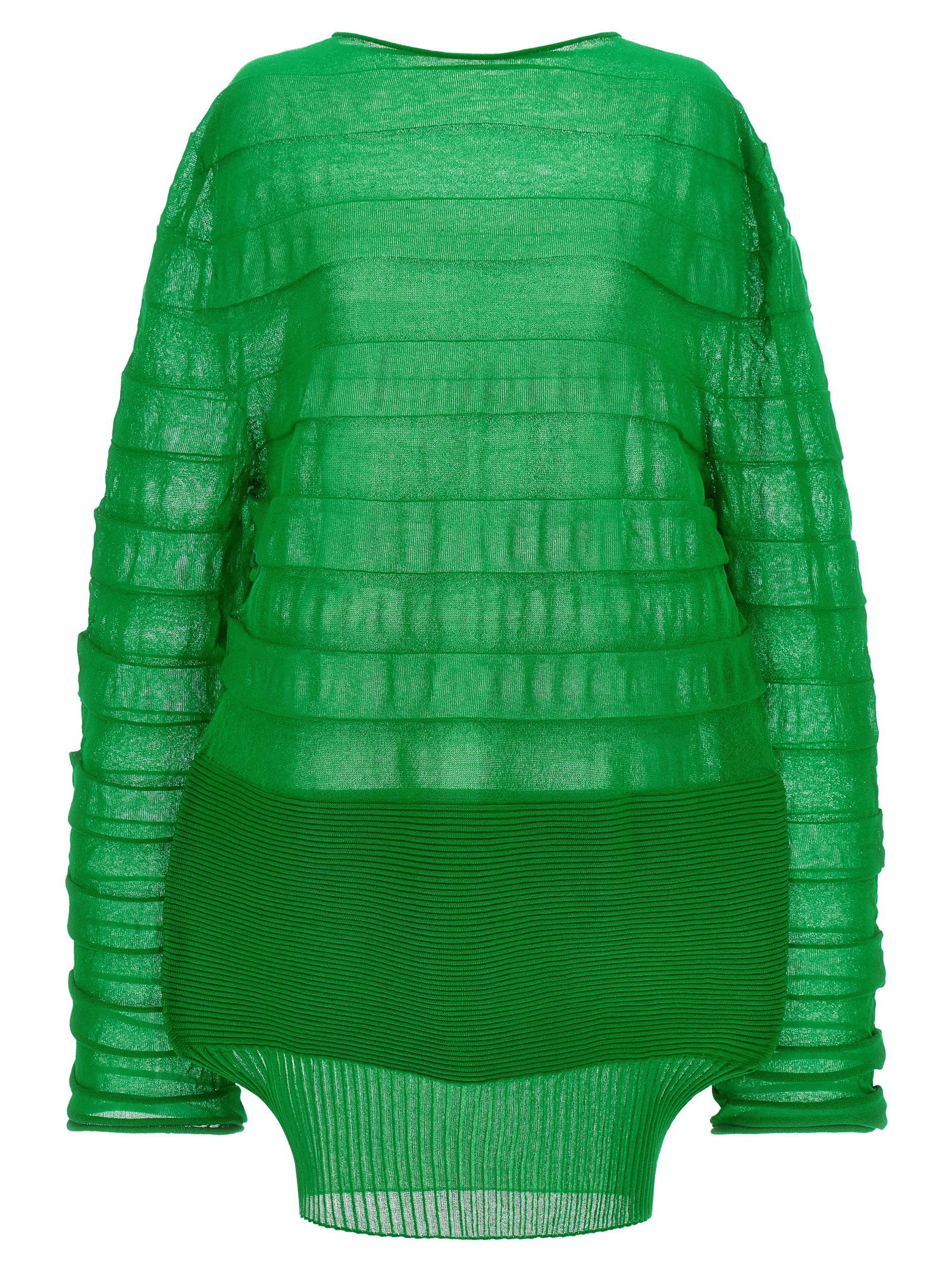 'Moving Knit' fabric top with contrasting knitted structures that create a light and elastic texture, round neckline, long sleeves, and asymmetrical hem.