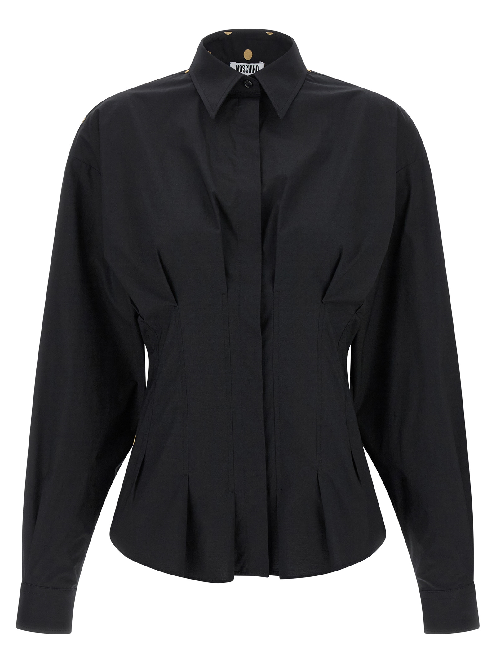 Cotton shirt, collar, polka dot half print, flared waist with pleats, button closure, long sleeves with cuffs.