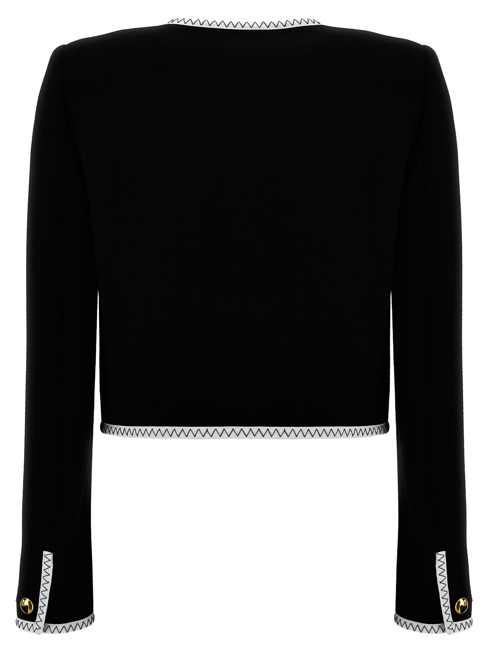Short jacket in crepe viscose blend with button closure, pockets, contrasting grosgrain trims, long sleeves, and padded shoulders.