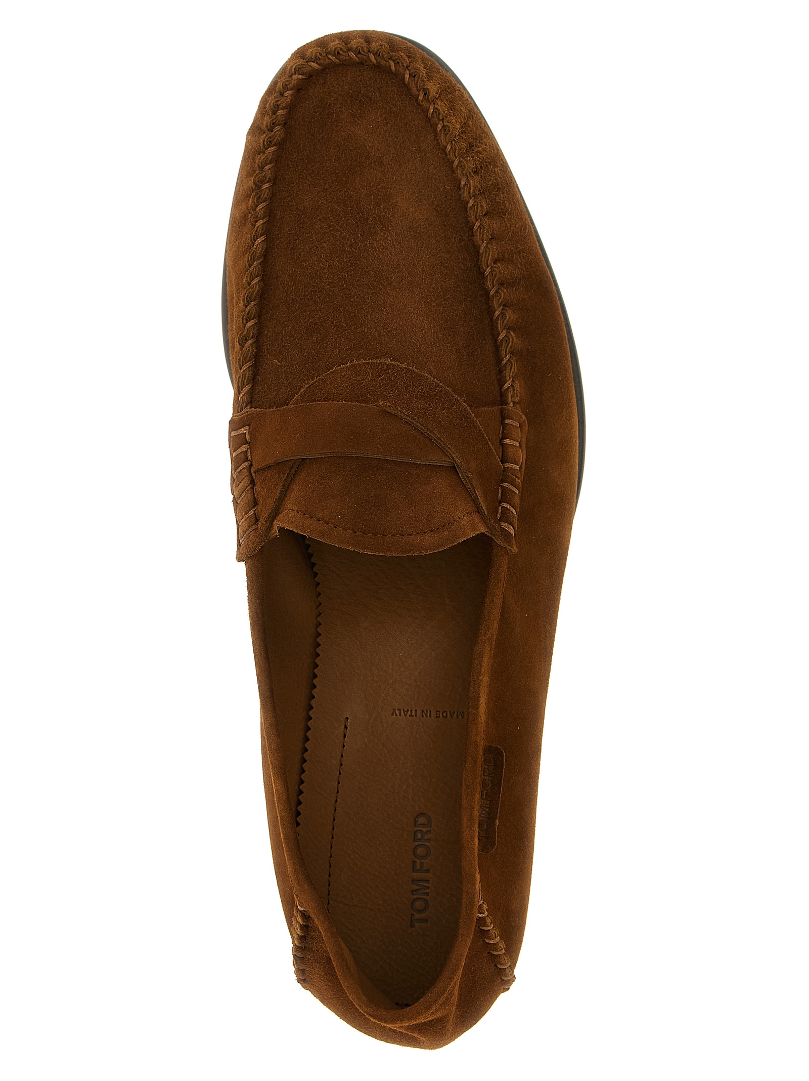 'Ripley' suede loafers with curled stitching, twisted band detail on the front, and leather sole.