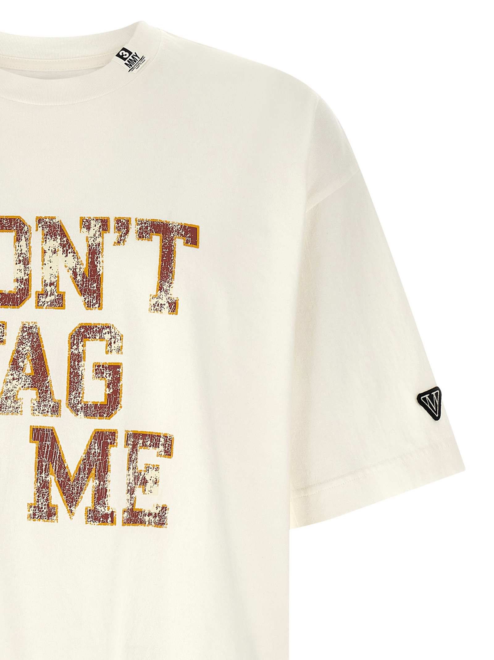 'Don't Tag Me' flamed heavy cotton t-shirt with front and back print, front logo patch, crew neck, short sleeves with dropped shoulders and logo patch, side slits, asymmetrical hem.