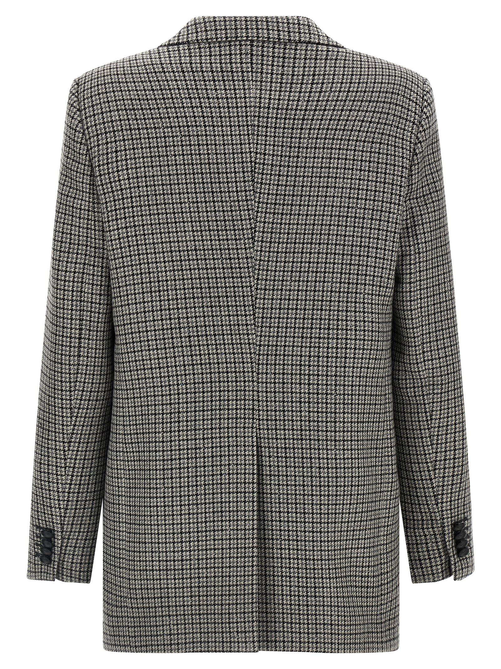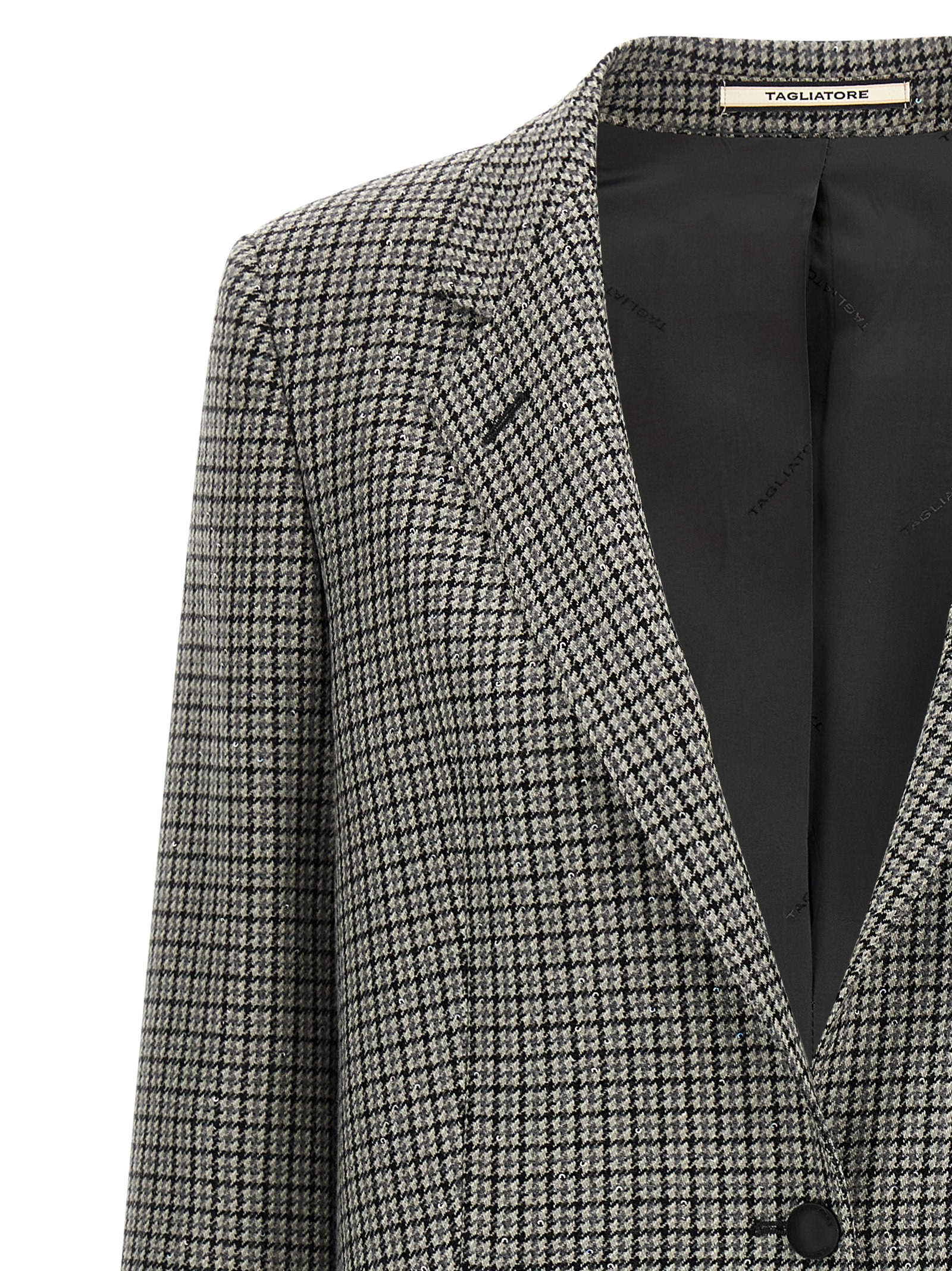 Wool blend blazer with micro-sequin houndstooth, slightly oversized fit, lapel neckline, shoulder straps, button closure, long sleeves with buttons.