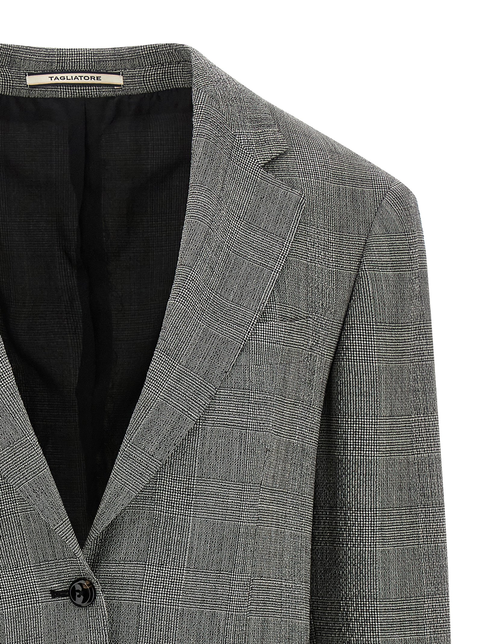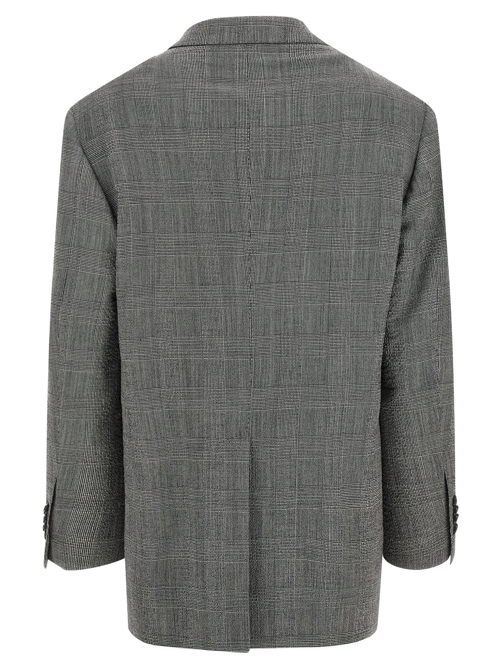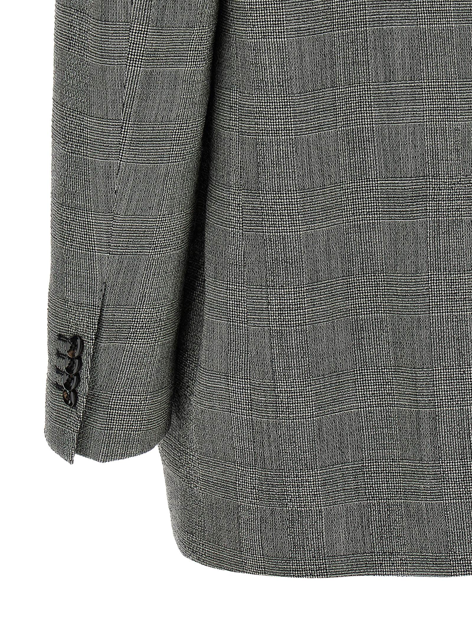 'Cecily' Prince of Wales patterned virgin wool single-breasted blazer with front horn button closure, mirror lapels, breast pocket, flap pockets, structured shoulder straps, long sleeves, back split, cupro lining.