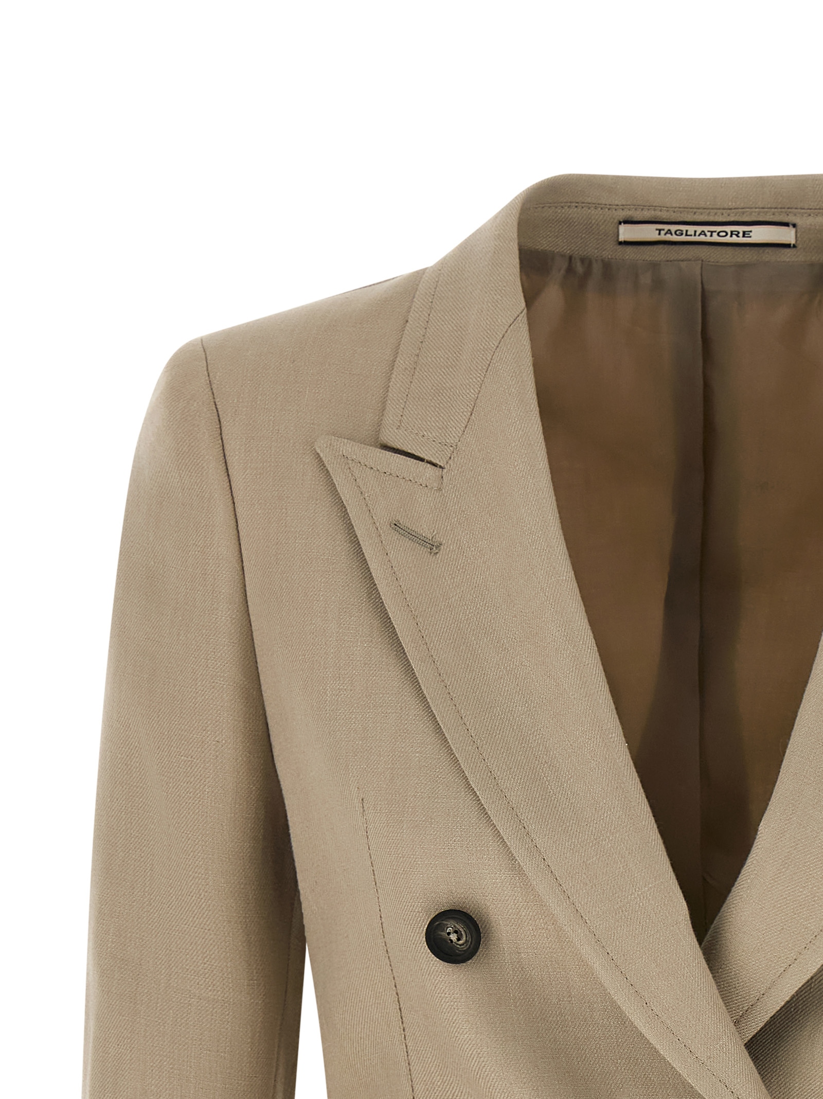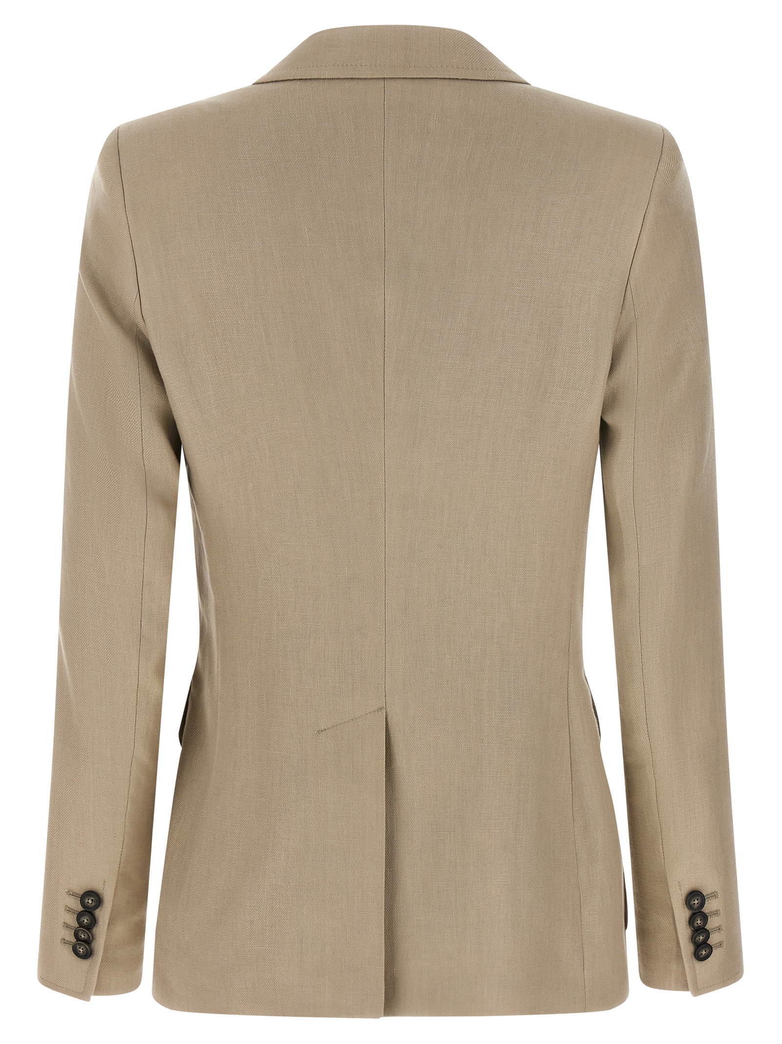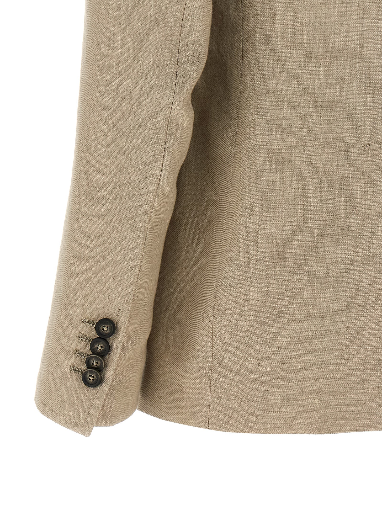 'Honey' double-breasted linen blazer with front horn button closure, peak lapels, breast pocket, Saharan-inspired pockets, padded shoulders, long sleeves, back split, cupro lining.