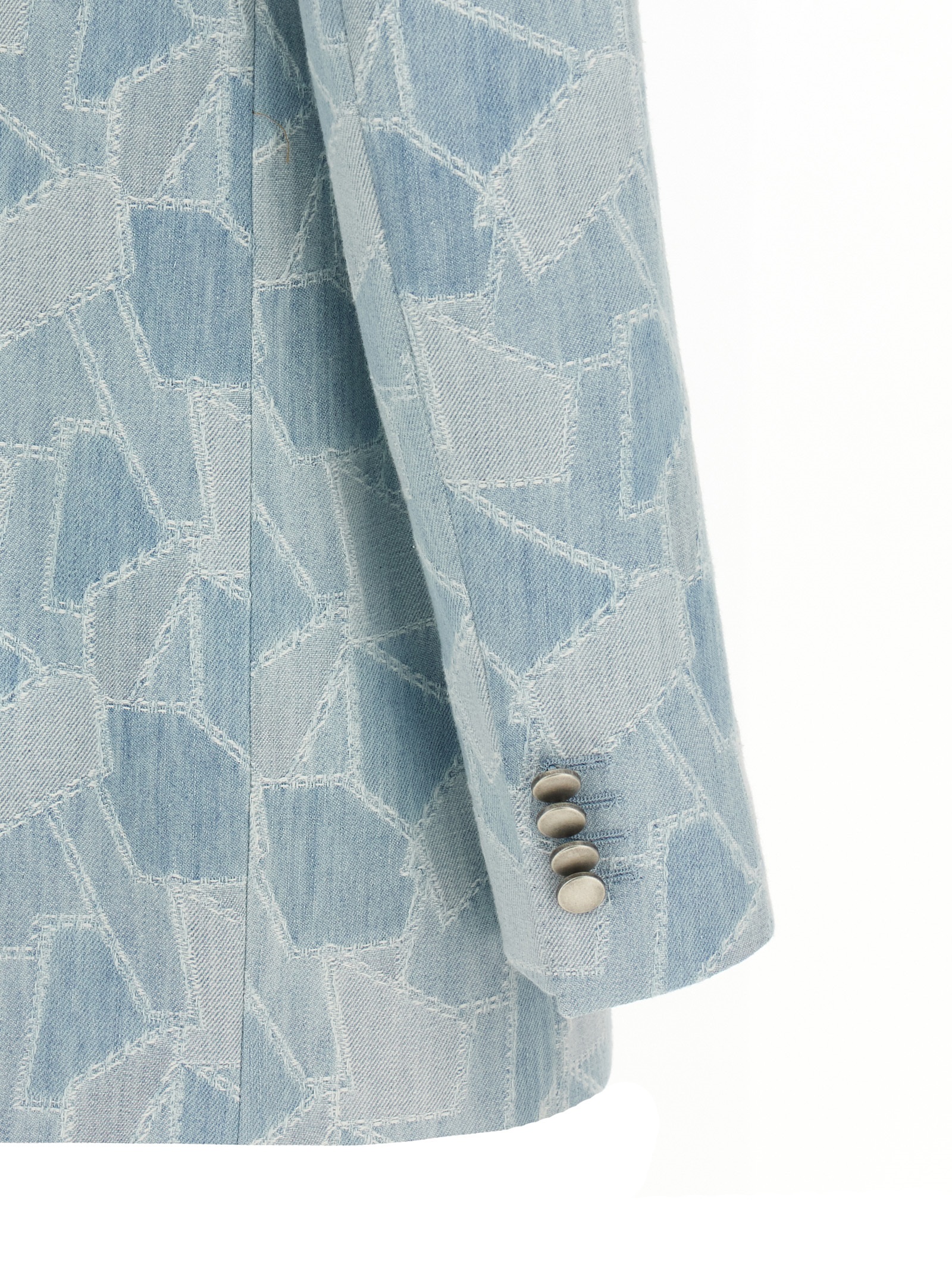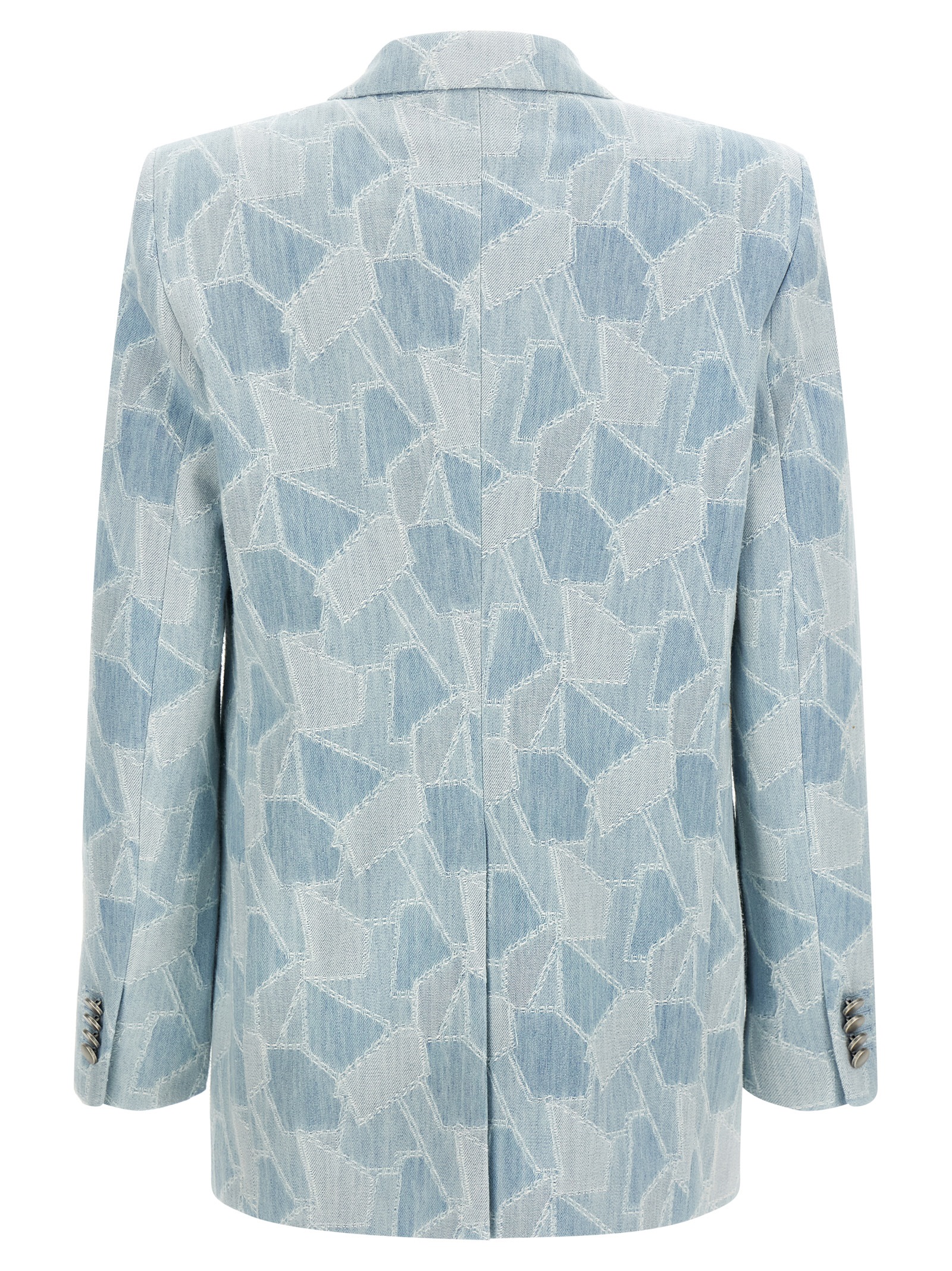 'Jasmine' double-breasted blazer in cotton denim with patchwork construction, front metal button closure, peak lapels, chest pocket, flap pockets, structured shoulder strap, long sleeves, back split, cupro lining.