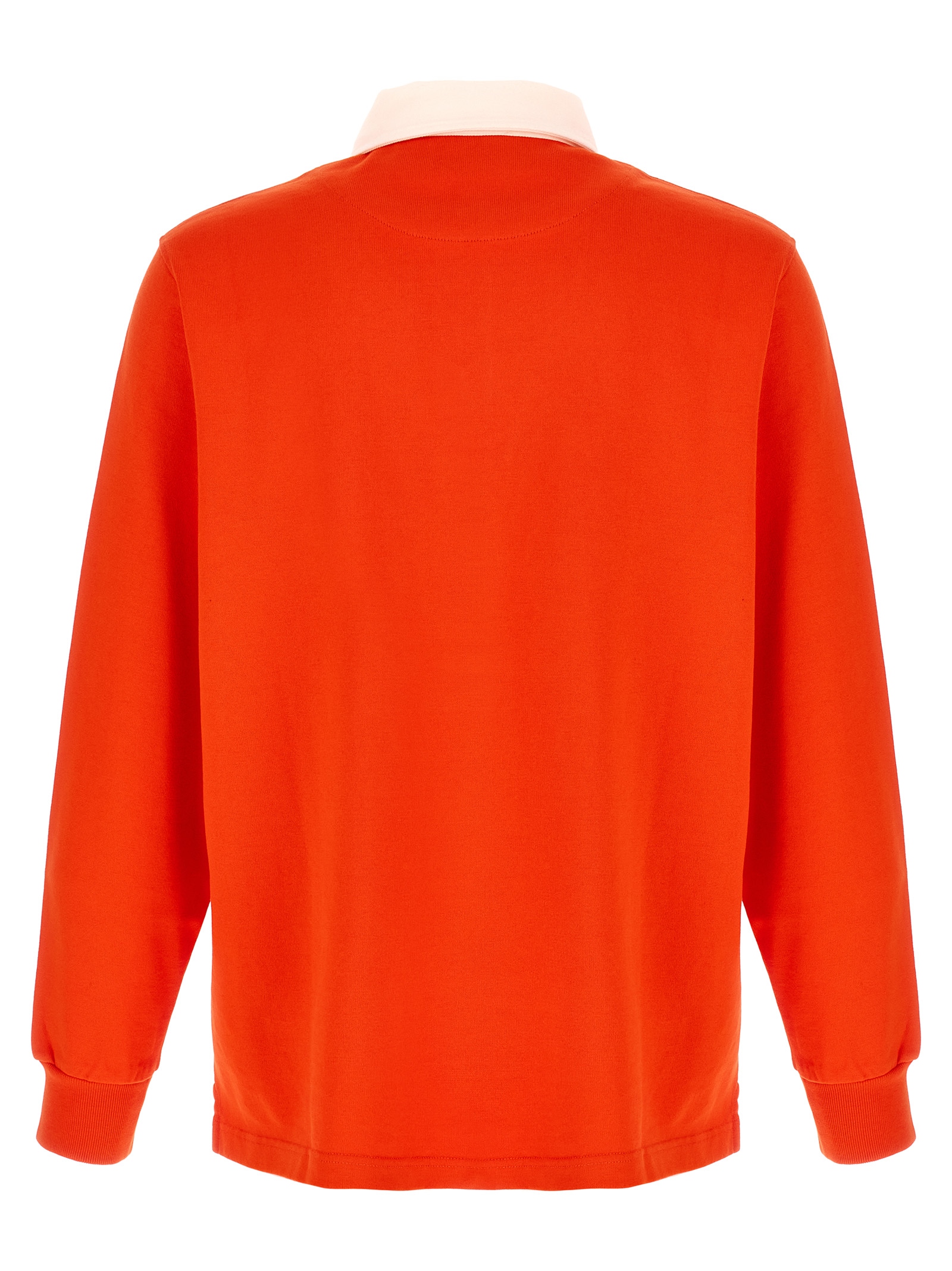 Cotton jersey polo shirt with satin stitch 'Super Speed' embroidery, rugby model, contrast cotton twill collar and buttons, long cuffed sleeves.