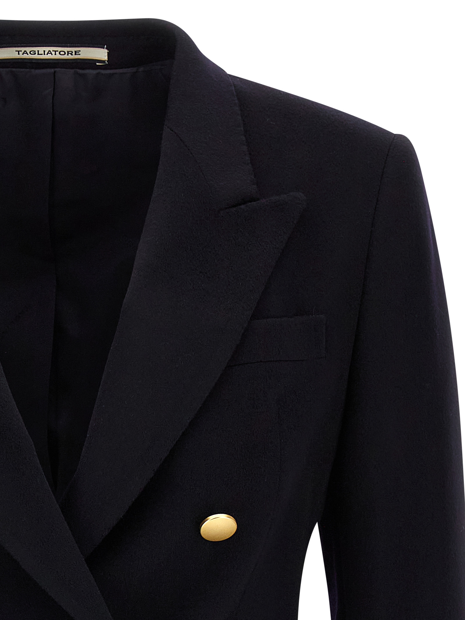 'Parigi' double-breasted cashmere blazer with front metal button closure, peak lapels, breast pocket, flap pockets, structured shoulder straps, long sleeves, back split, monogram cupro lining.
