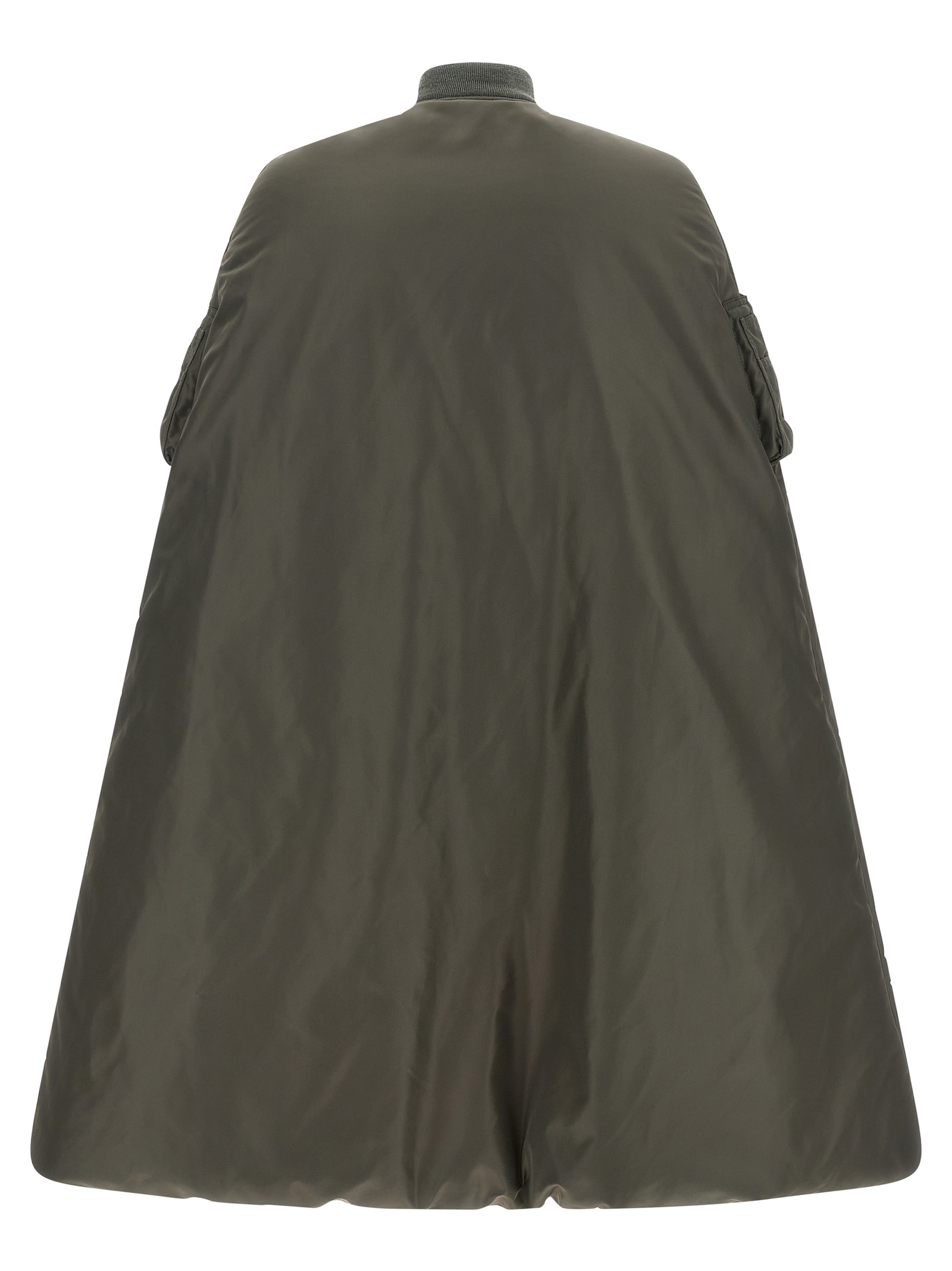 Long padded nylon cape with stretch wool knit details, bomber jacket-inspired pattern, contrast lining, front zip closure, side zip to let your arms pass.