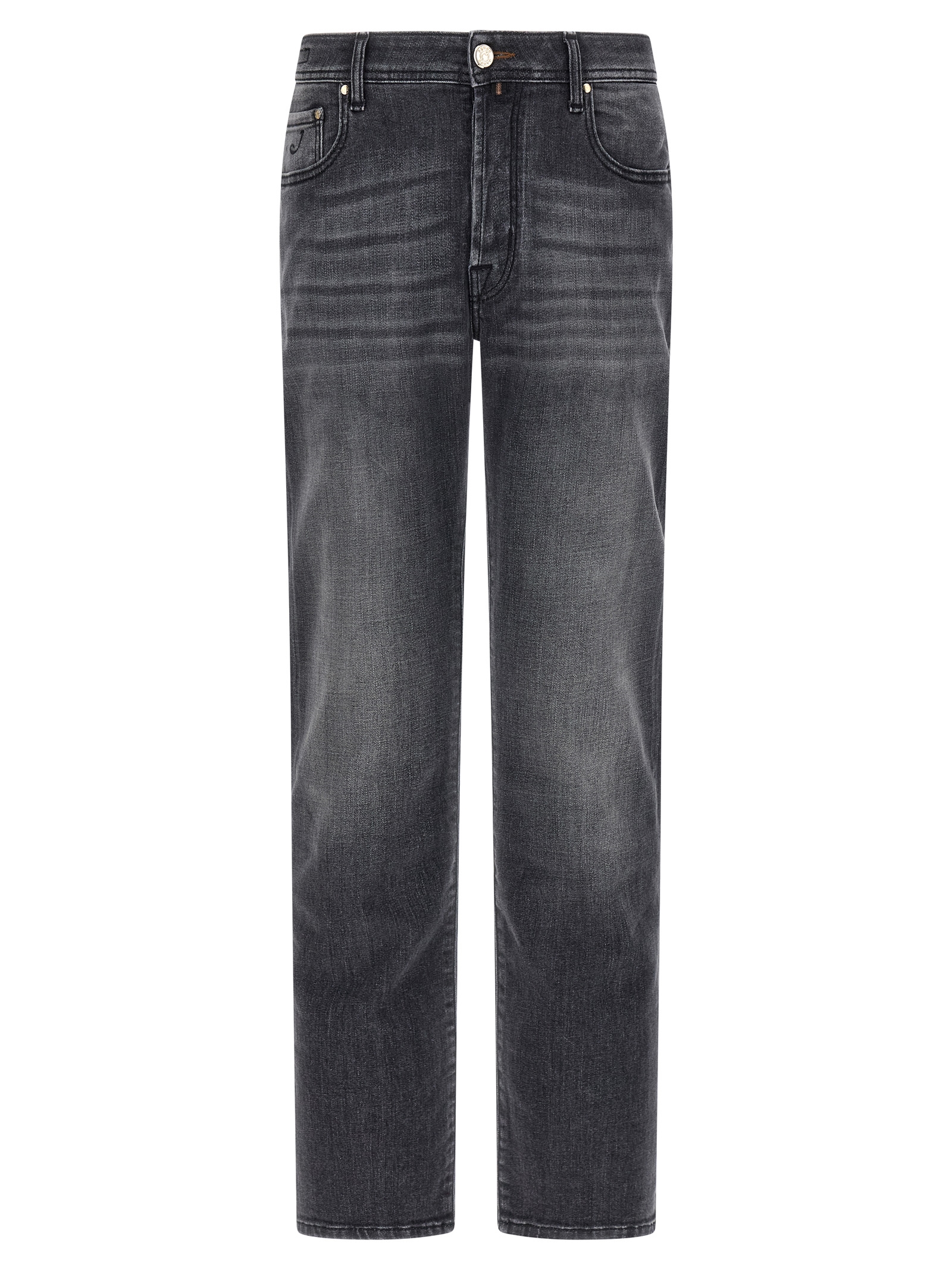 'Bard' vintage effect stretch cotton denim jeans with rinse wash, mid waist, front button closure, five pockets, back leather logo tag.