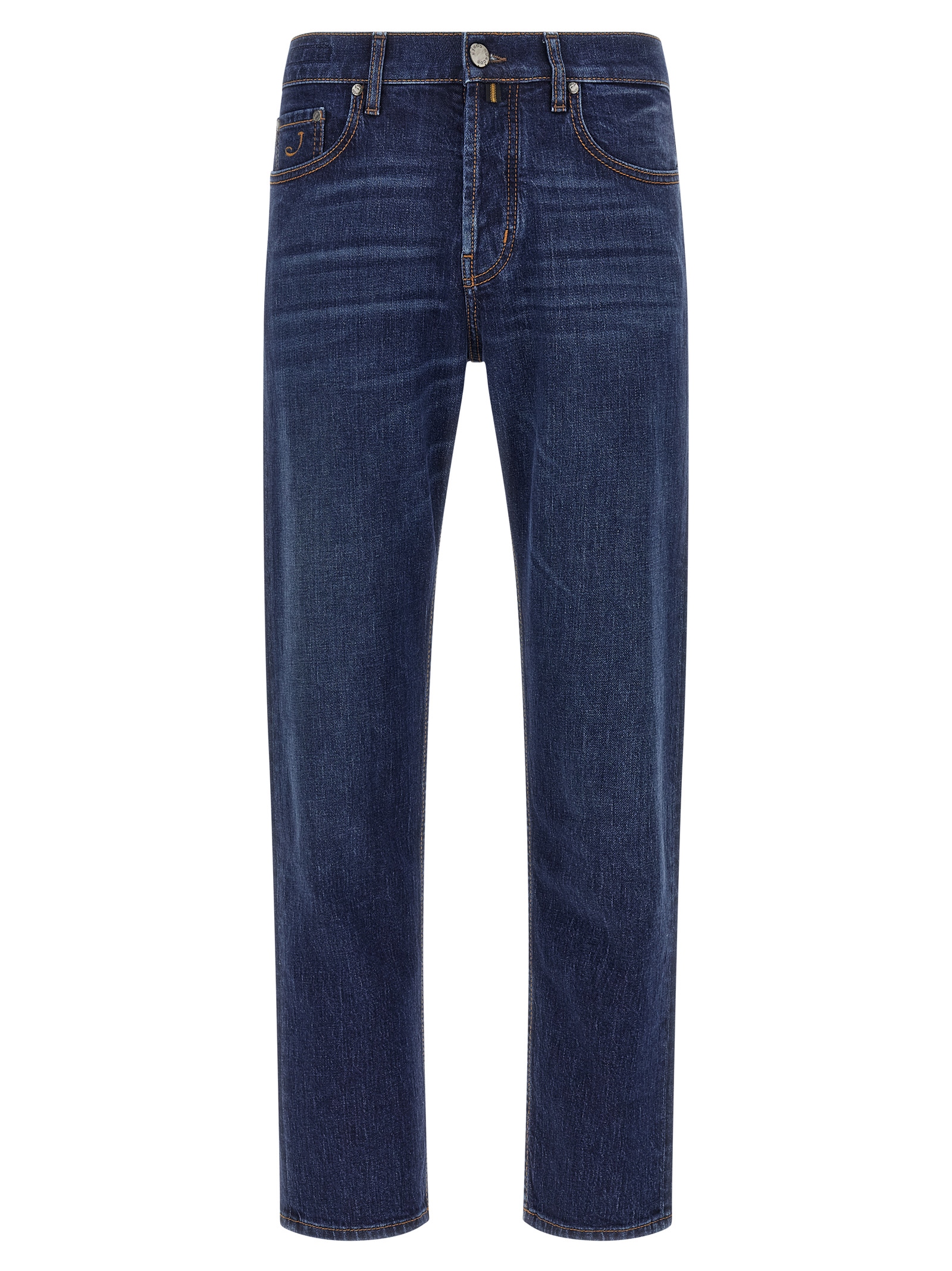 'Jude' cotton denim jeans with enzyme wash and bleach treatment, whiskering and finishing, contrast stitching, crop model, tapered leg, low crotch, five pockets, front button closure, back suede logo tag. With bandana geometric print and wire spool.