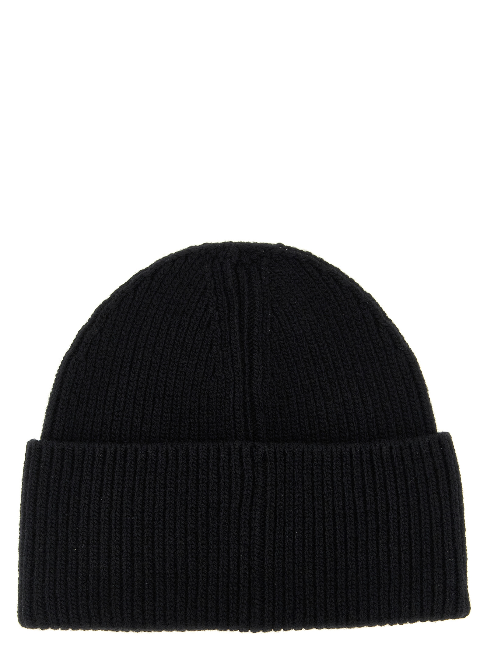 Knitted wool beanie with turn-up front logo patch.