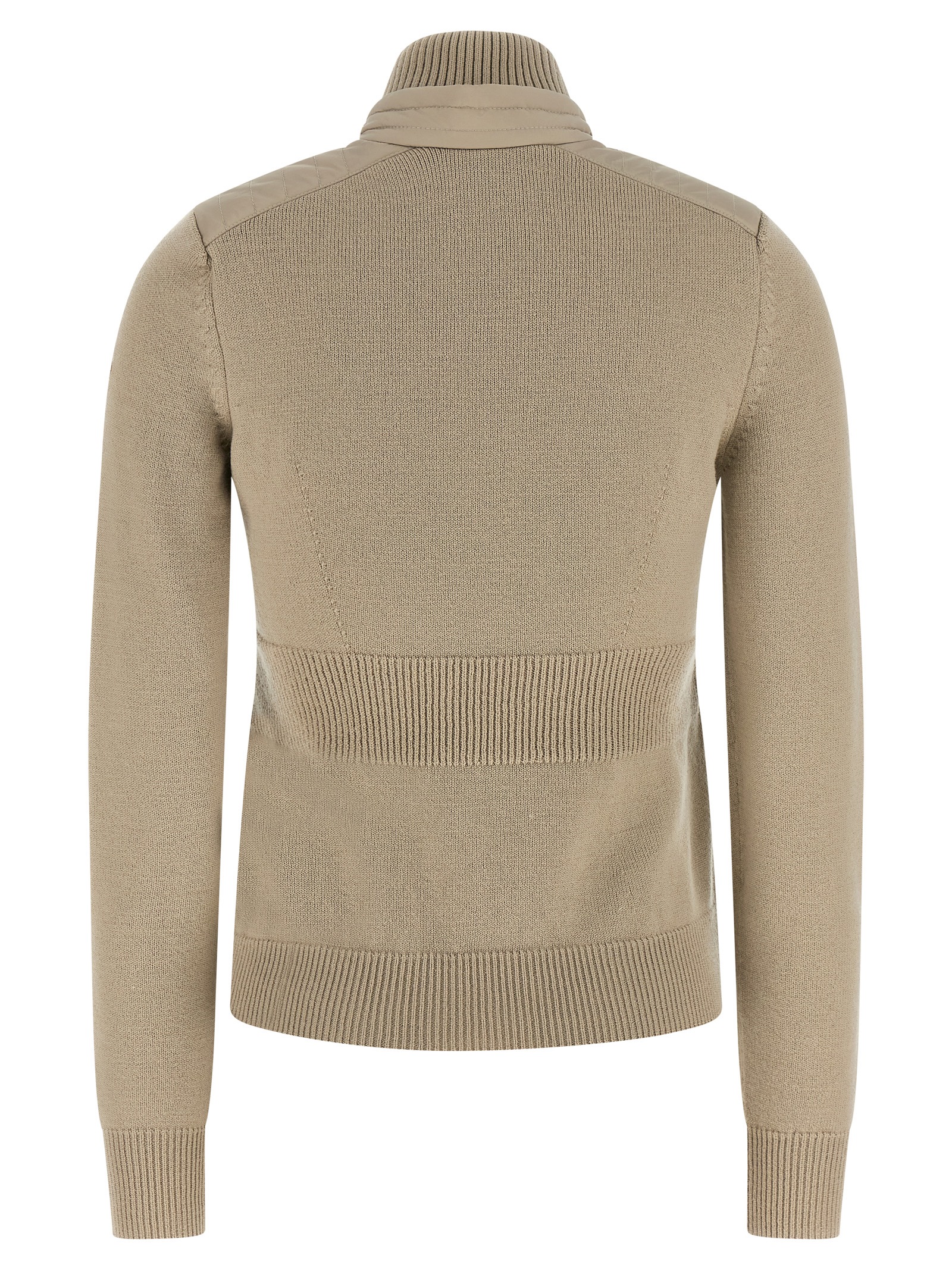 Кардиган из эластичной шерстяной смеси с микрорипстоп-вставкой спереди и наполнителем из гусиного пуха, двойным высоким воротником, застежкой на молнию и кнопки спереди, длинными рукавами с манжетами и нашивкой с логотипом.