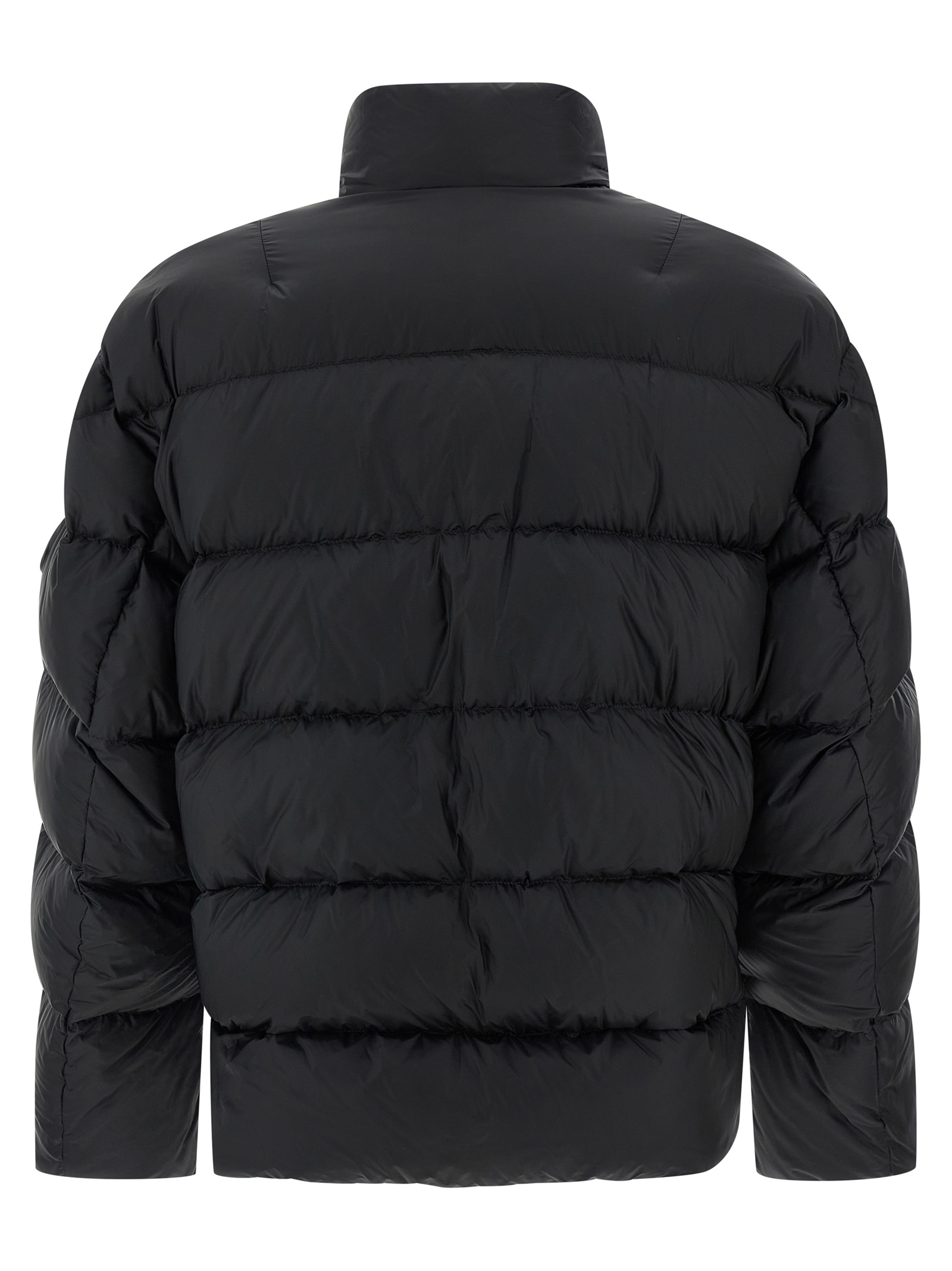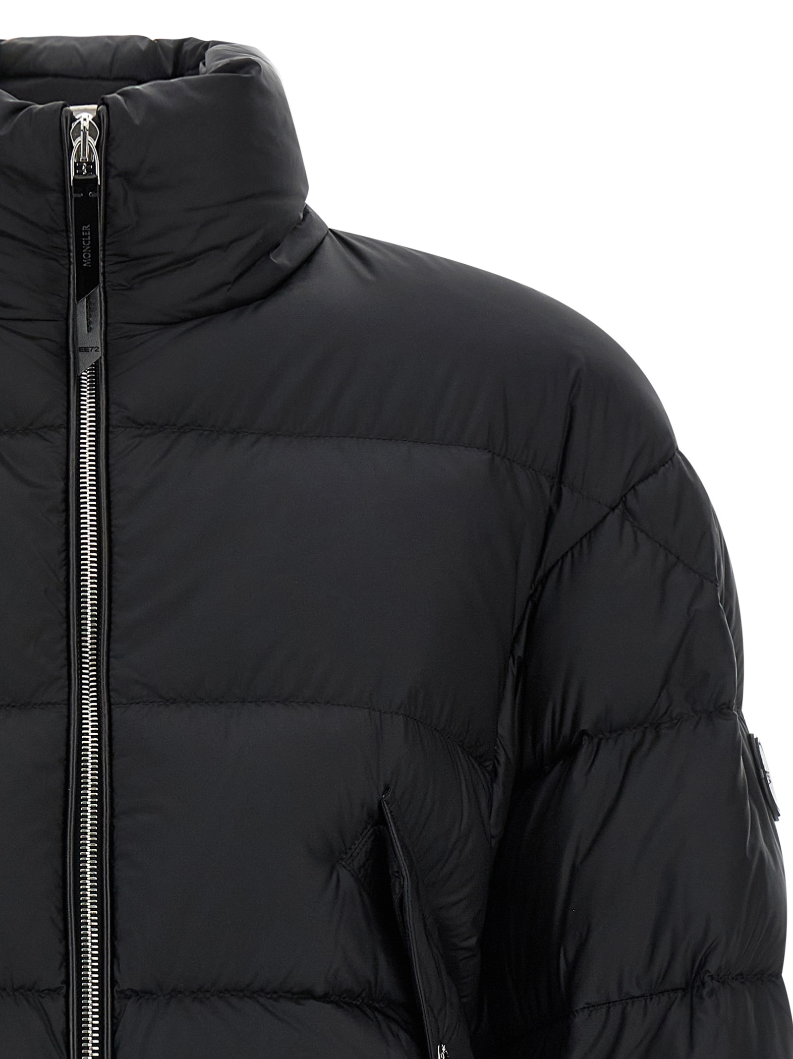 Moncler x Edward Enninful 'Blas' quilted nylon jacket with goose down padding, flared silhouette, high neck, front zip closure, pockets, long sleeves with elastic cuffs and tone-on-tone logo patch appliqué, side slits with snap buttons, drawstring on asymmetrical hem. Removable inner backpack braces to carry the garment without using your hands.