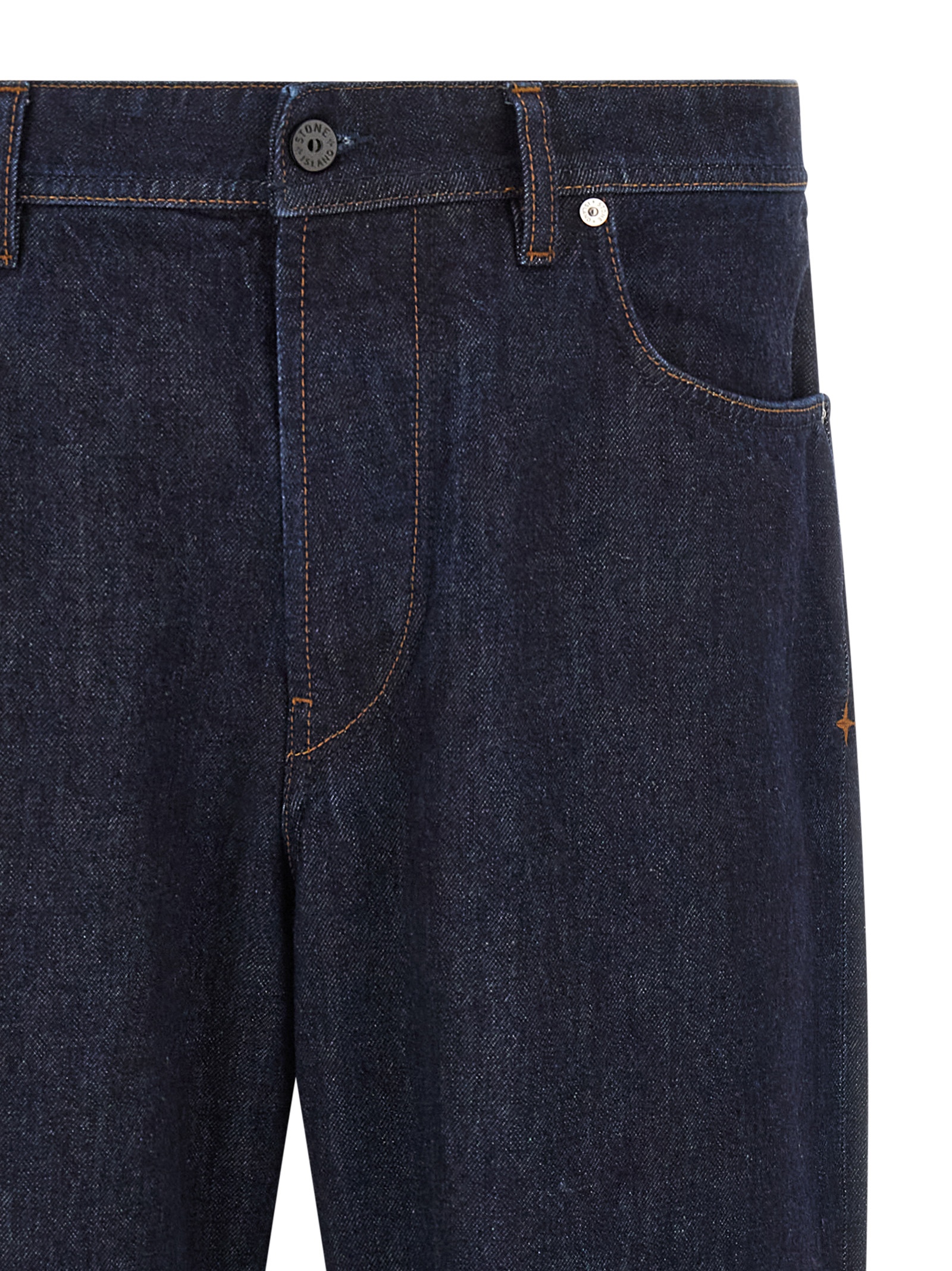 'Indigo Denim-Rinsed' jeans in garment-dyed cotton denim with contrast stitching, straight leg, front button closure, five pockets, logo badge applied at the back. SUSTAINABLE: This product is made of organic cotton.