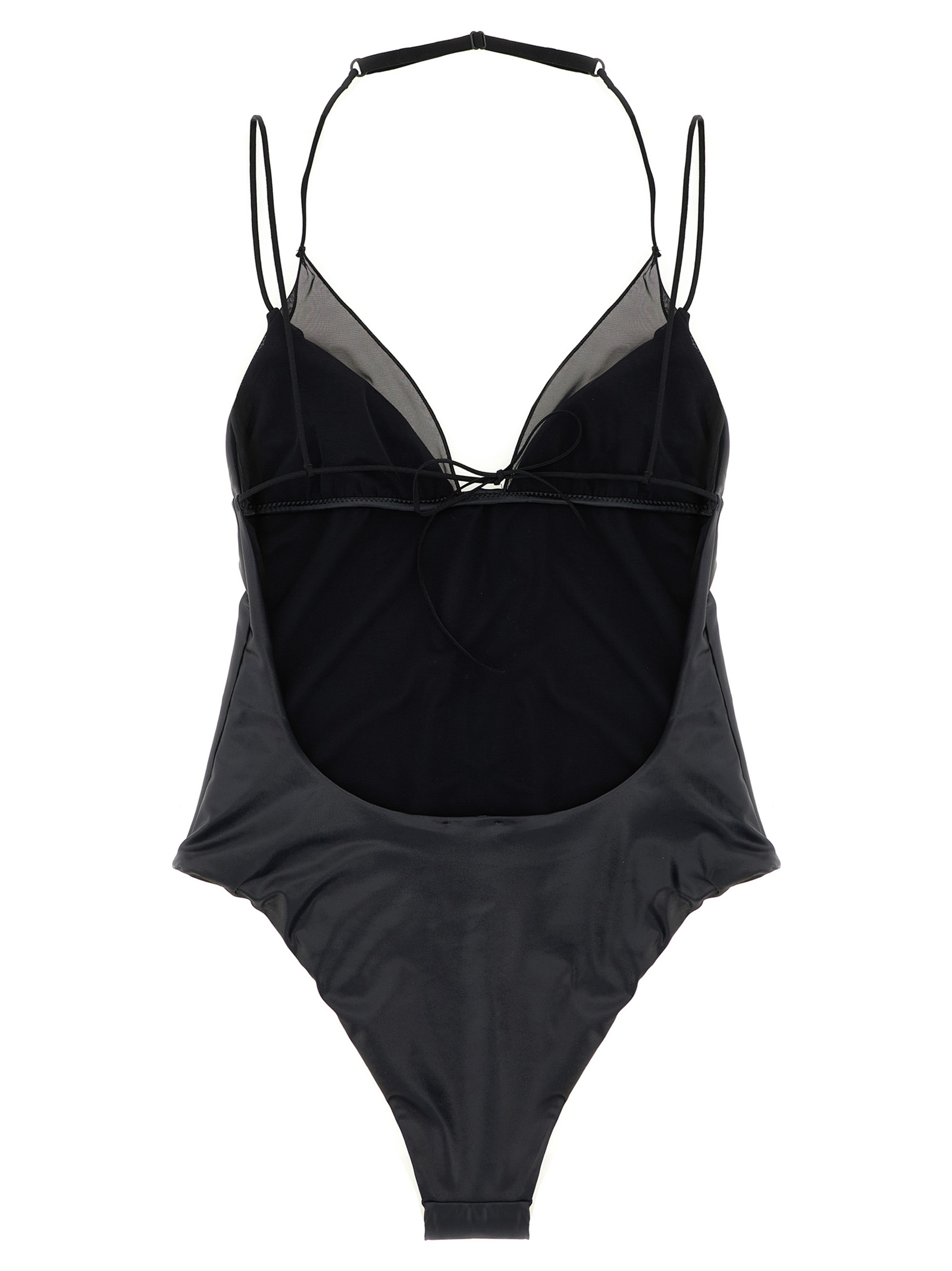 'Kate' satin lycra one-piece swimsuit with double layer triangle model with semi-transparent tulle layer underneath with adjustable shoulder strap behind the neck, thin straps, bare back with tie at the back, briefs with medium coverage.