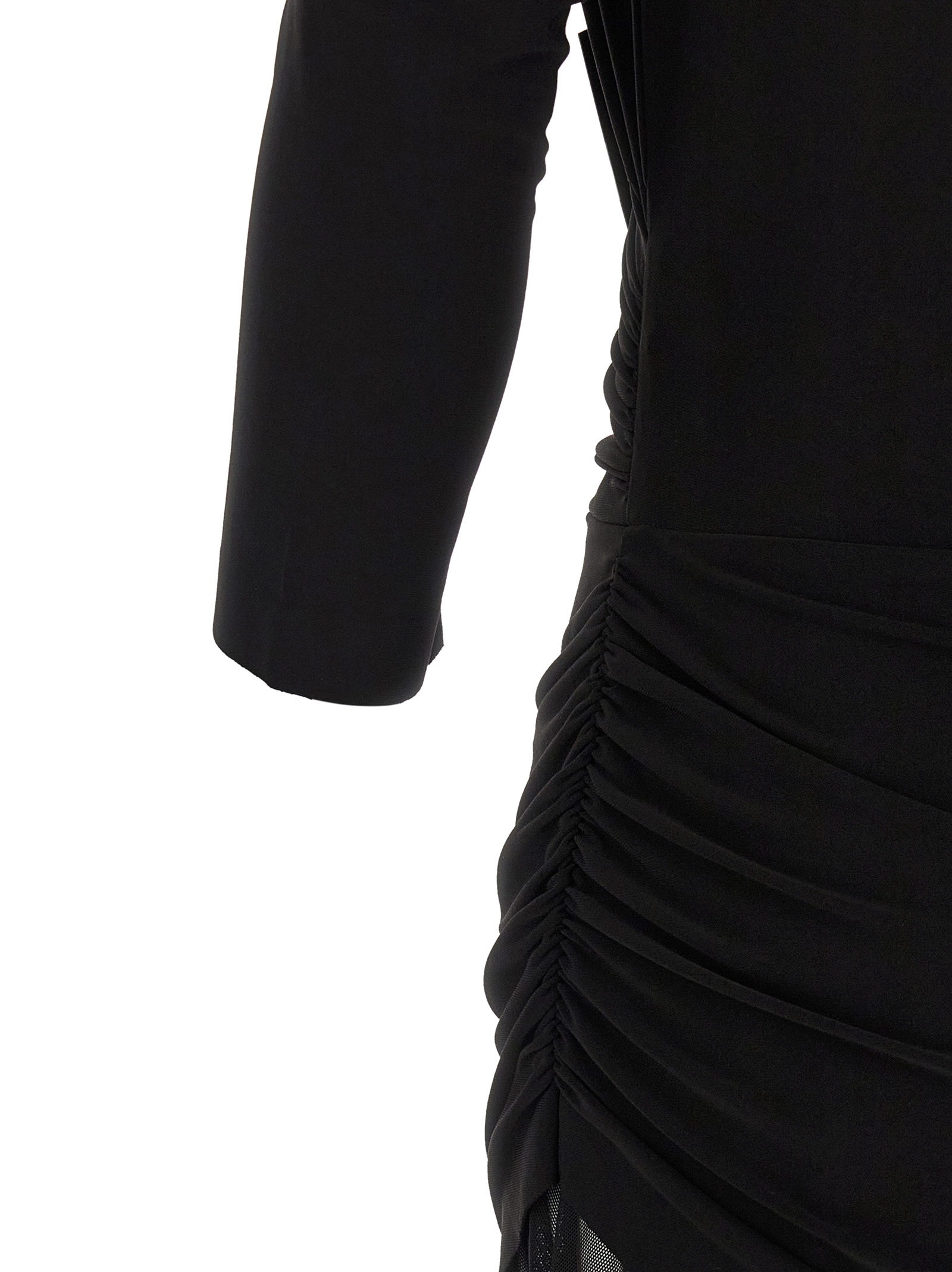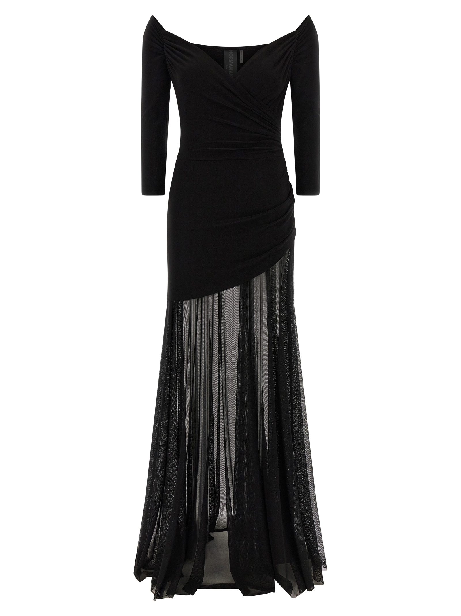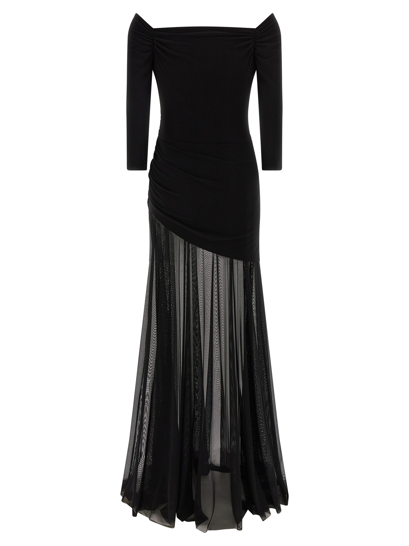 Dress composed of Poly Lycra 4-way stretch bodysuit, off-the-shoulder model with sweetheart neckline, 3/4 sleeves, front and back curls, asymmetrical hem and semi-transparent mesh maxi skirt, flared line.