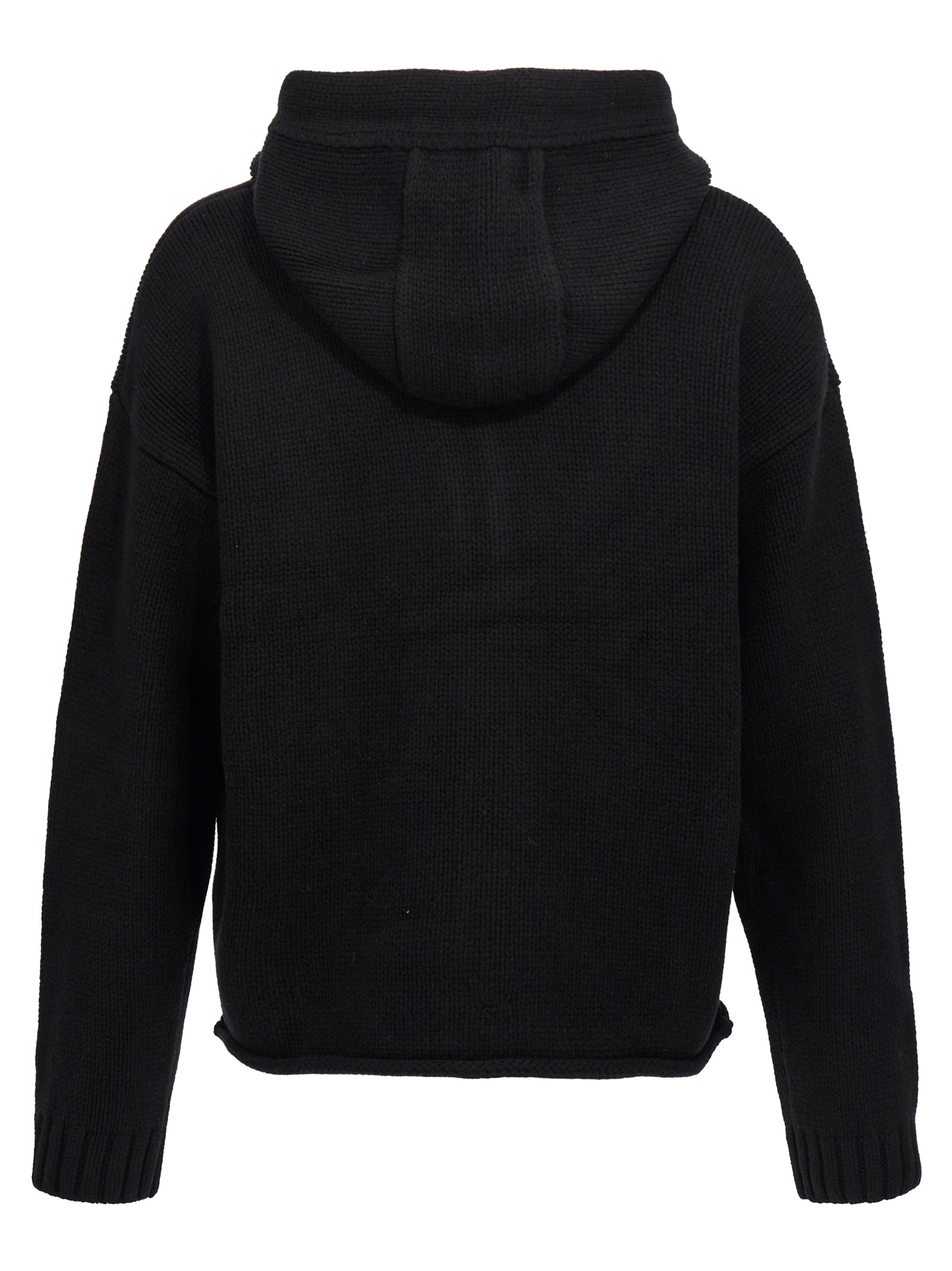 Wool knit hoodie with front chenille 'Anchor JWA' logo, zip closure, long sleeves.