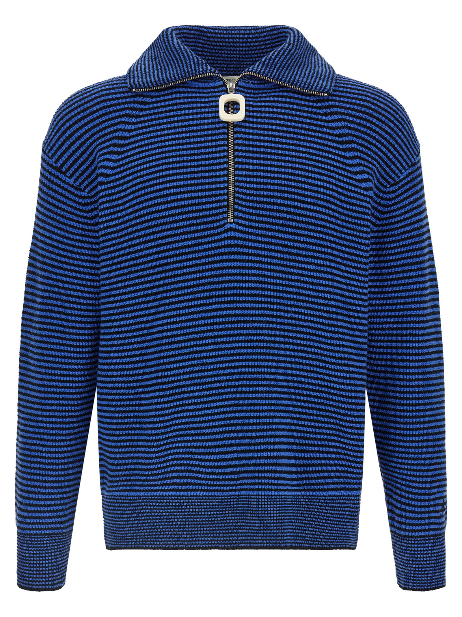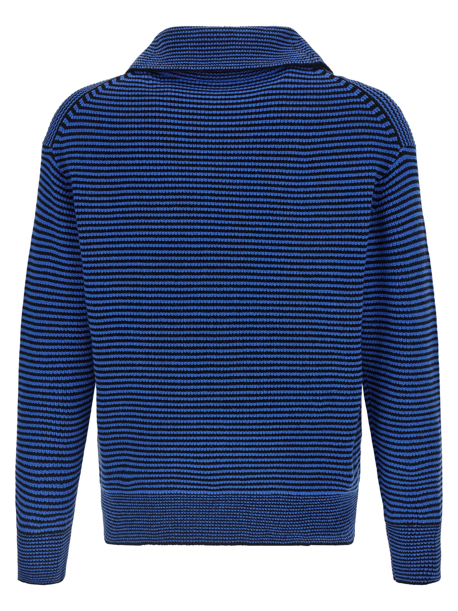 Knitted striped wool and cotton blend sweater, high neck, half zip with acetate puller, long cuffed sleeves, logo embroidery and dropped shoulders. SUSTAINABLE: Product made from organic cotton and recycled polyester.
