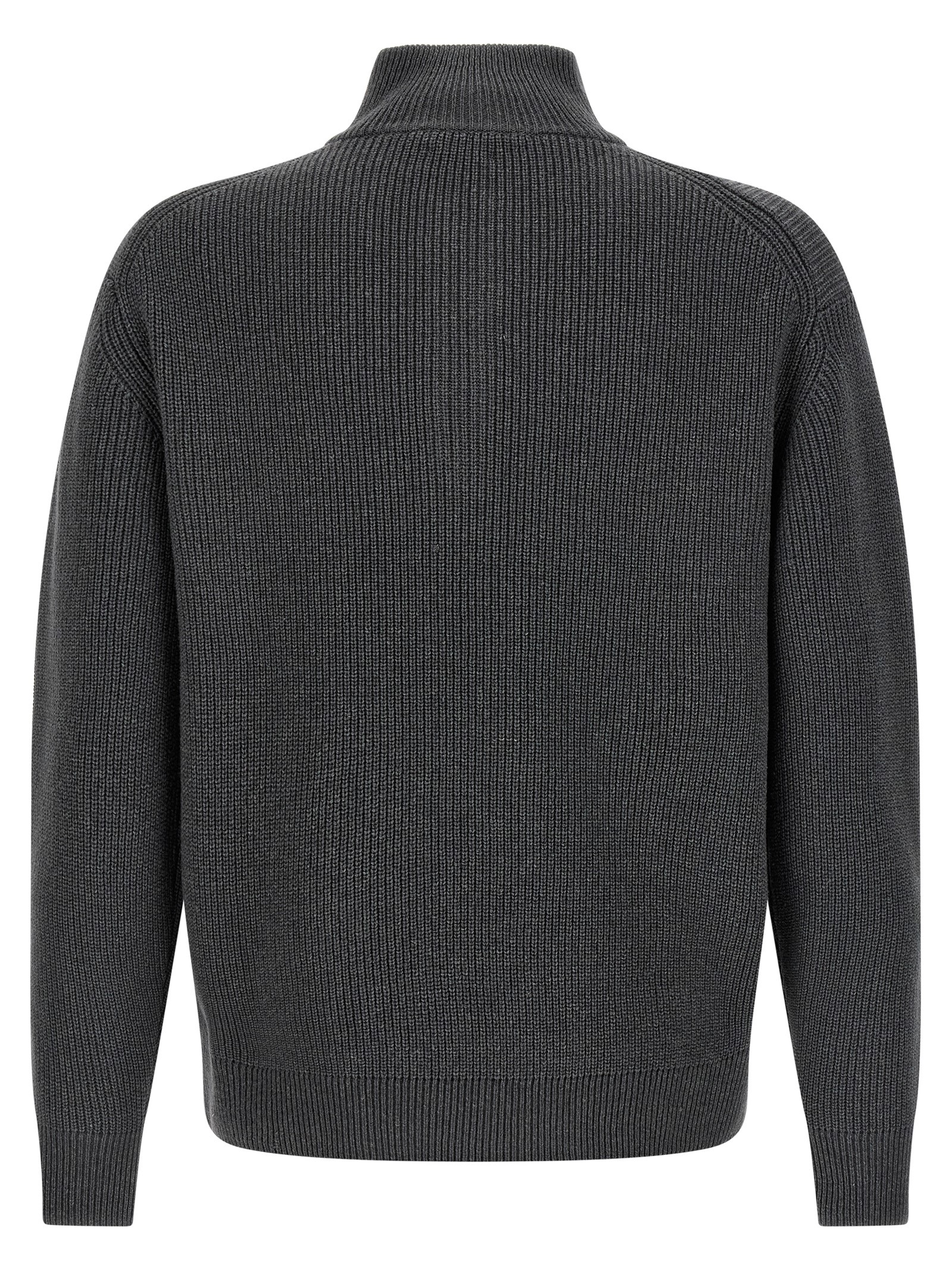 Wool and cotton knit medium weight yarn sweater, high neck, half-zip with oval zipper with horn-effect finish and engraved logo, long cuffed sleeves.