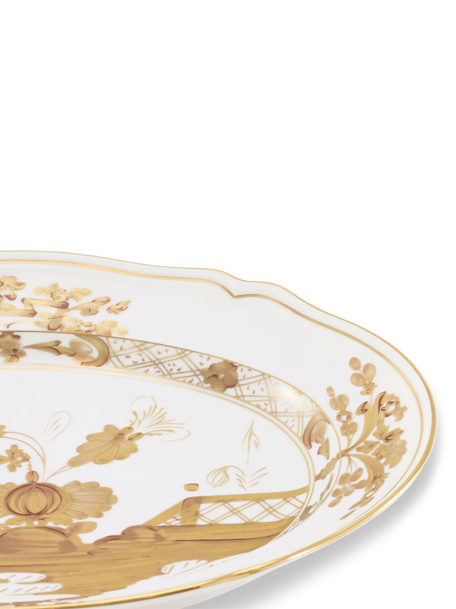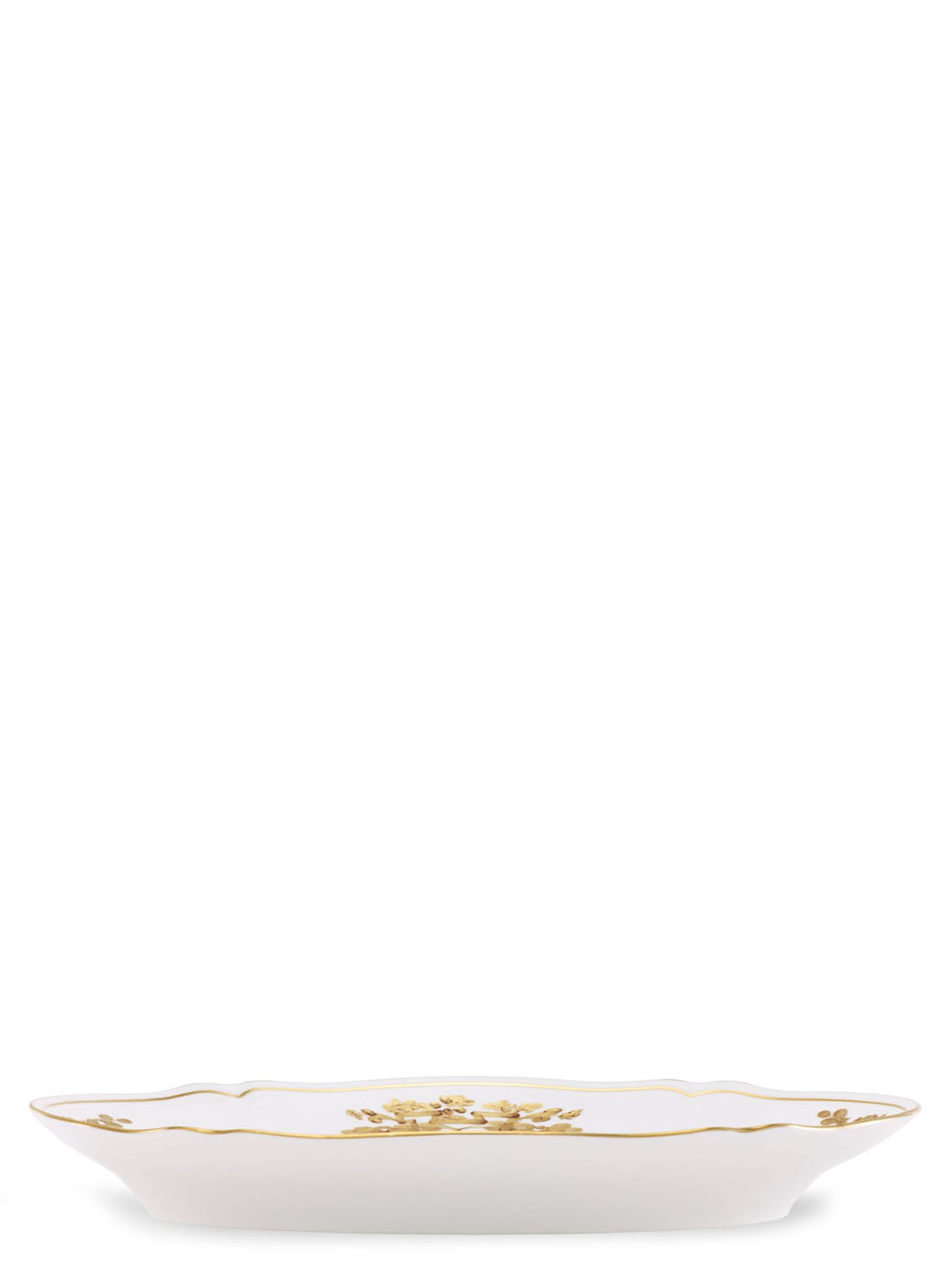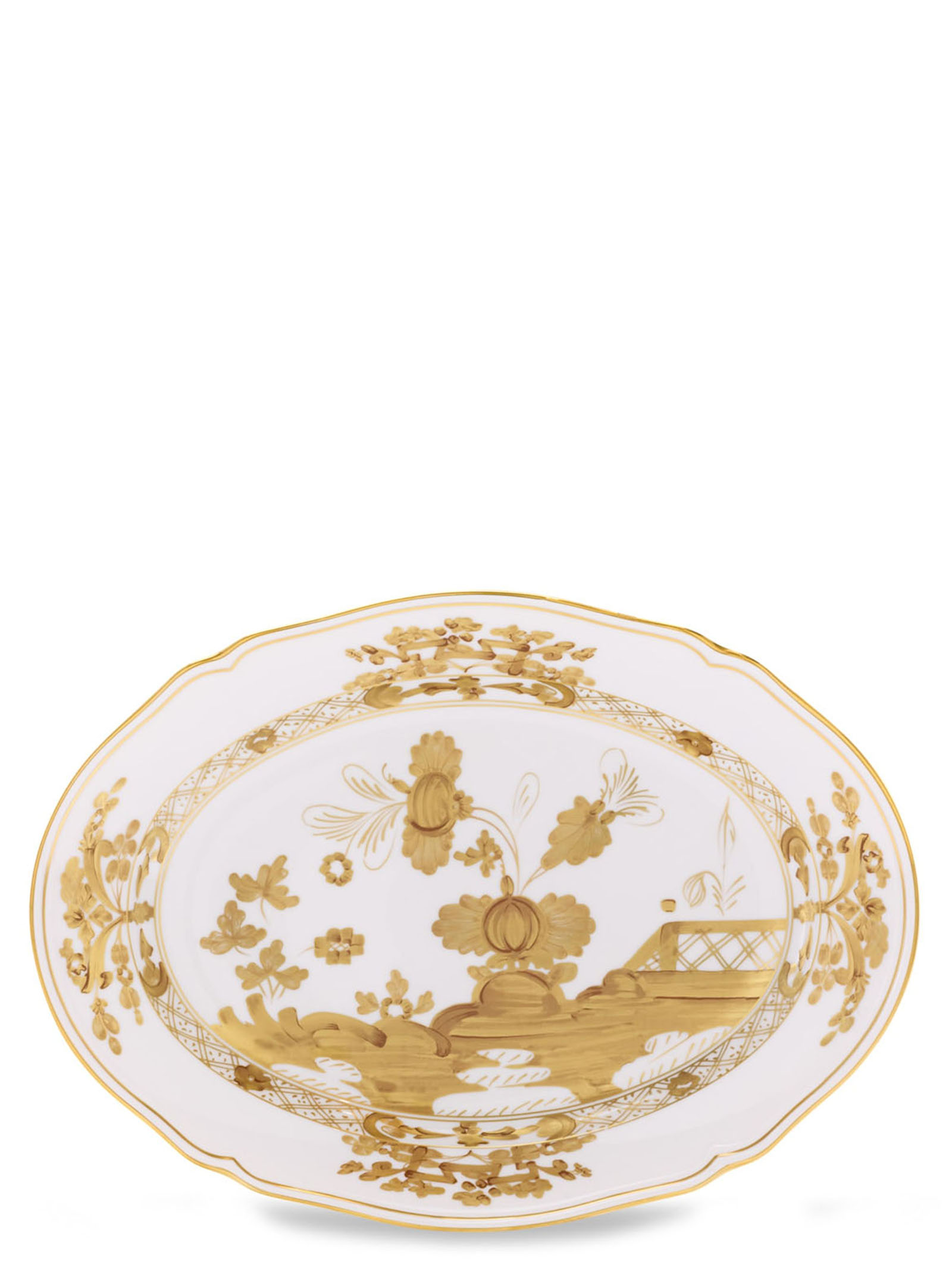 Oval serving plate with white Aurum decoration and gold thread. 'Oriente Italiano' collection. Not suitable for microwave. Dishwasher safe with gentle cycle.