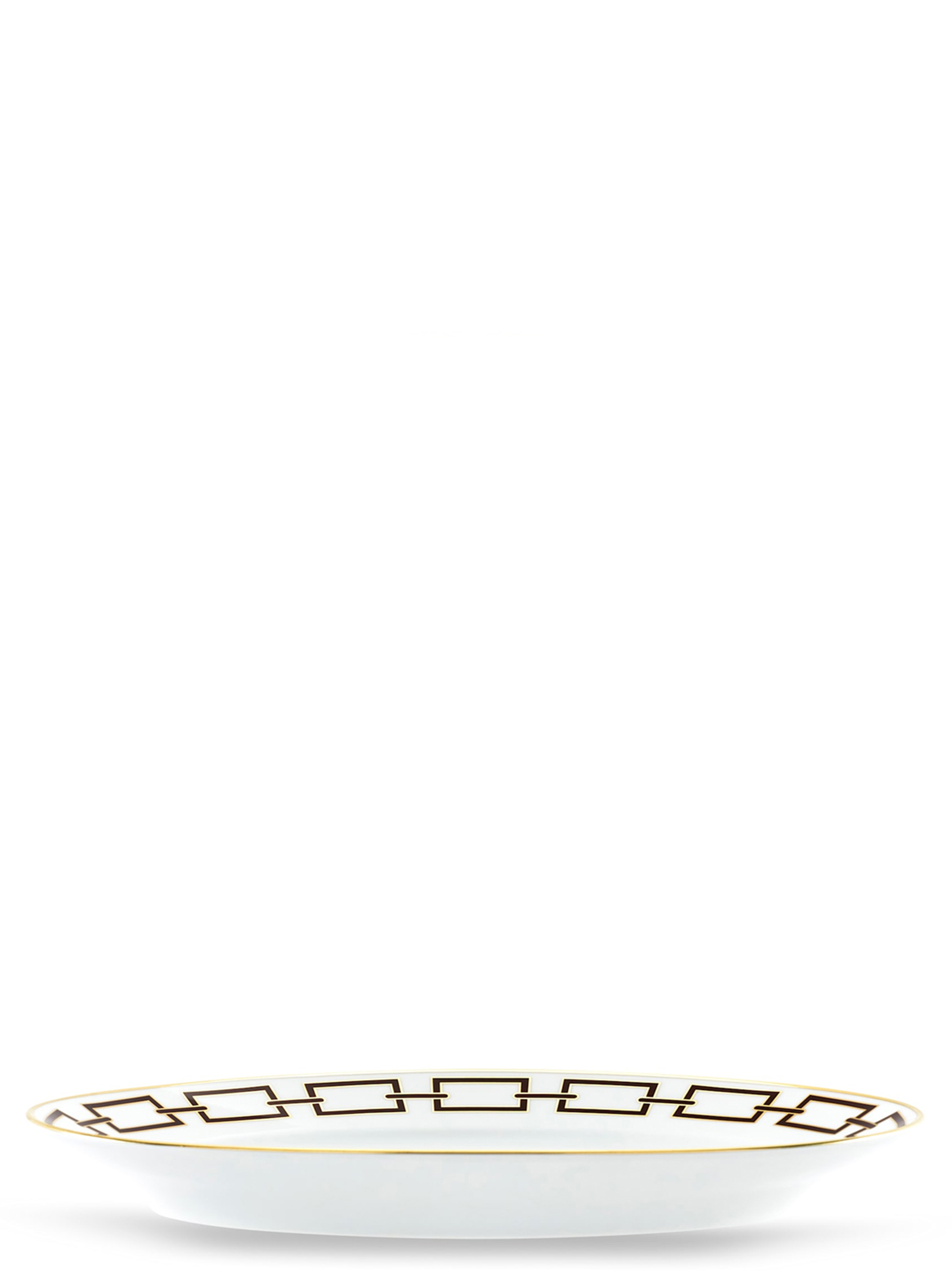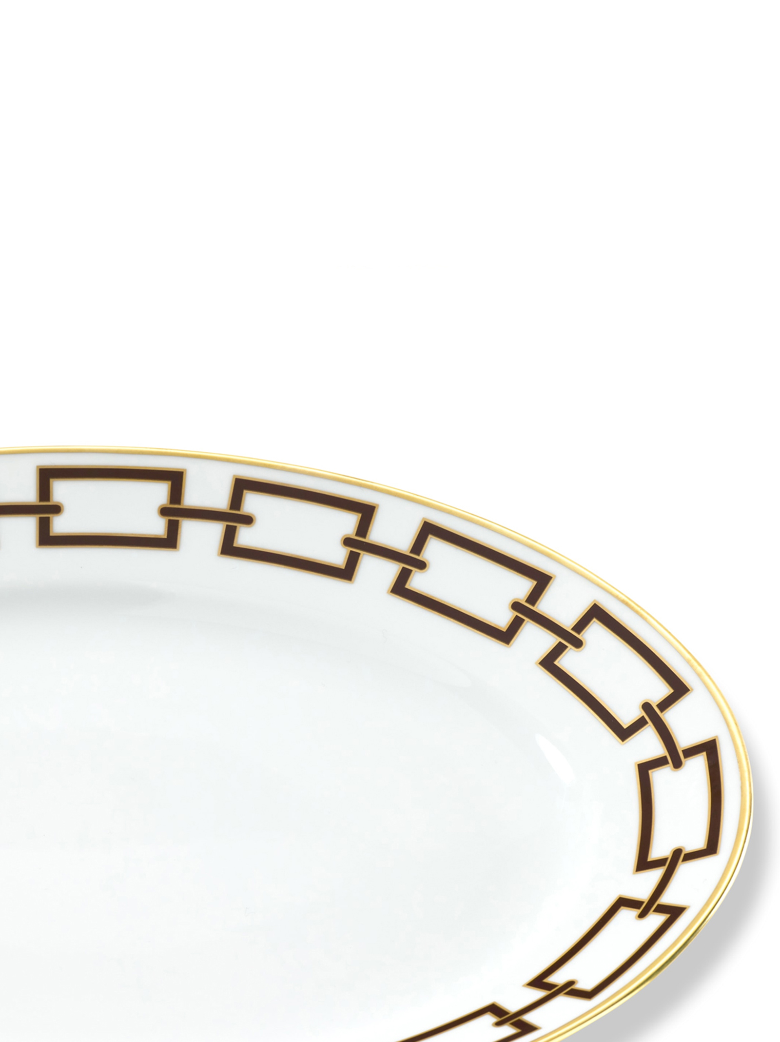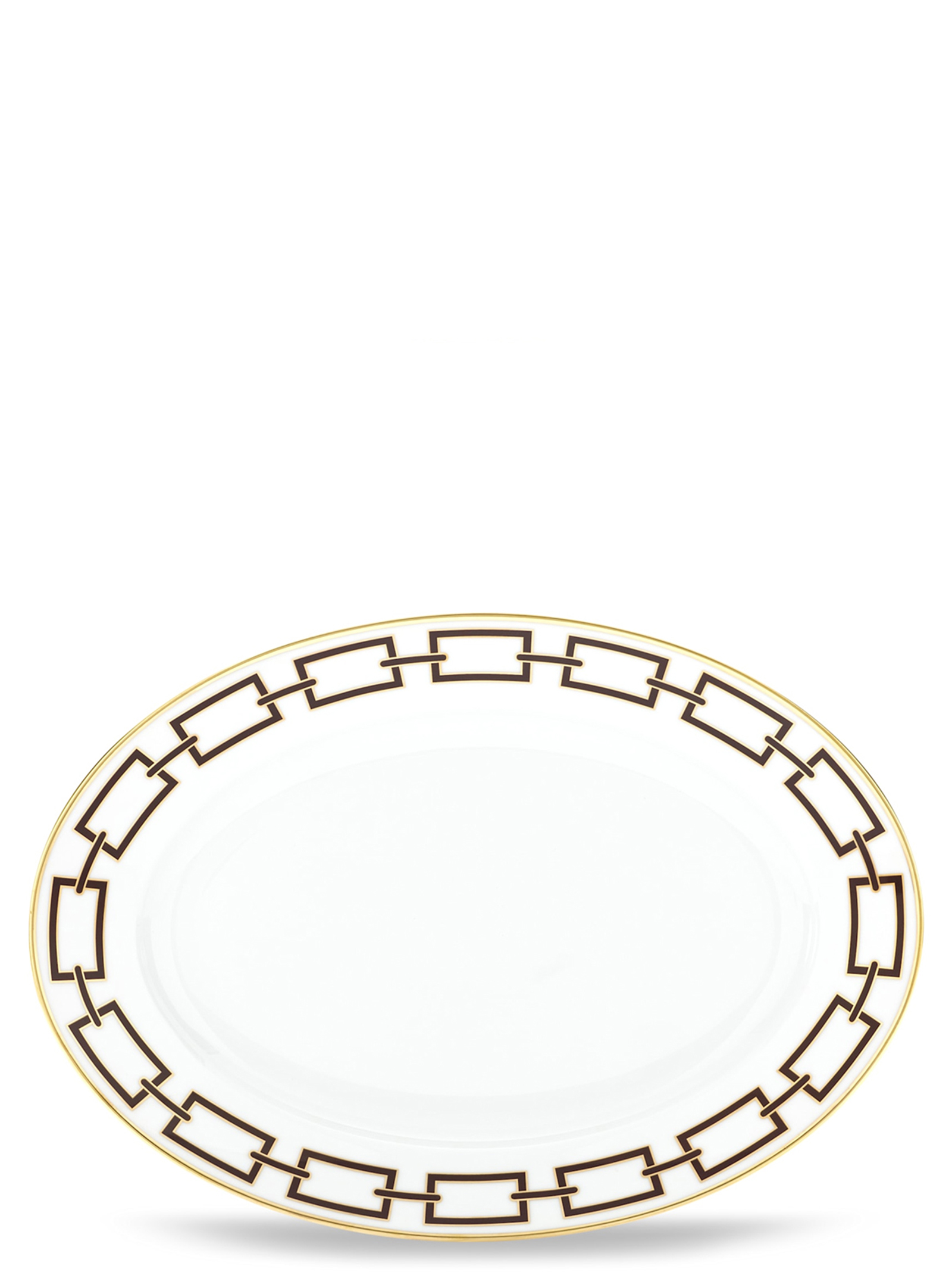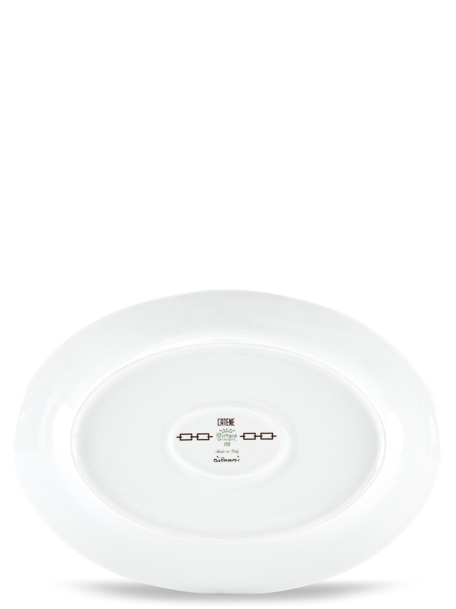Oval porcelain tray with brown Ebony decoration and gold thread. 'Catene' collection by Gio Ponti. Not suitable for microwave. Dishwasher safe with gentle cycle.