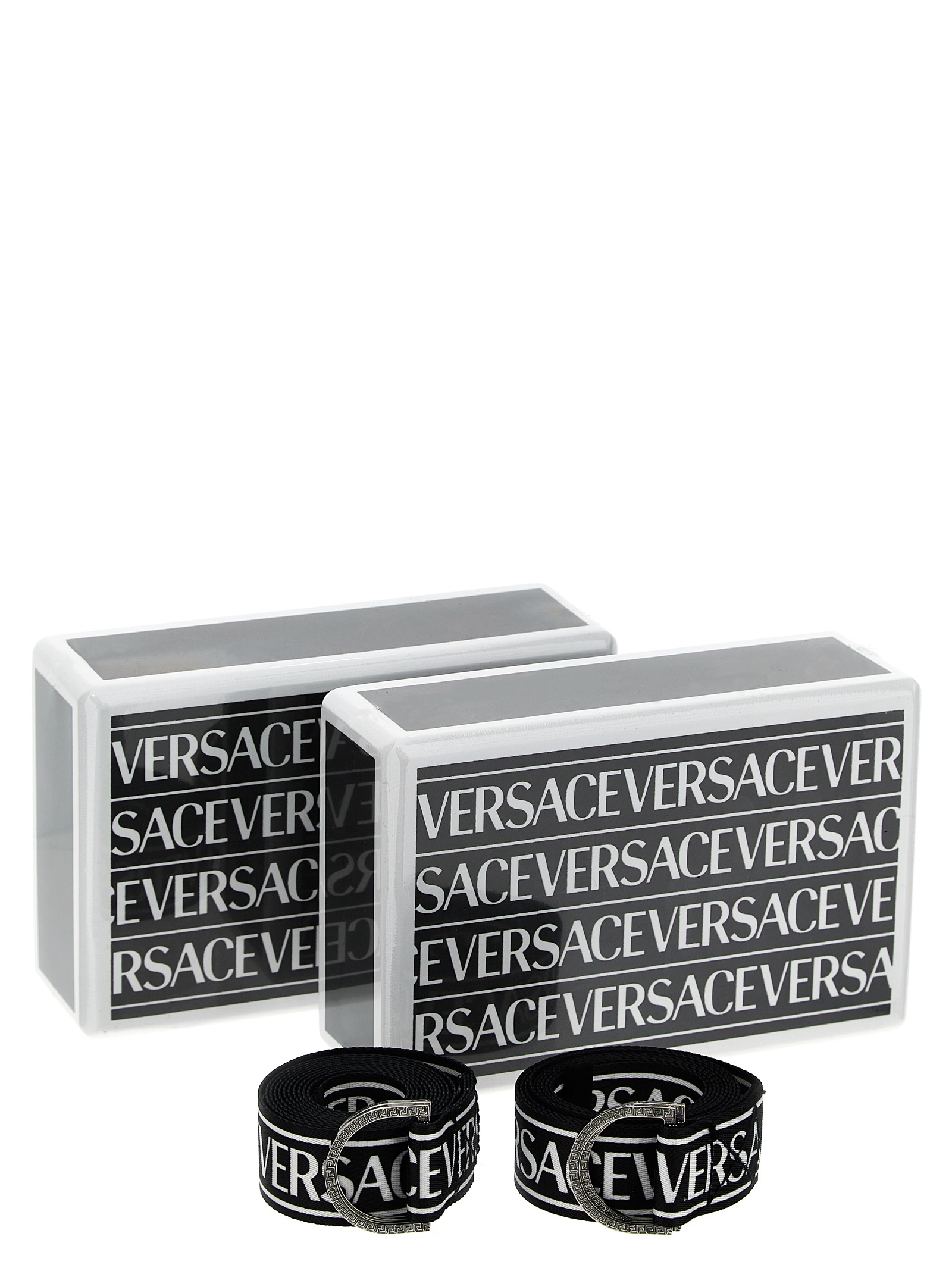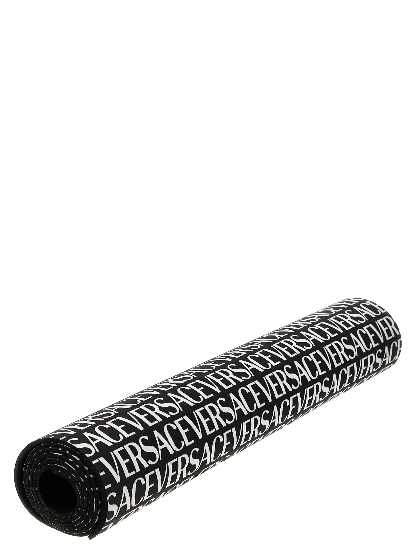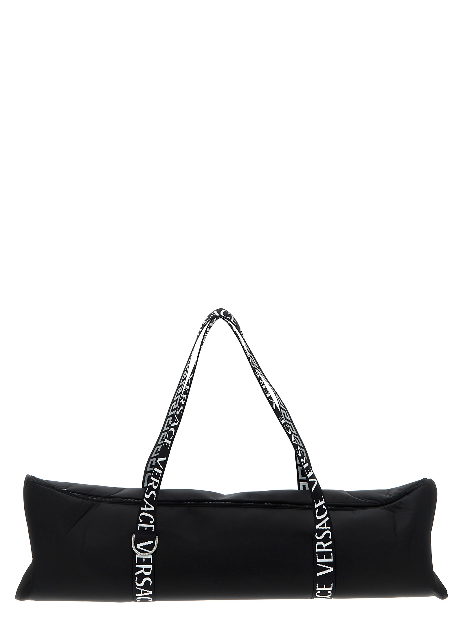 Versace Allover nylon duffel bag with yoga mat, two blocks, and two straps inside.
