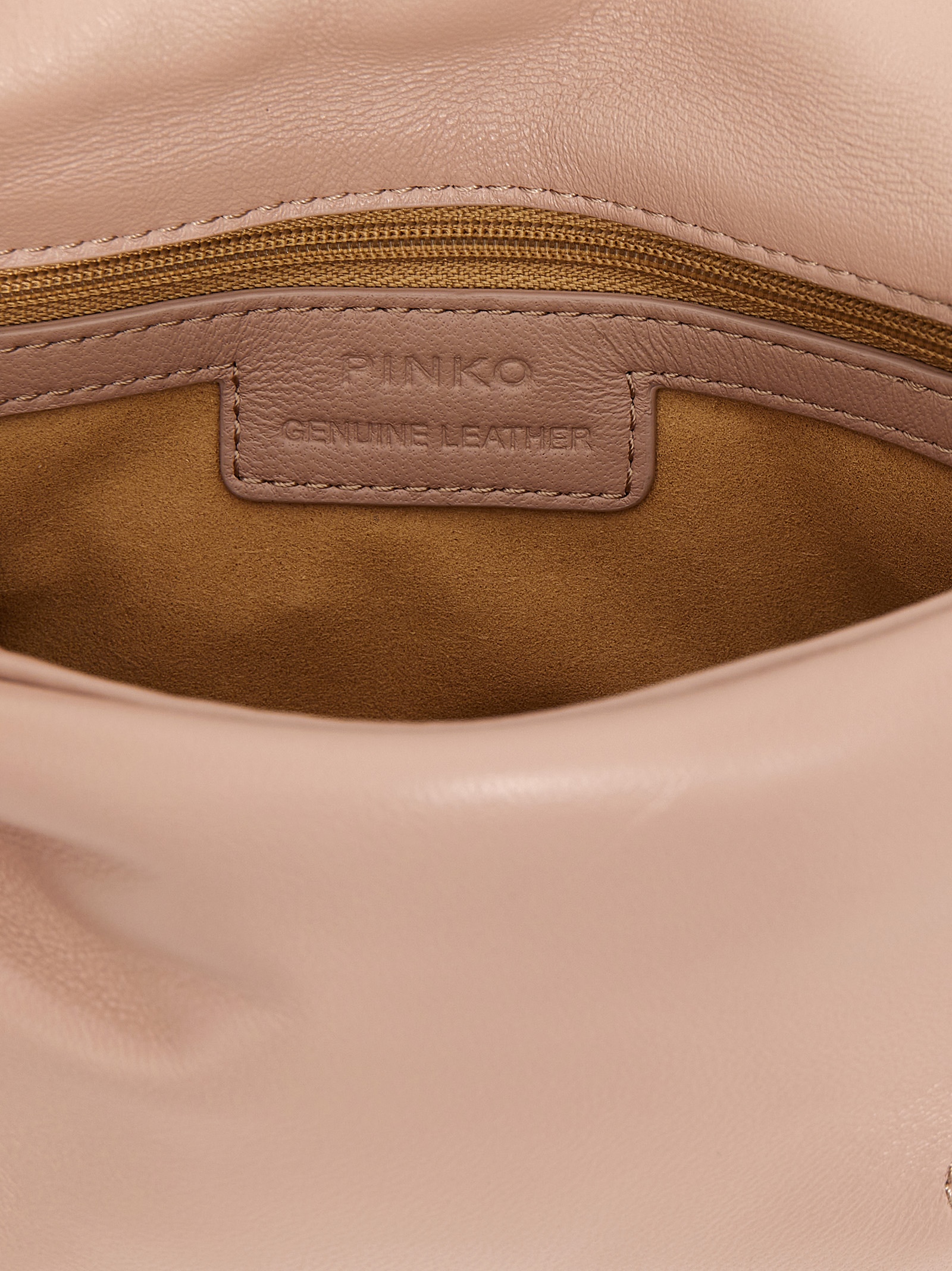Love click baby puff' matelassé leather crossbody bag with metal hardware, a flap closure with logo.