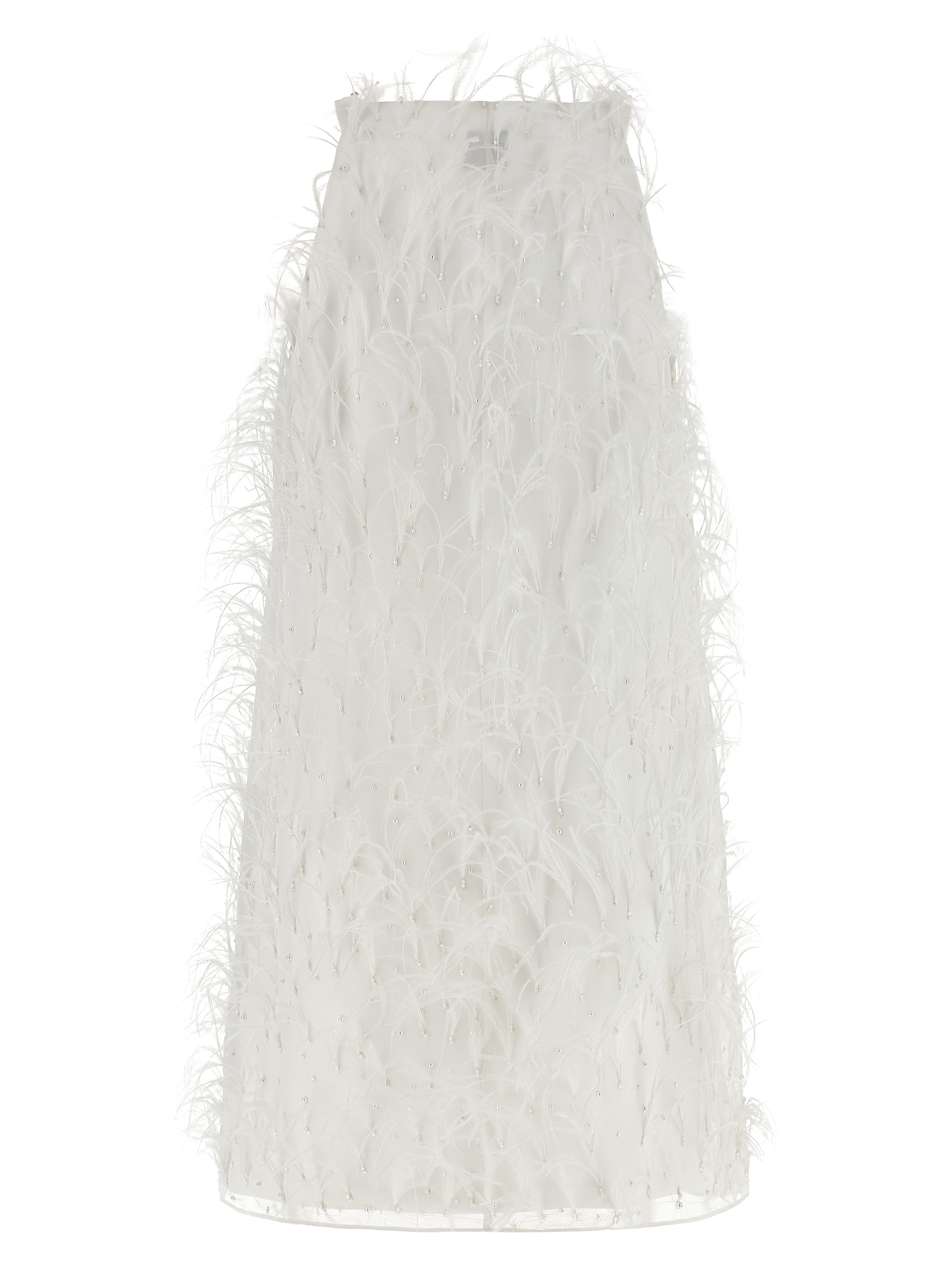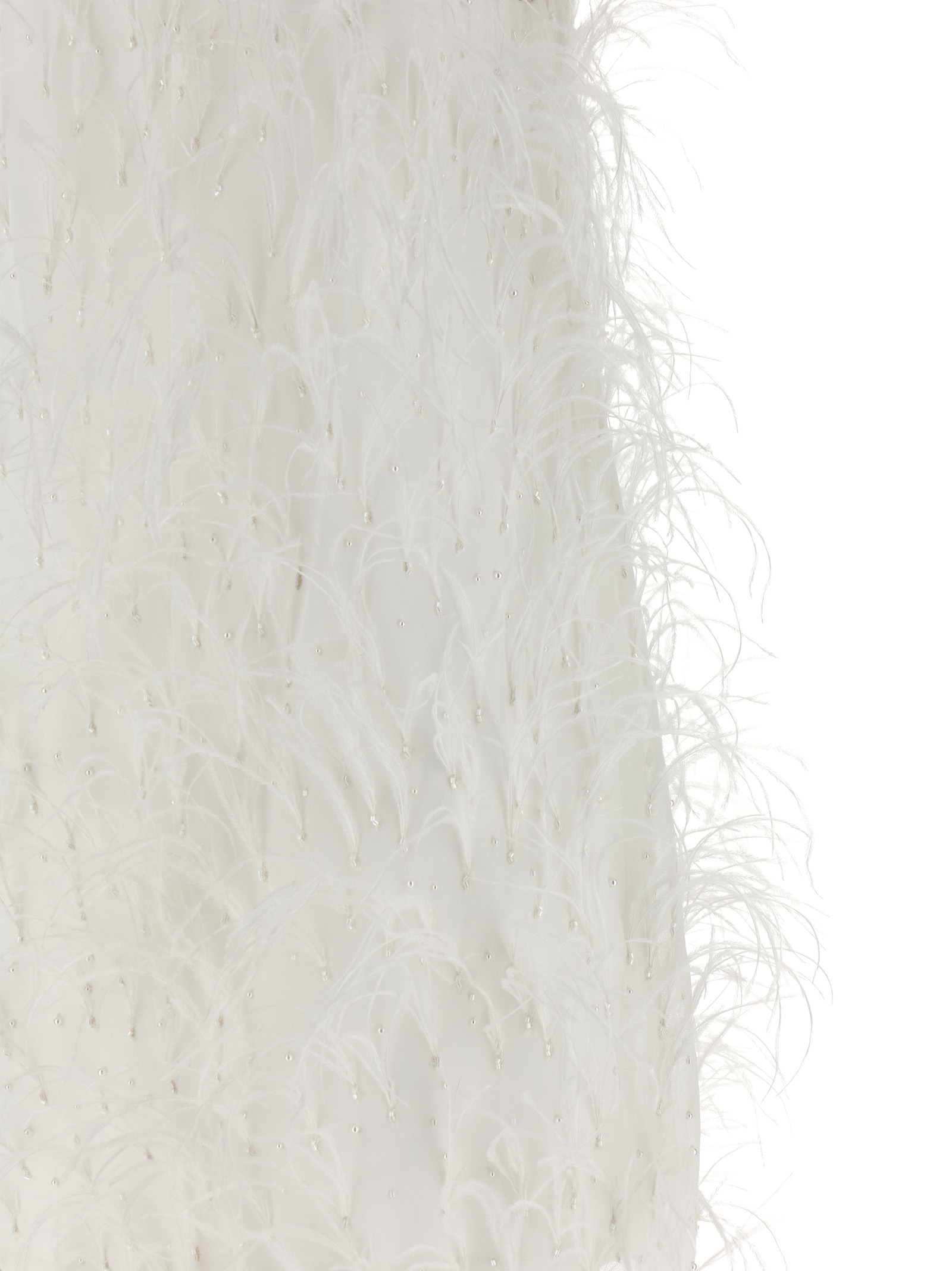'Piripicchio' georgette mini dress with beads and tufts of all-over feathers, bag silhouette, sleeveless, square neckline, petticoat.