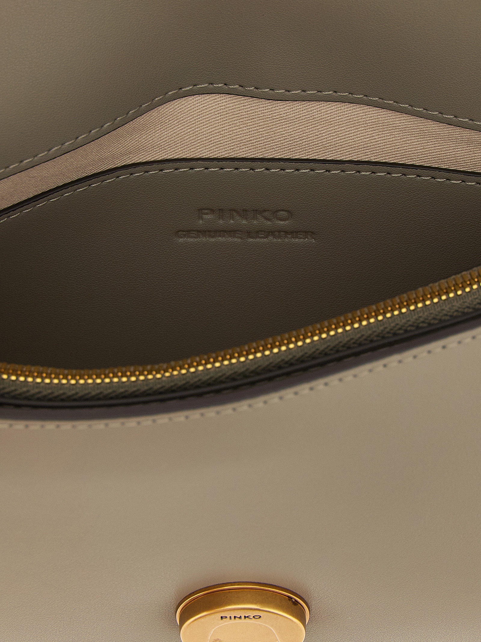 'Love One Mini' leather crossbody bag, interlocking flap closure with front metal logo appliqué, chain shoulder strap with removable leather protection.