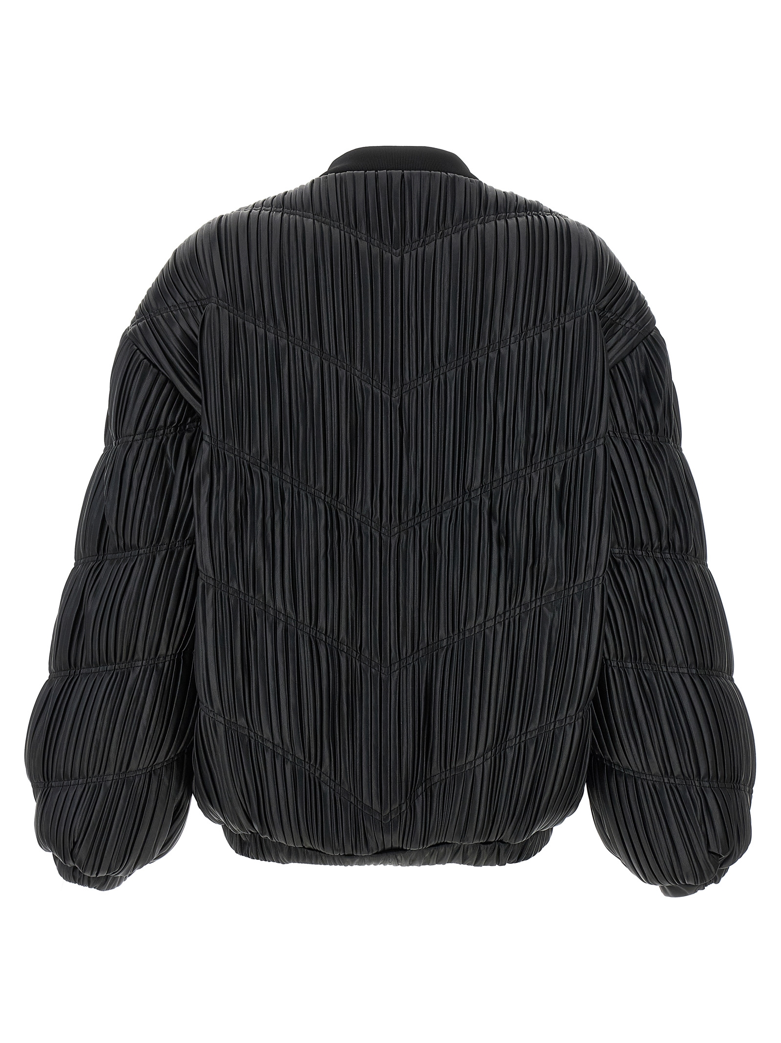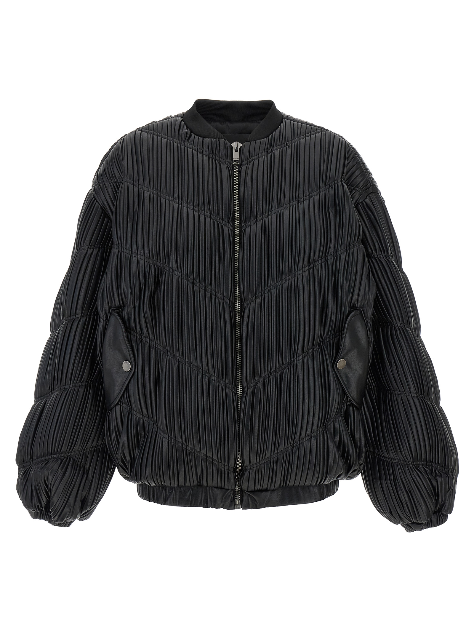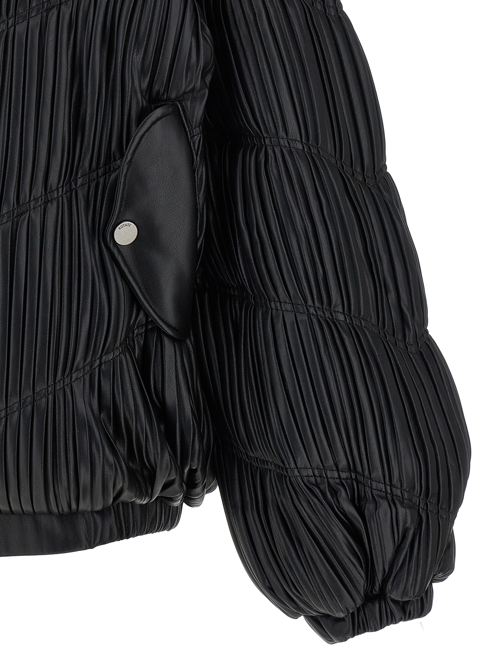 Bomber jacket in leather-effect fabric with quilted and pleated texture, front zip closure, long wide sleeves with elasticized cuffs and dropped shoulder, pockets, elastic on the hem. SUSTAINABLE: Product made from recycled polyester.Өнімнің ерекшеліктері
