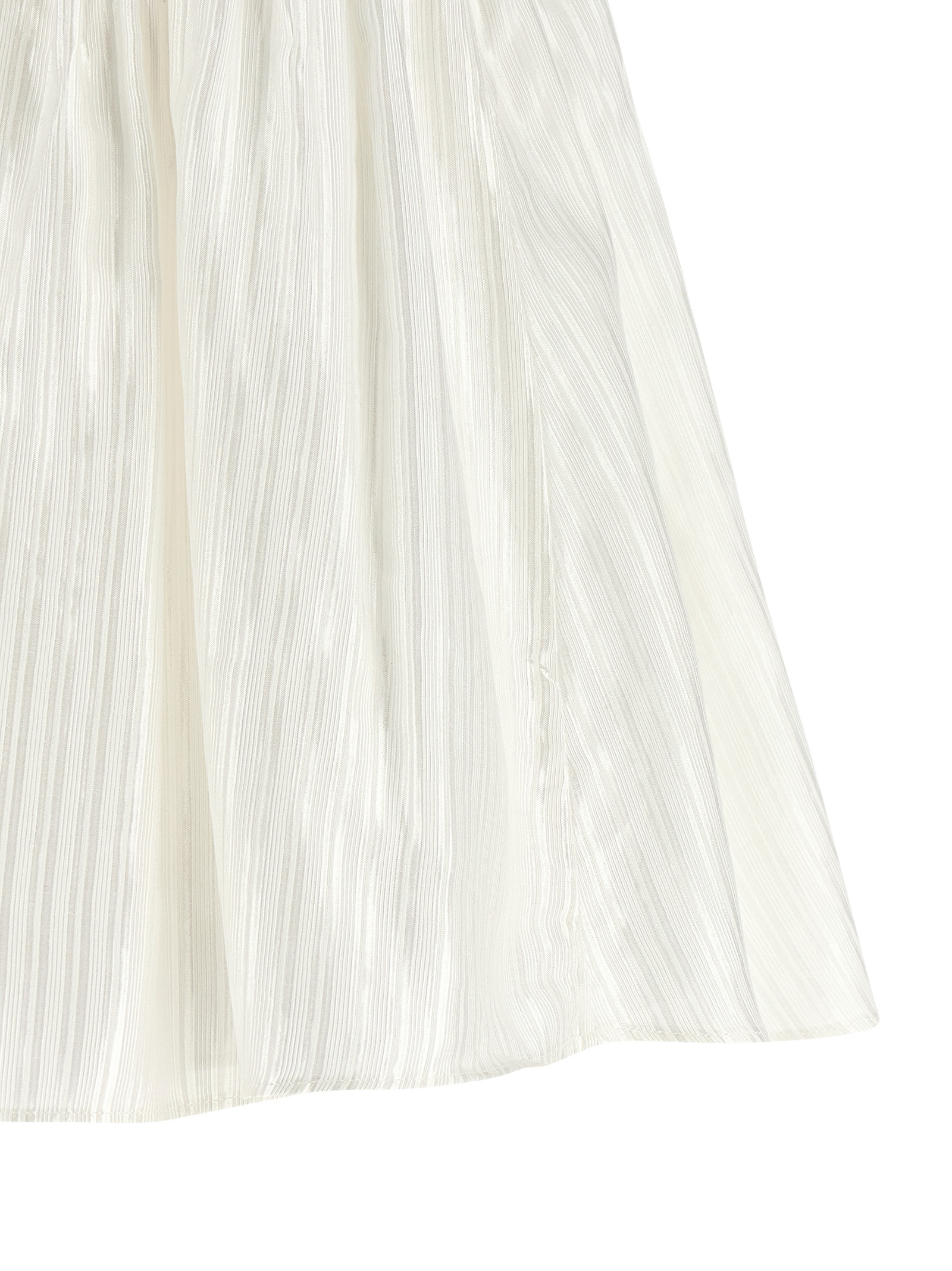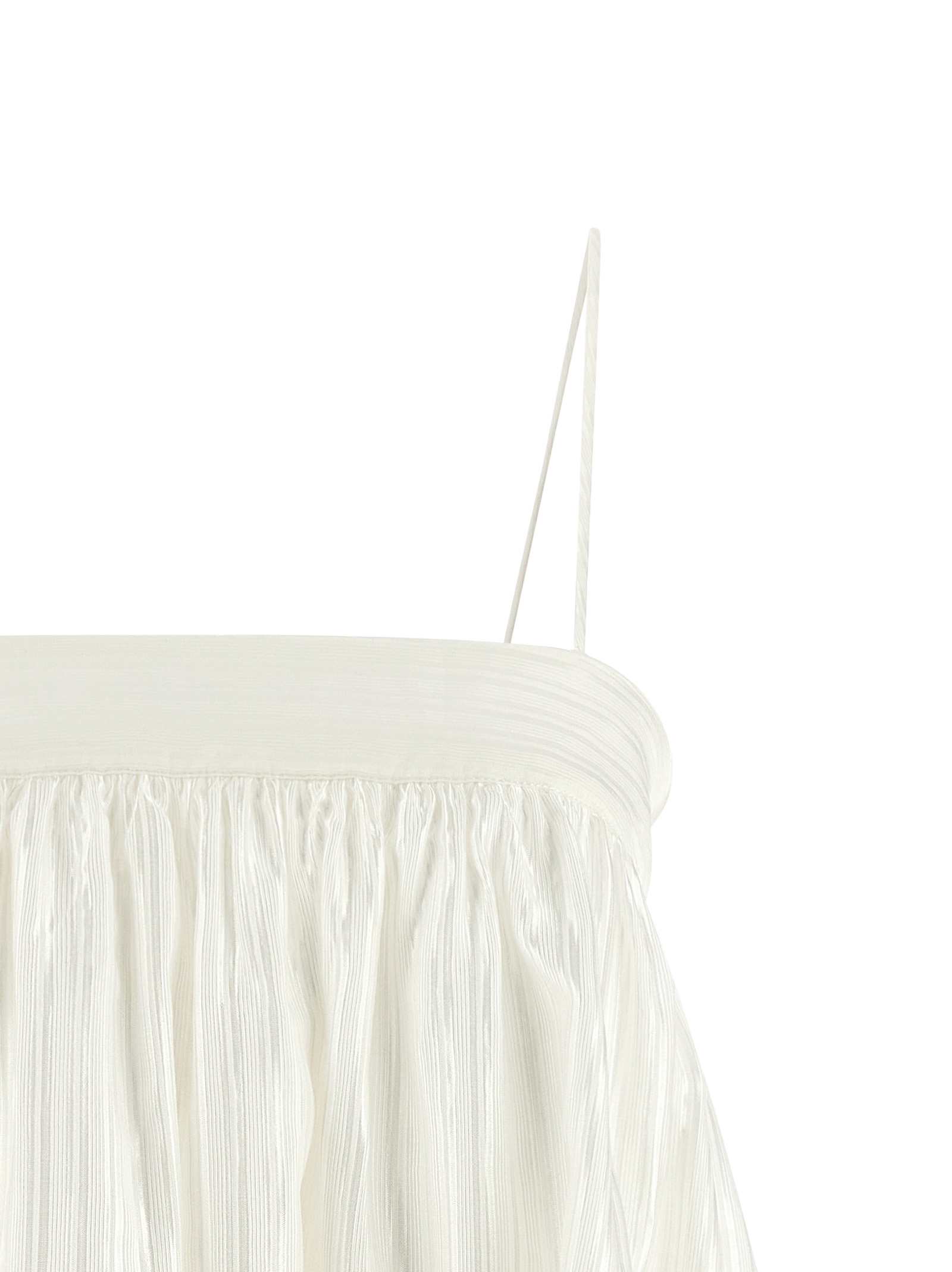 Striped viscose top with glossy finish with curls, A-shaped silhouette, square neckline on the front and back, thin straps, side zip closure, lining.