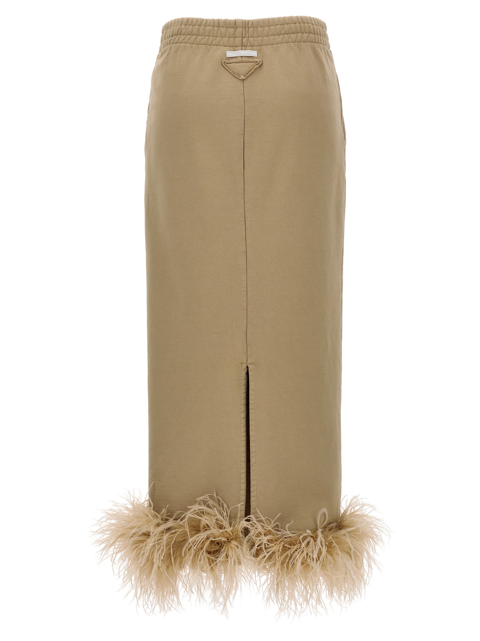 Cotton midi skirt with feather application on the hem, back split, elastic and drawstring at the waist, pockets, logo.
