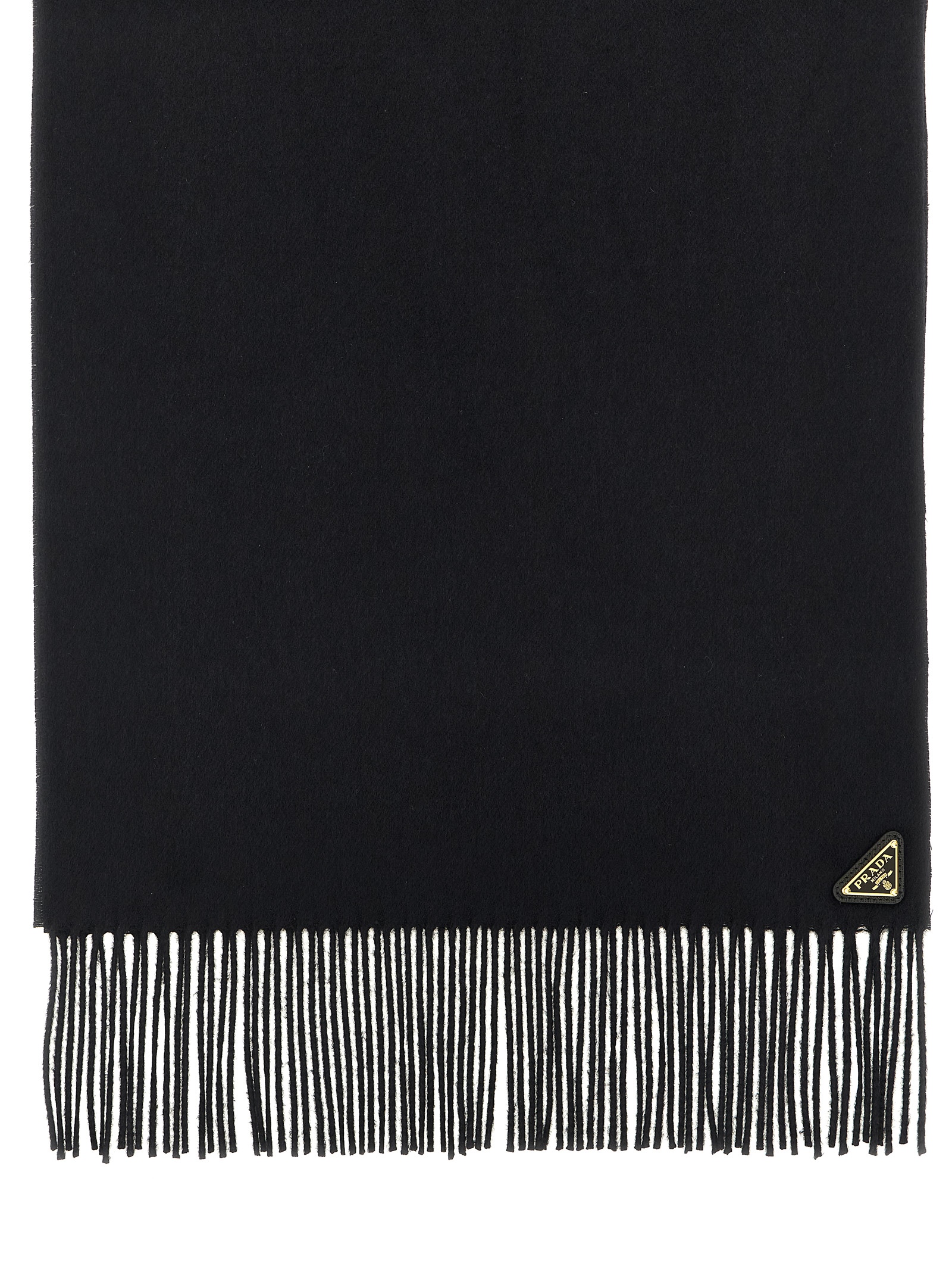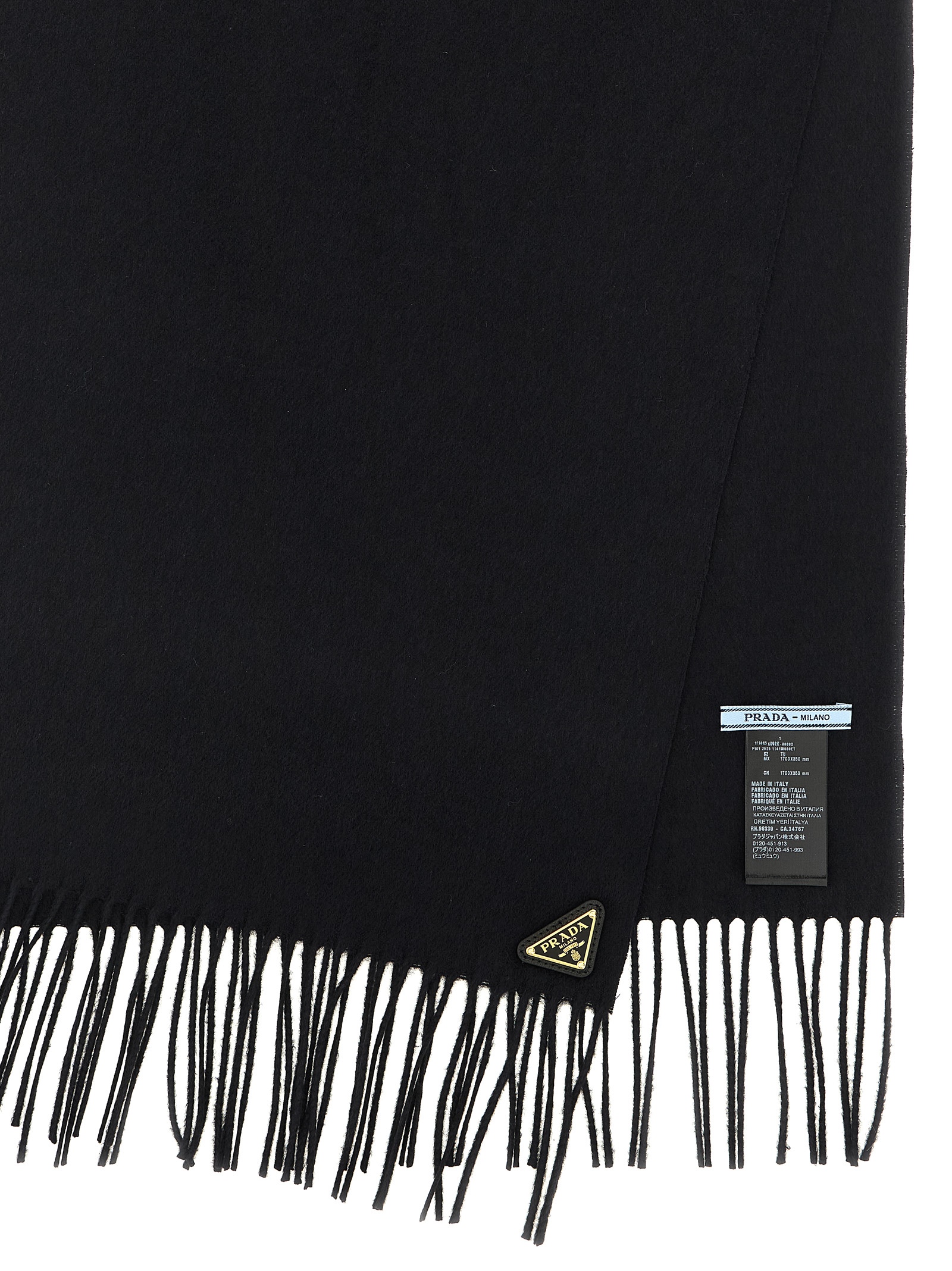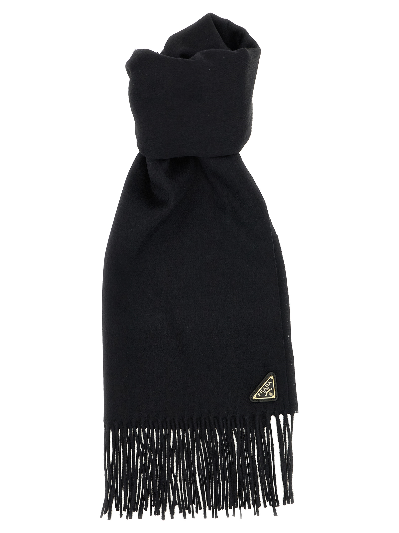 Silk and cashmere scarf, triangle logo in enameled metal, fringed edges.