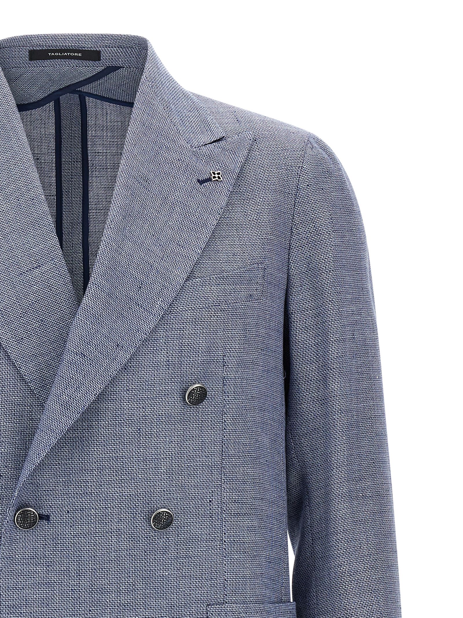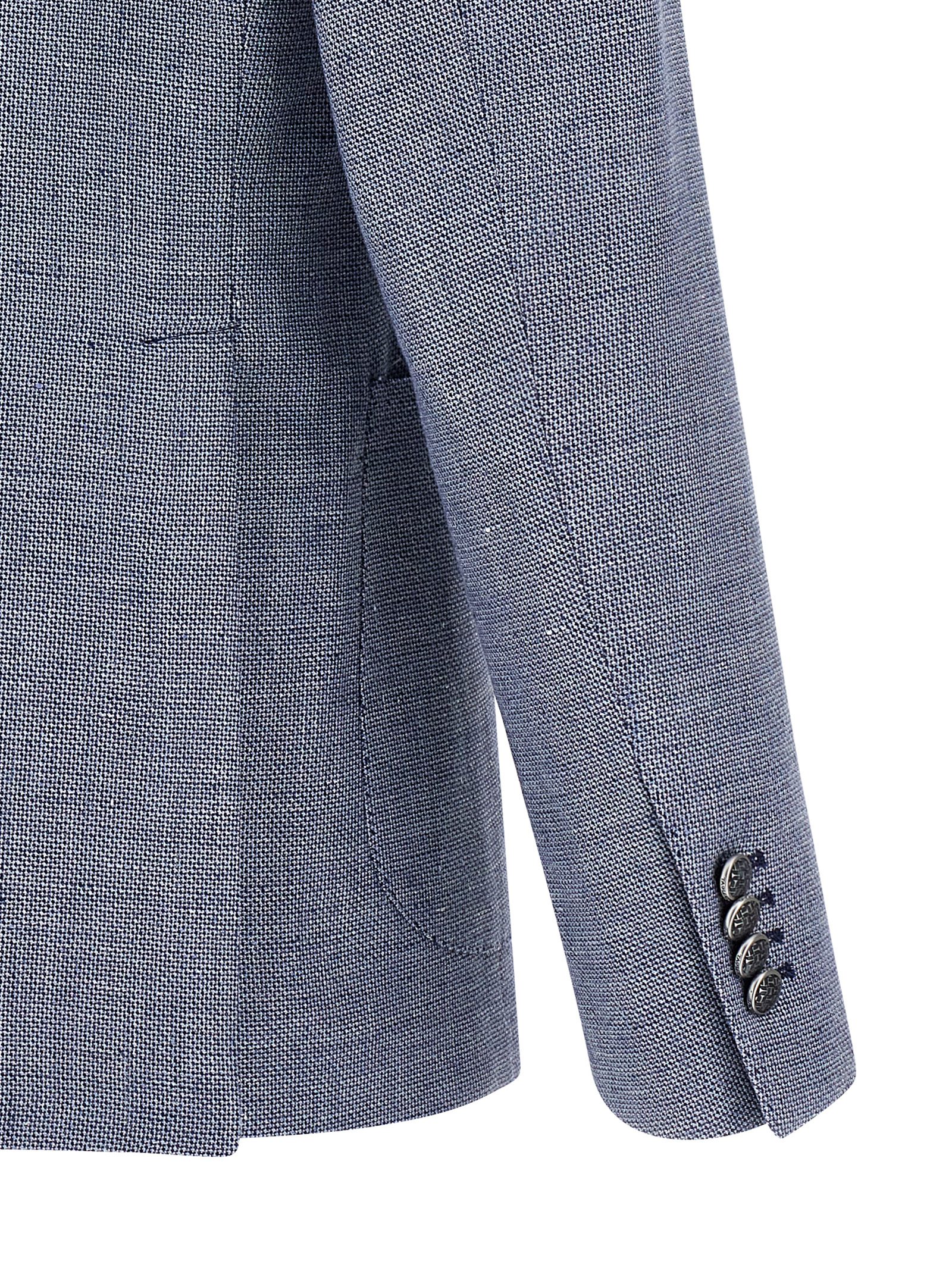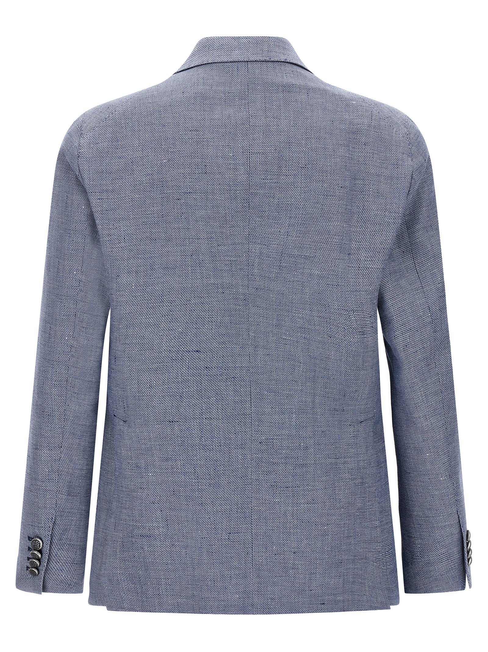 'Montecarlo' double-breasted blazer in linen and cotton blend with button closure, pockets, unlined, peak lapels, removable pin, long sleeves, back vents.