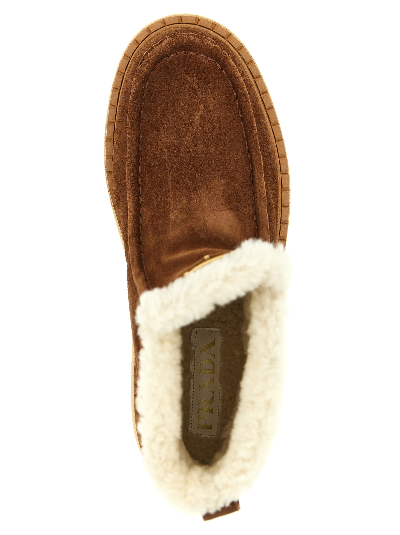 Suede ankle boots, shearling lining, front enameled metal triangle logo, rubber platform sole.
