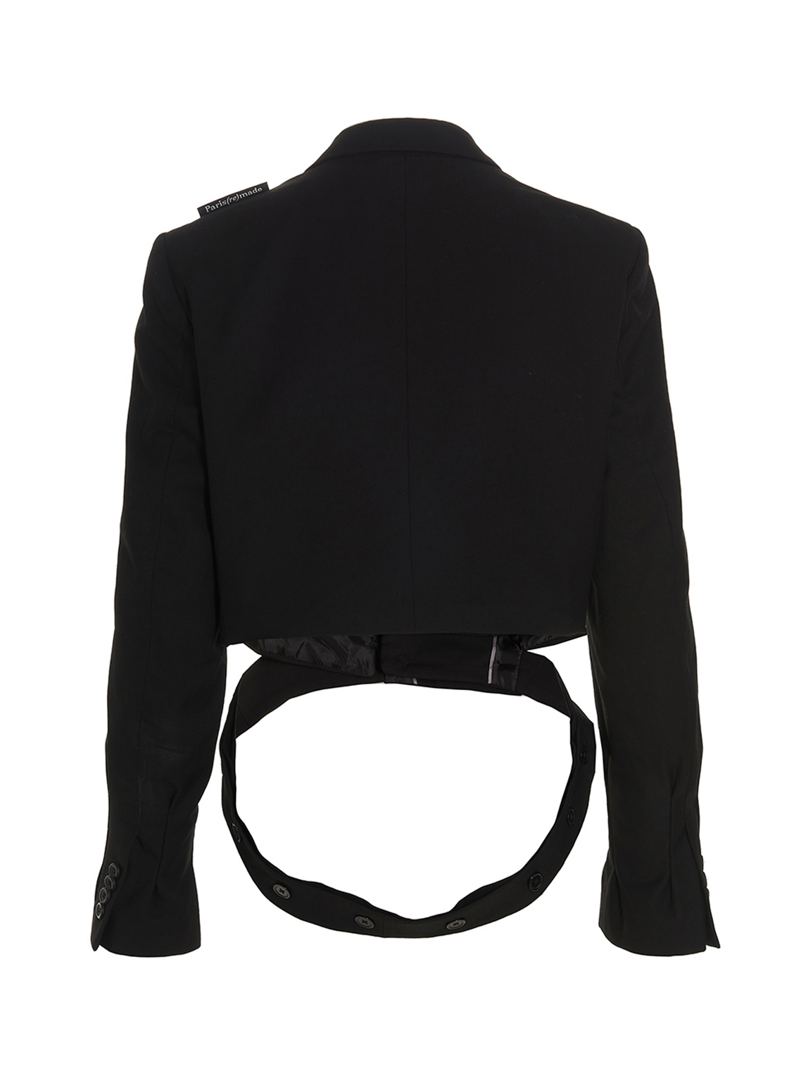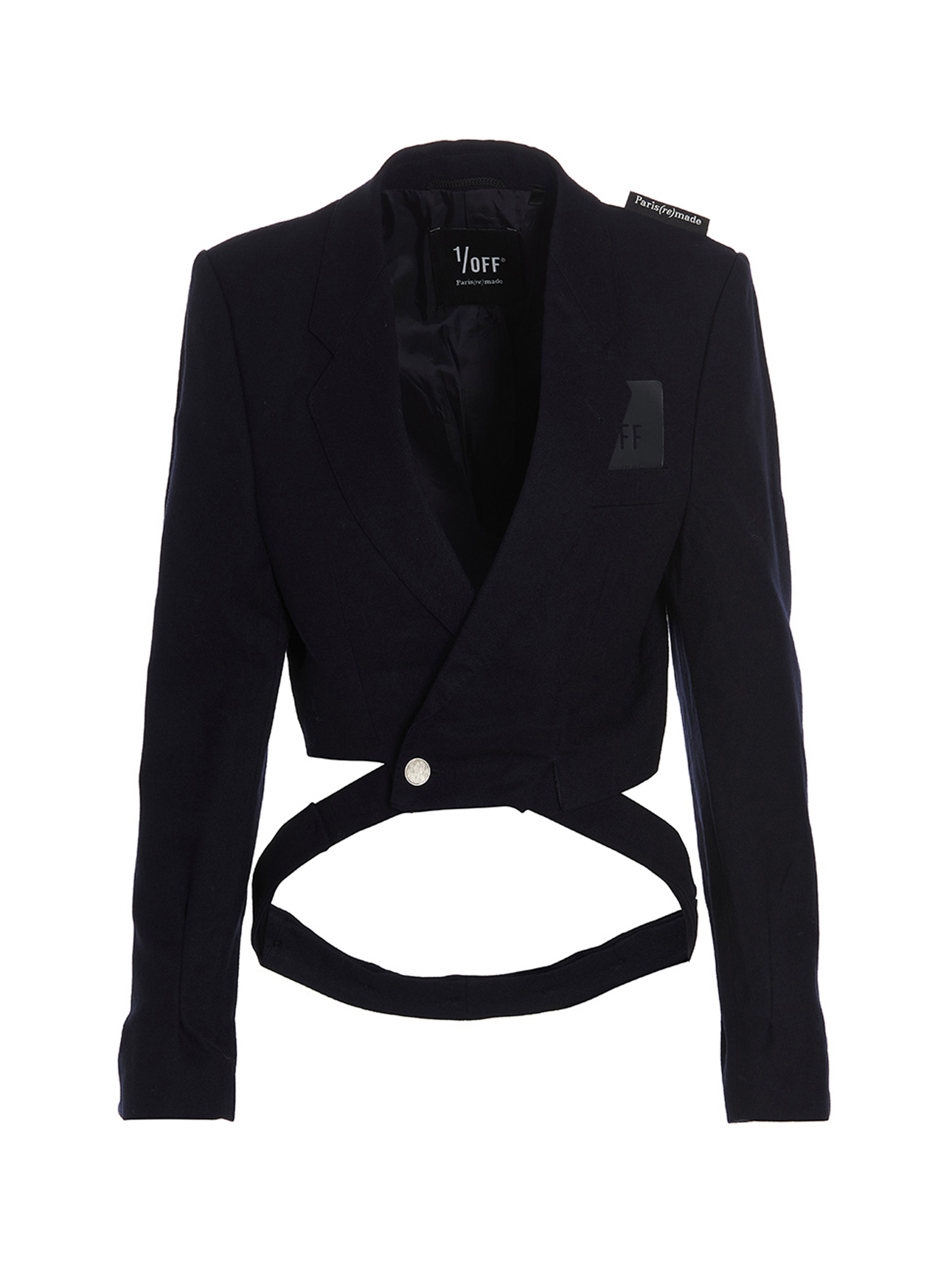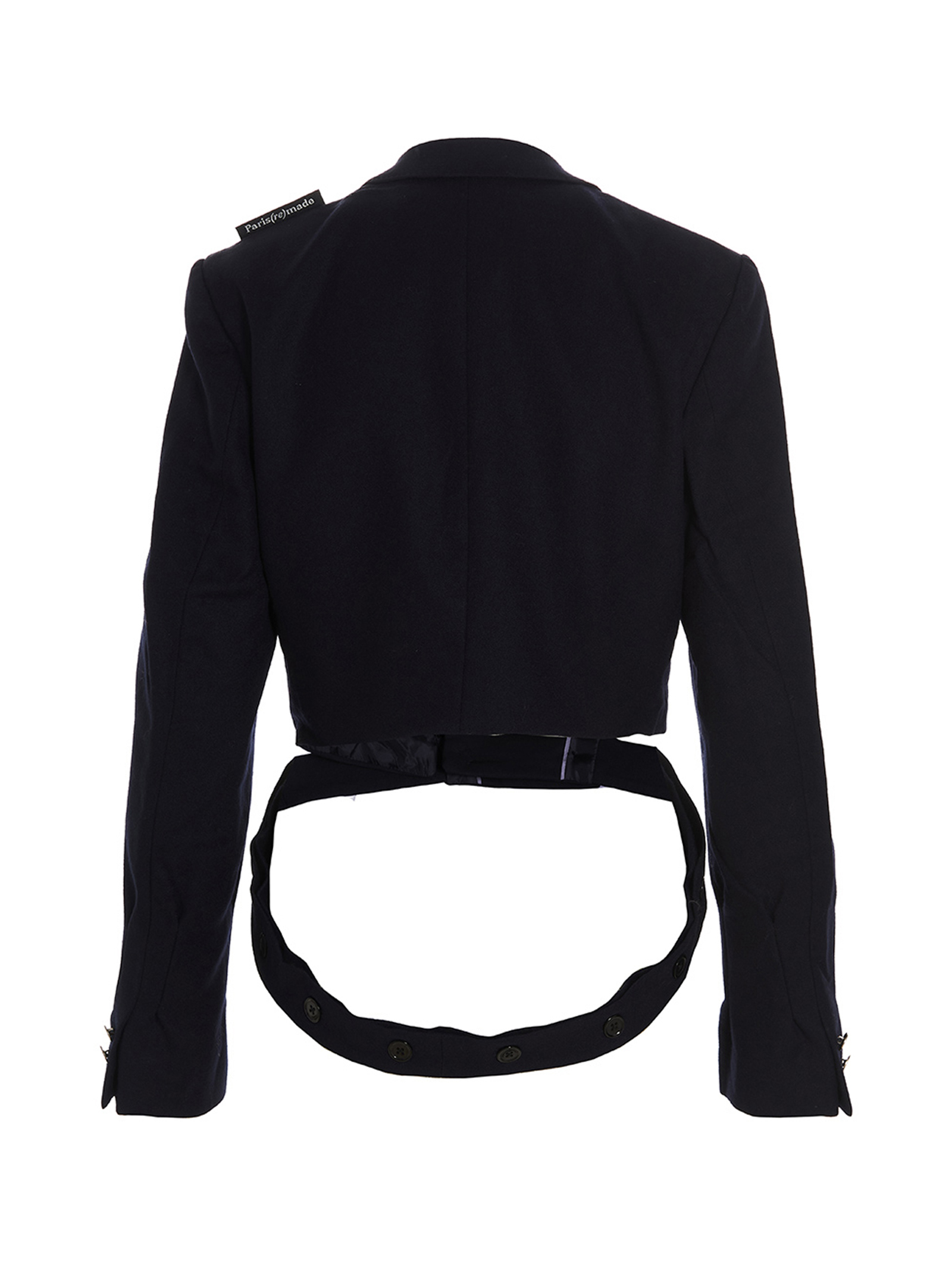 Cropped' single-breasted blazer jacket with button closure, cut-out detail on the hemline, front logo print, long sleeves and a pocket. This is a vintage model therefore each size is different and the models differ in colors and prints. Please contact us if you have any preferences on the model.