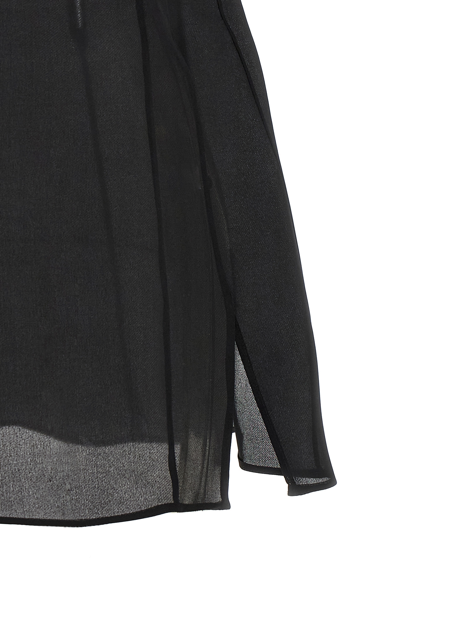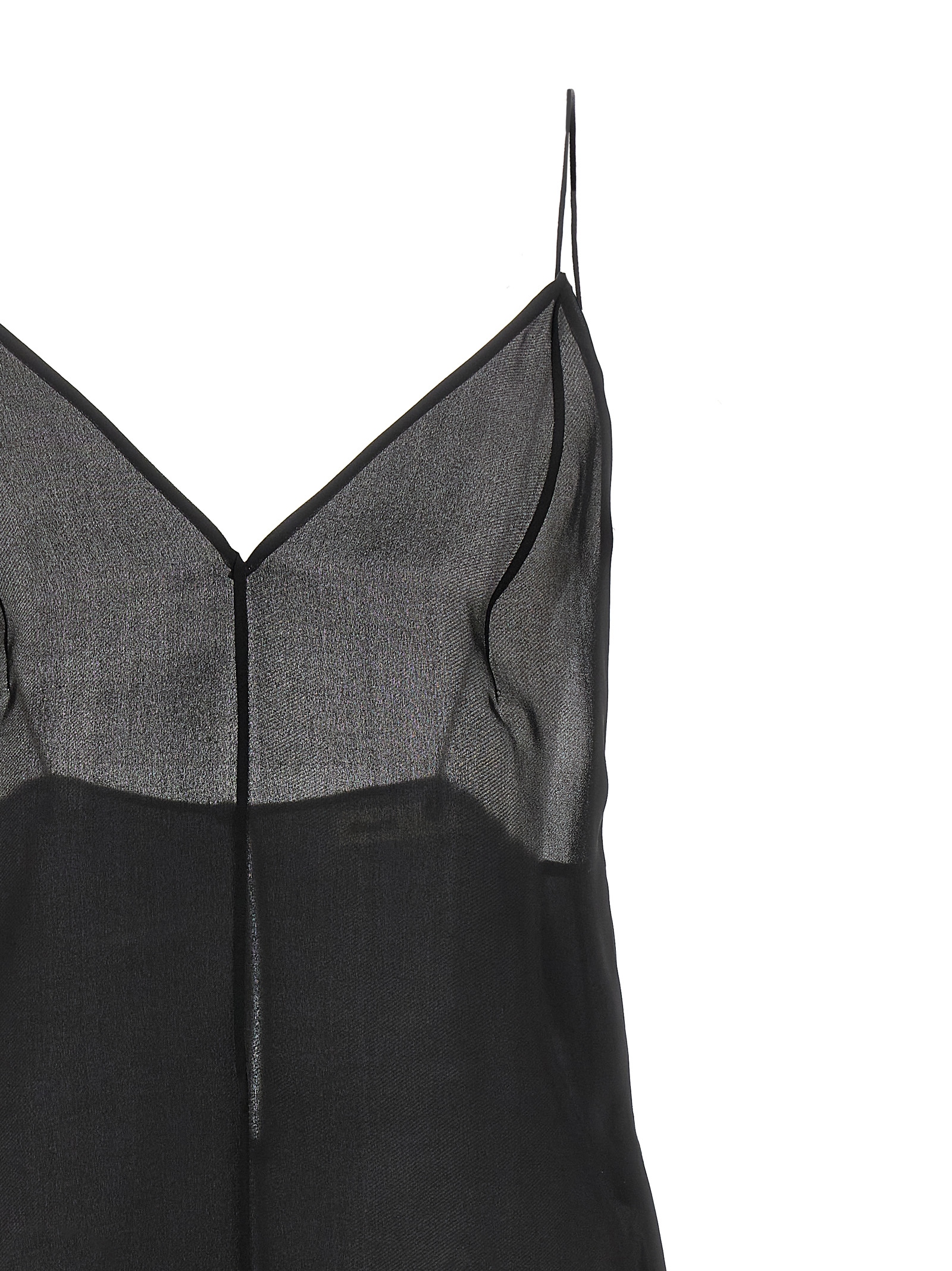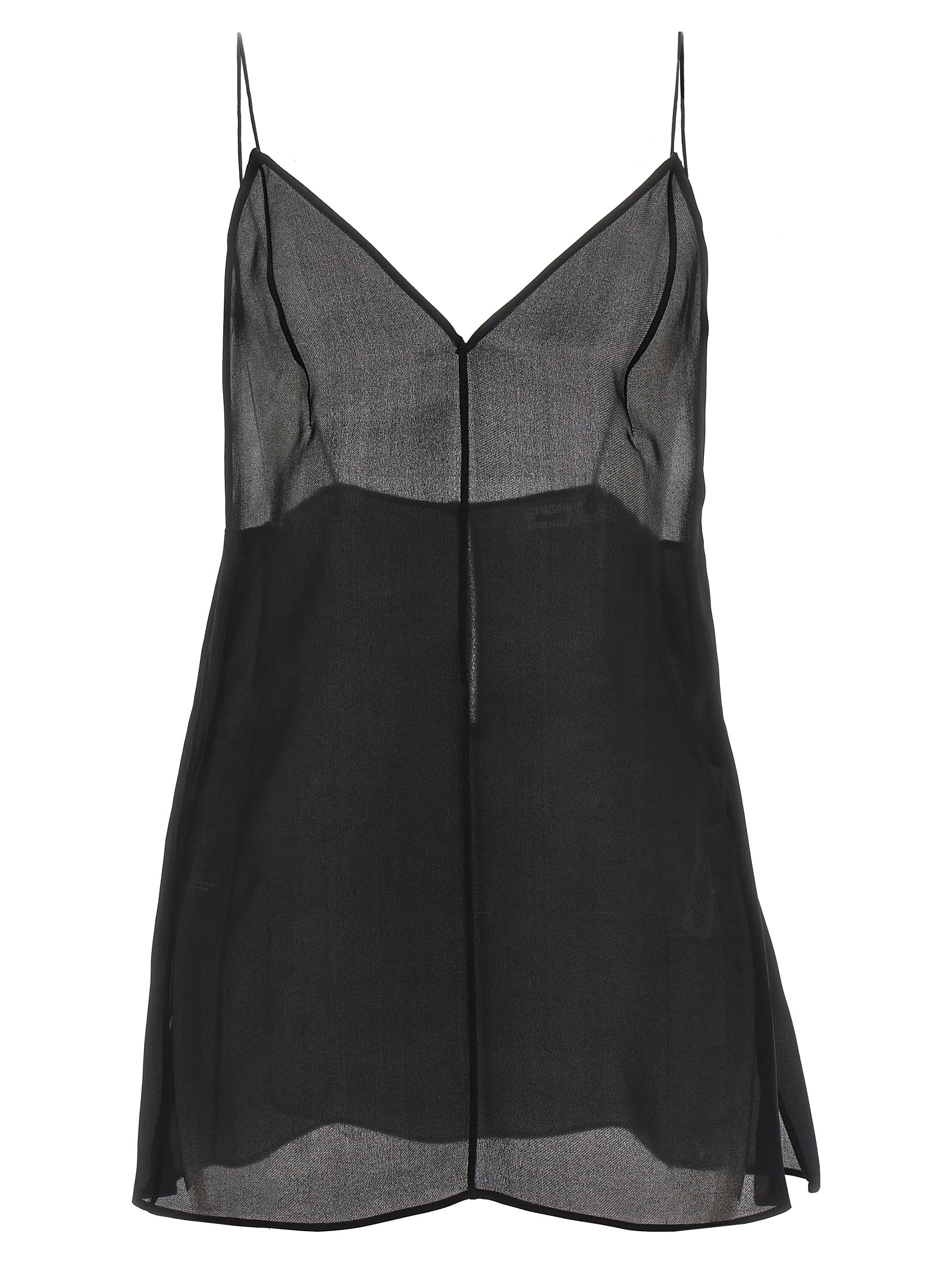 'Talsie' semi-transparent pure silk organza top with front V-neck, ultra-thin straps, pintuck front and back, wide back square neckline with button closure and teardrop cut-out details, side slits.