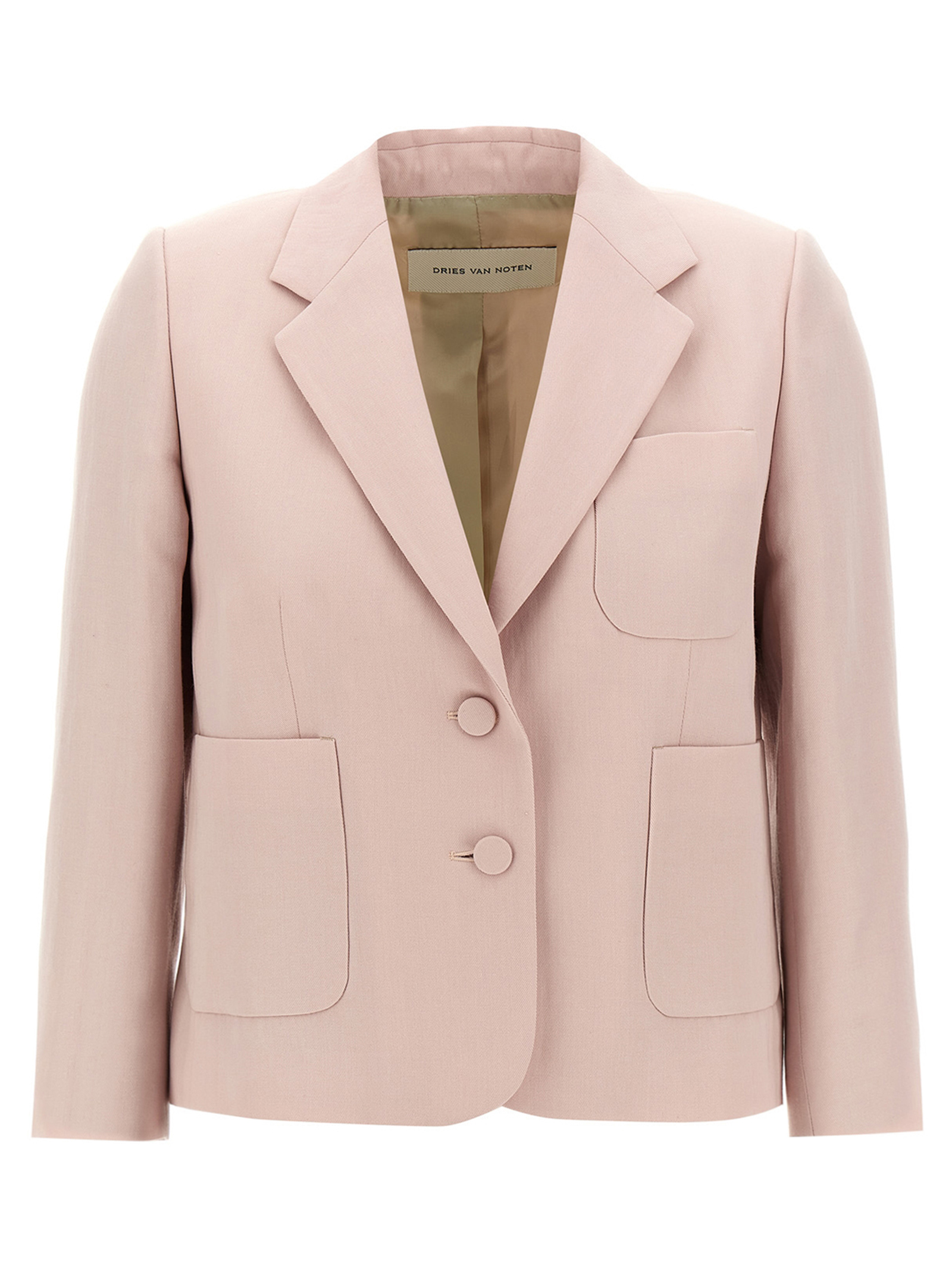 'Bamis' single-breasted crop blazer in wool and paper yarn blend with front button closure, mirror lapels, pockets, long sleeves, slightly padded shoulders, back split, lining.