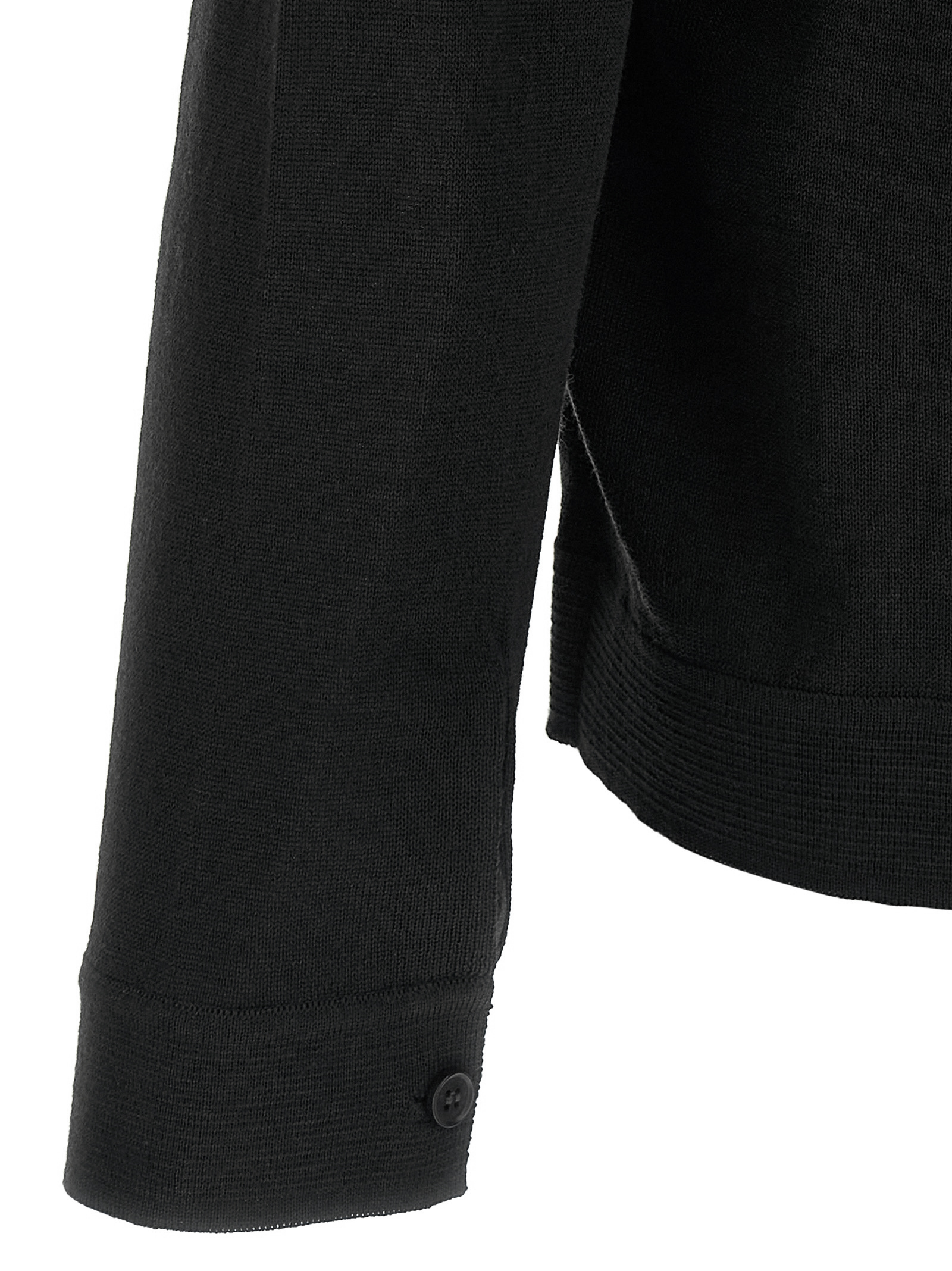 Merino wool cardigan with shirt collar, front button closure, long cuffed sleeves.