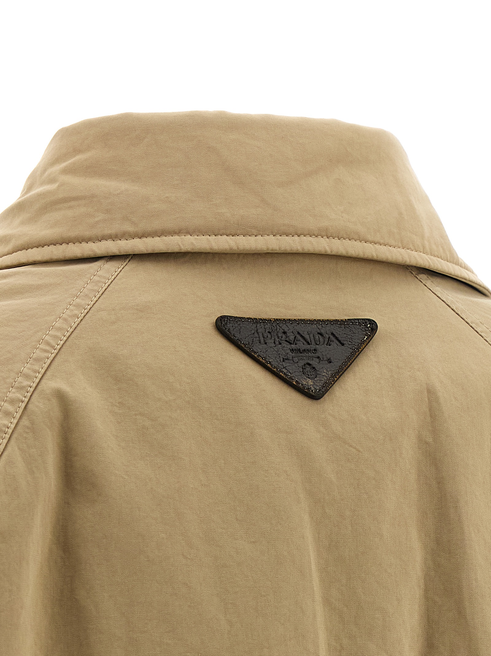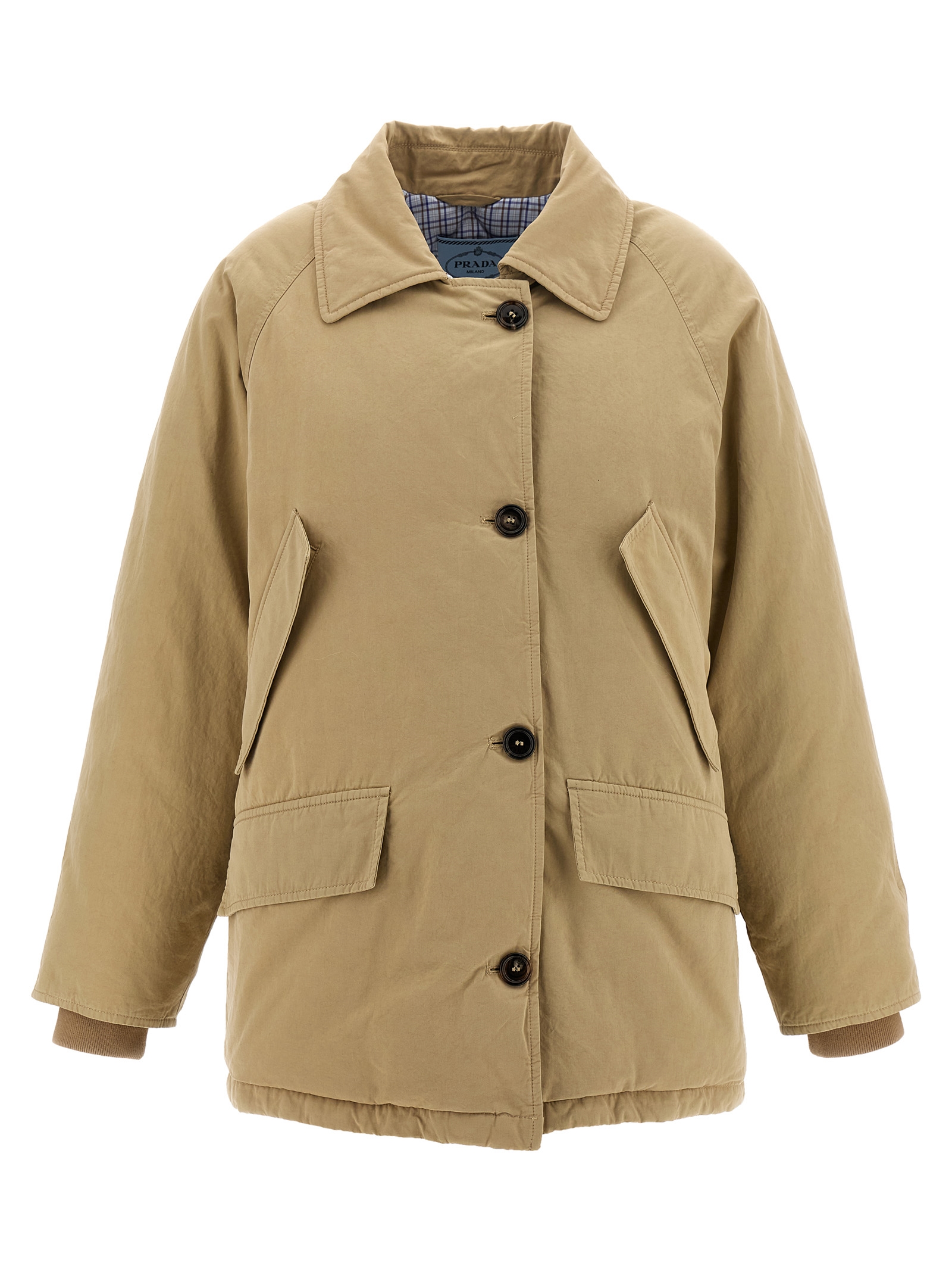 Cotton jacket, shirt collar with removable long-haired fur insert, quilted check print cotton lining with goose down padding, used-effect leather patch with embossed logo on the back, front zip and button closure, pockets, long sleeves with stretch knit cuffs, drawstring at the waist.