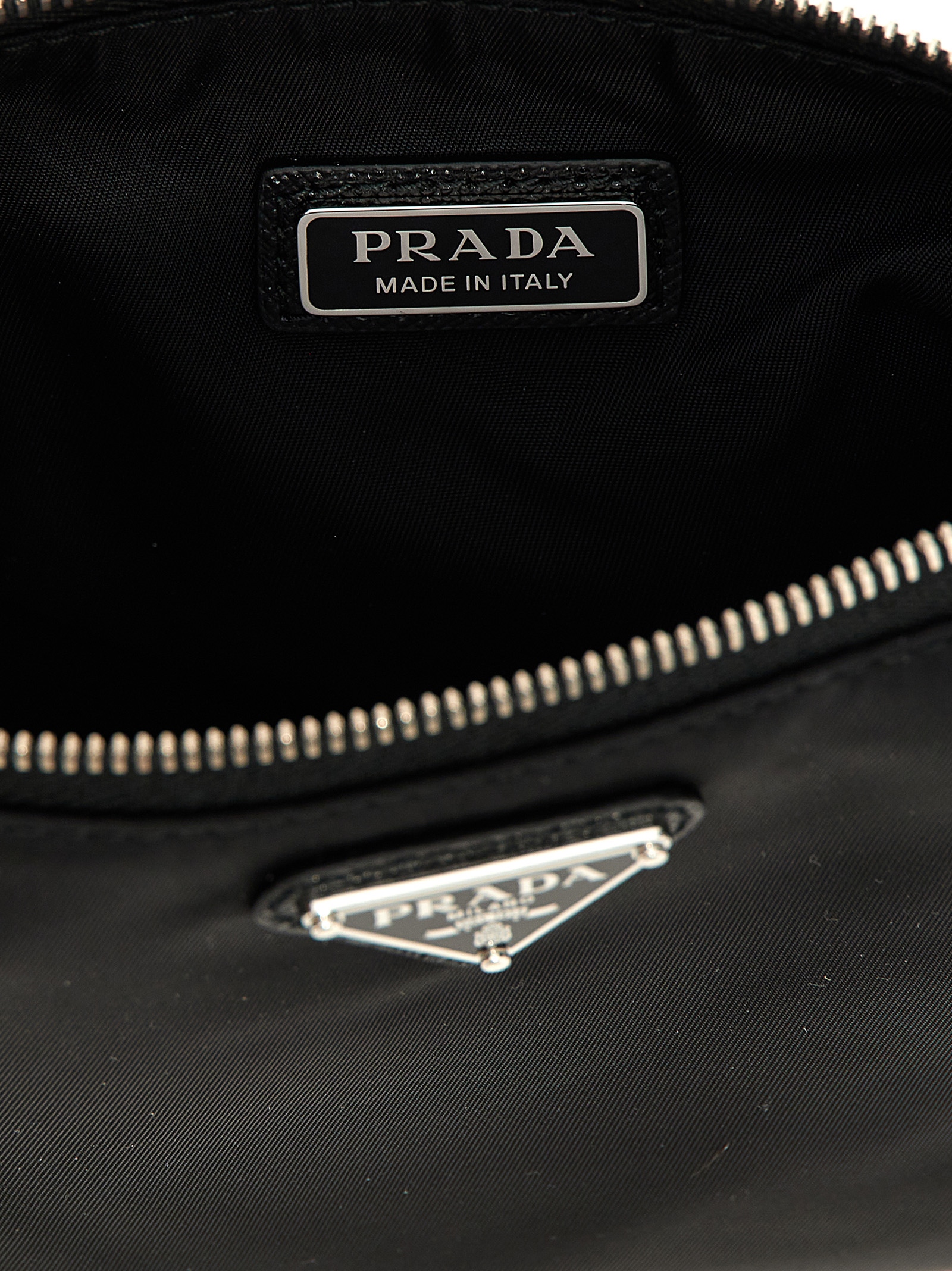 Re-Nylon clutch bag with saffiano leather details, triangle logo patch in enameled metal on the front, zip closure, removable wrist handle. SUSTAINABLE: This product is made with Re-Nylon, a regenerated yarn made from recycled and purified plastic collected in oceans, fishery nets and textile fibers.Өнімнің ерекшеліктері