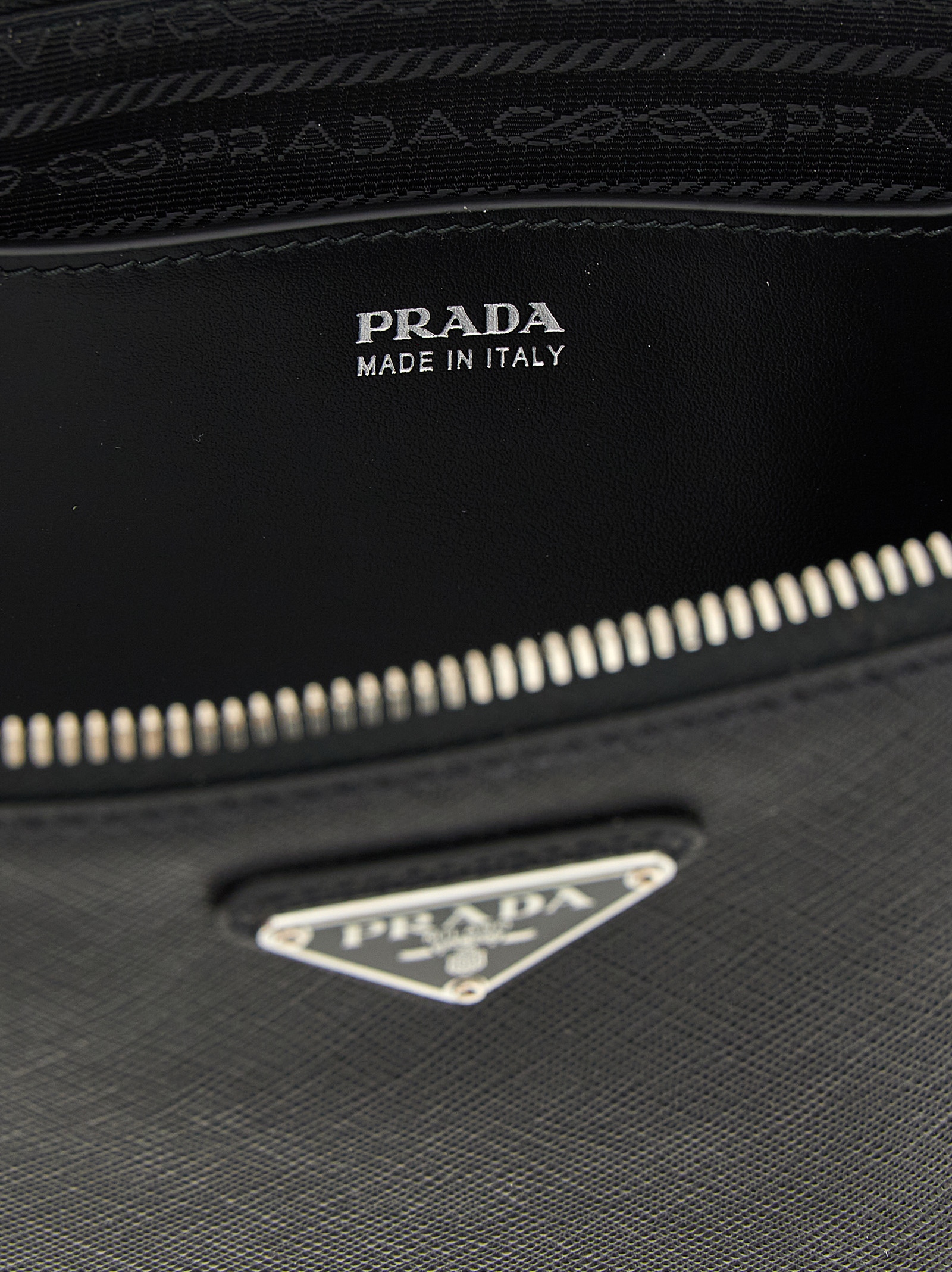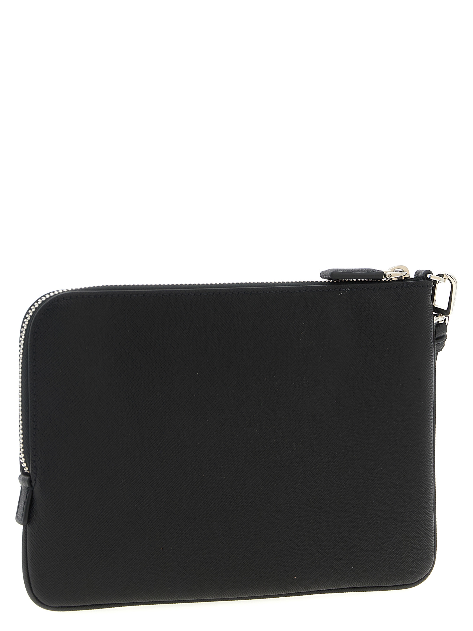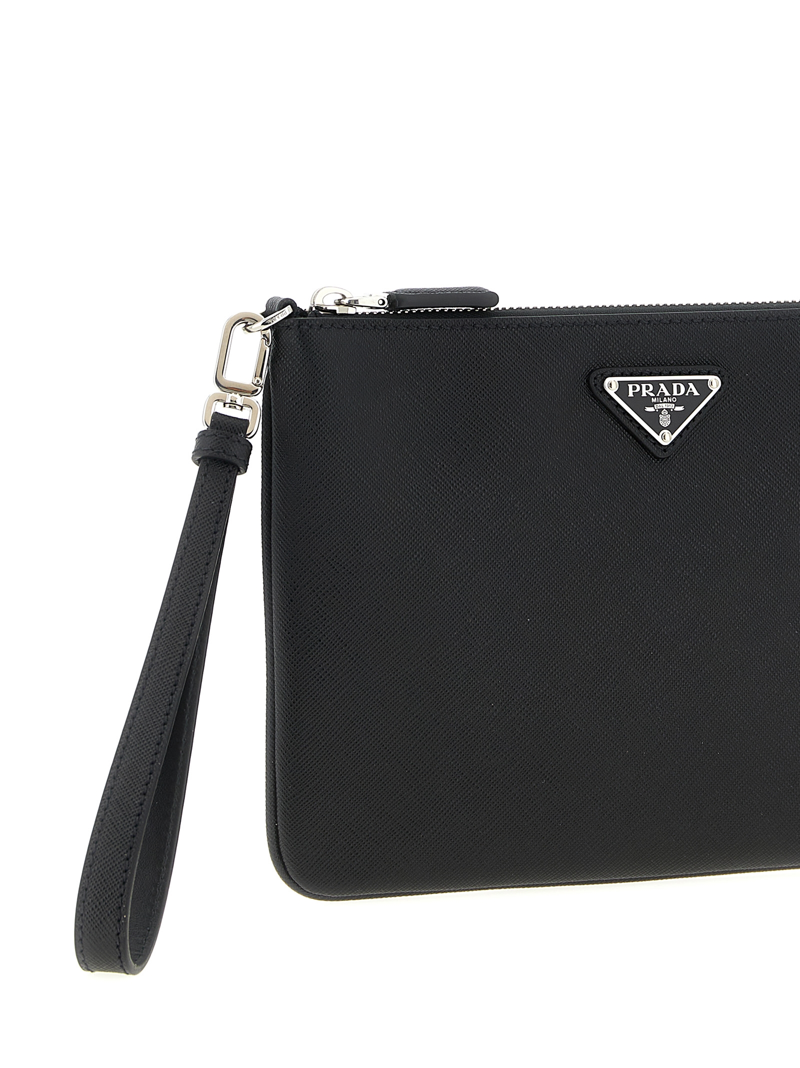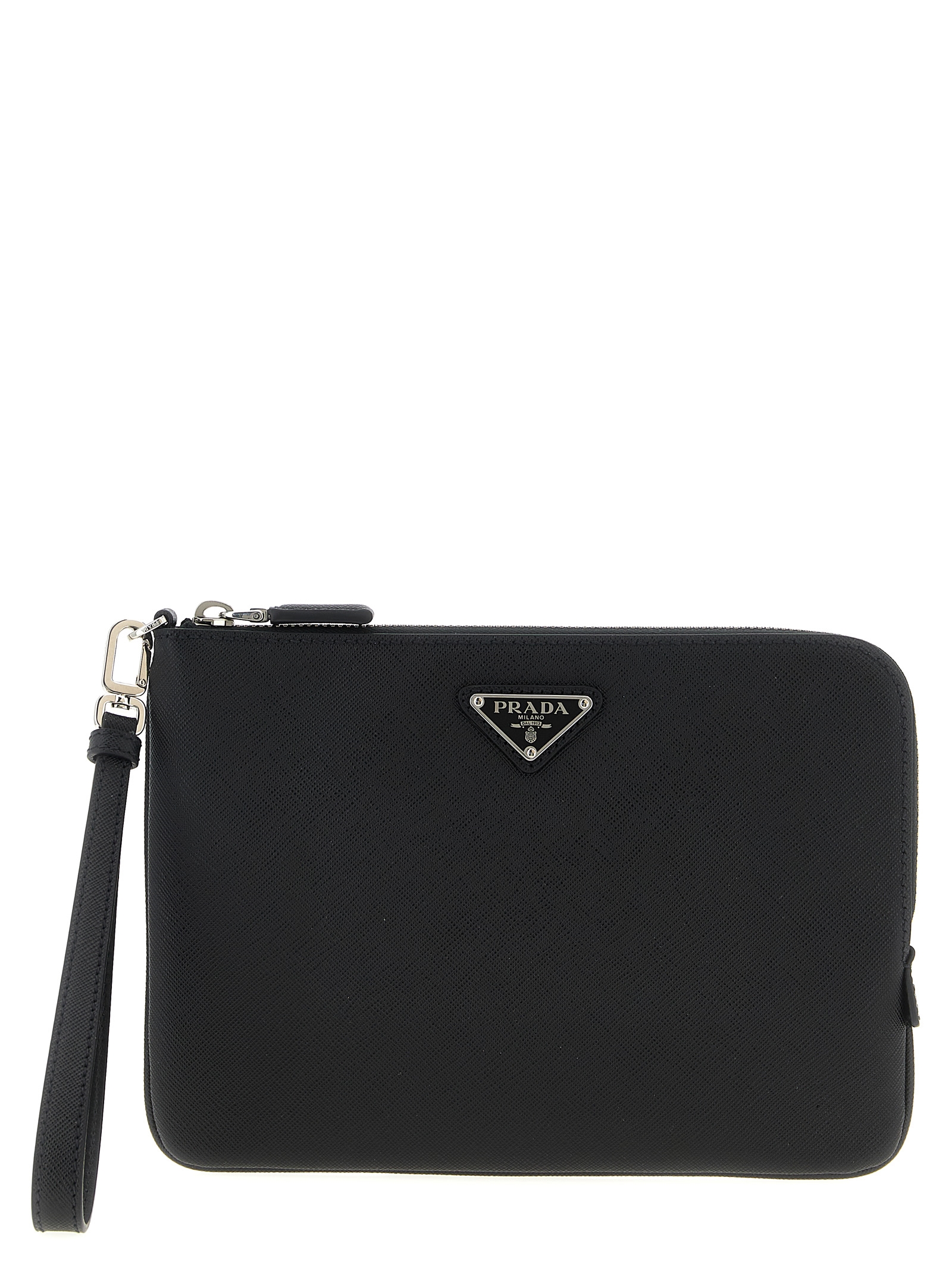 Saffiano leather clutch bag, front enameled metal triangle logo, top zip closure, removable wrist handle.Өнімнің ерекшеліктері