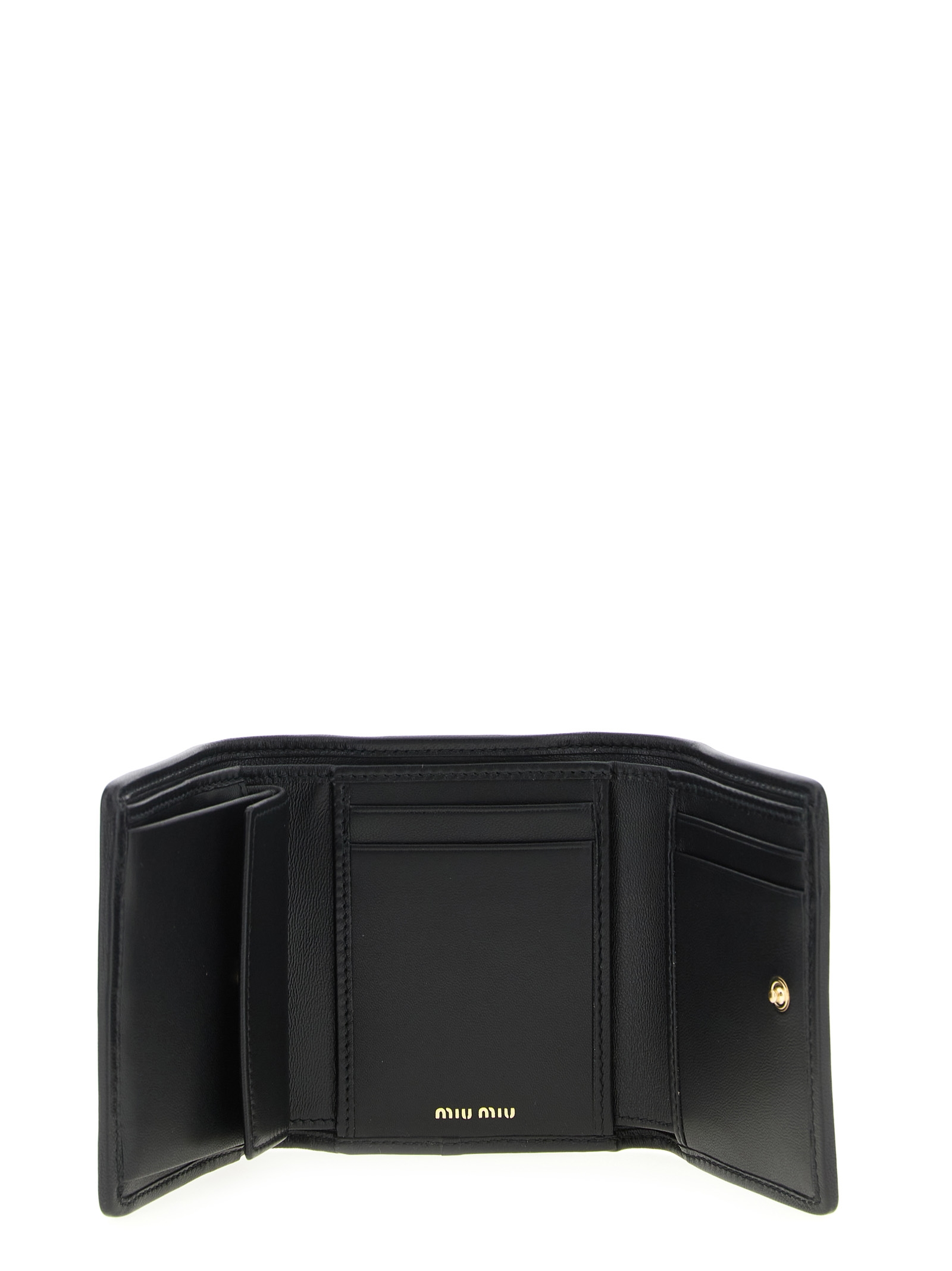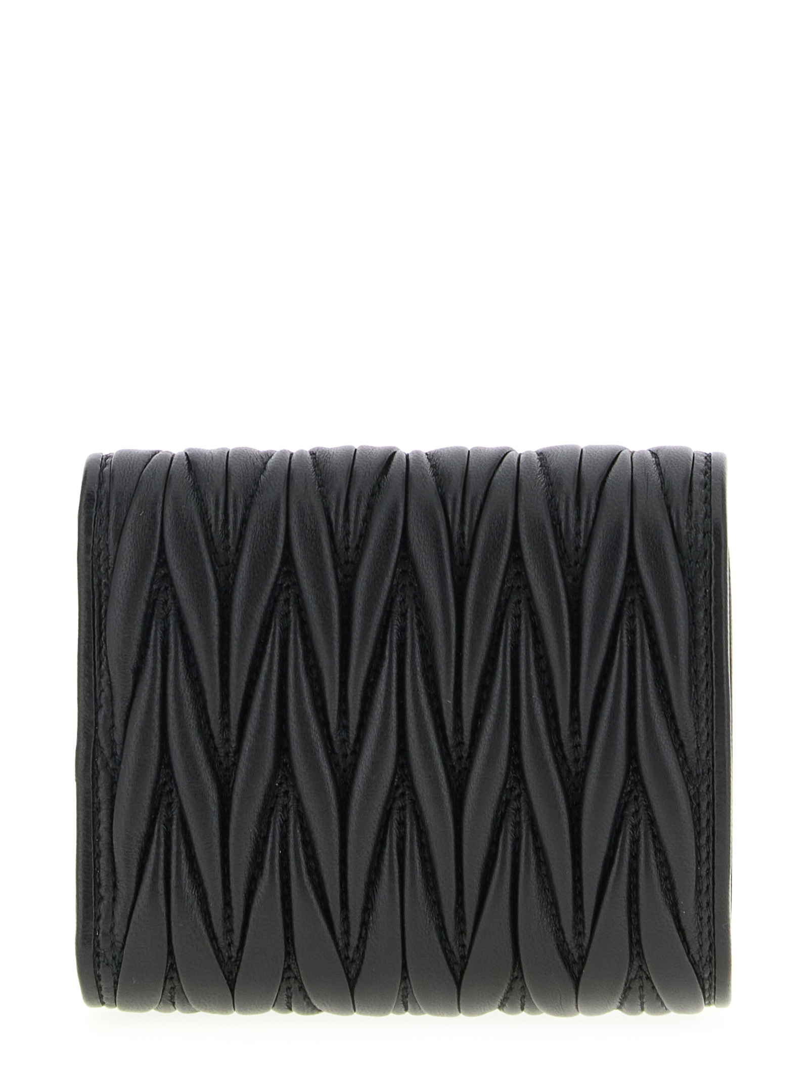 Small wallet in matelassé nappa leather, front metal lettering logo, snap button closure, moiré lining.