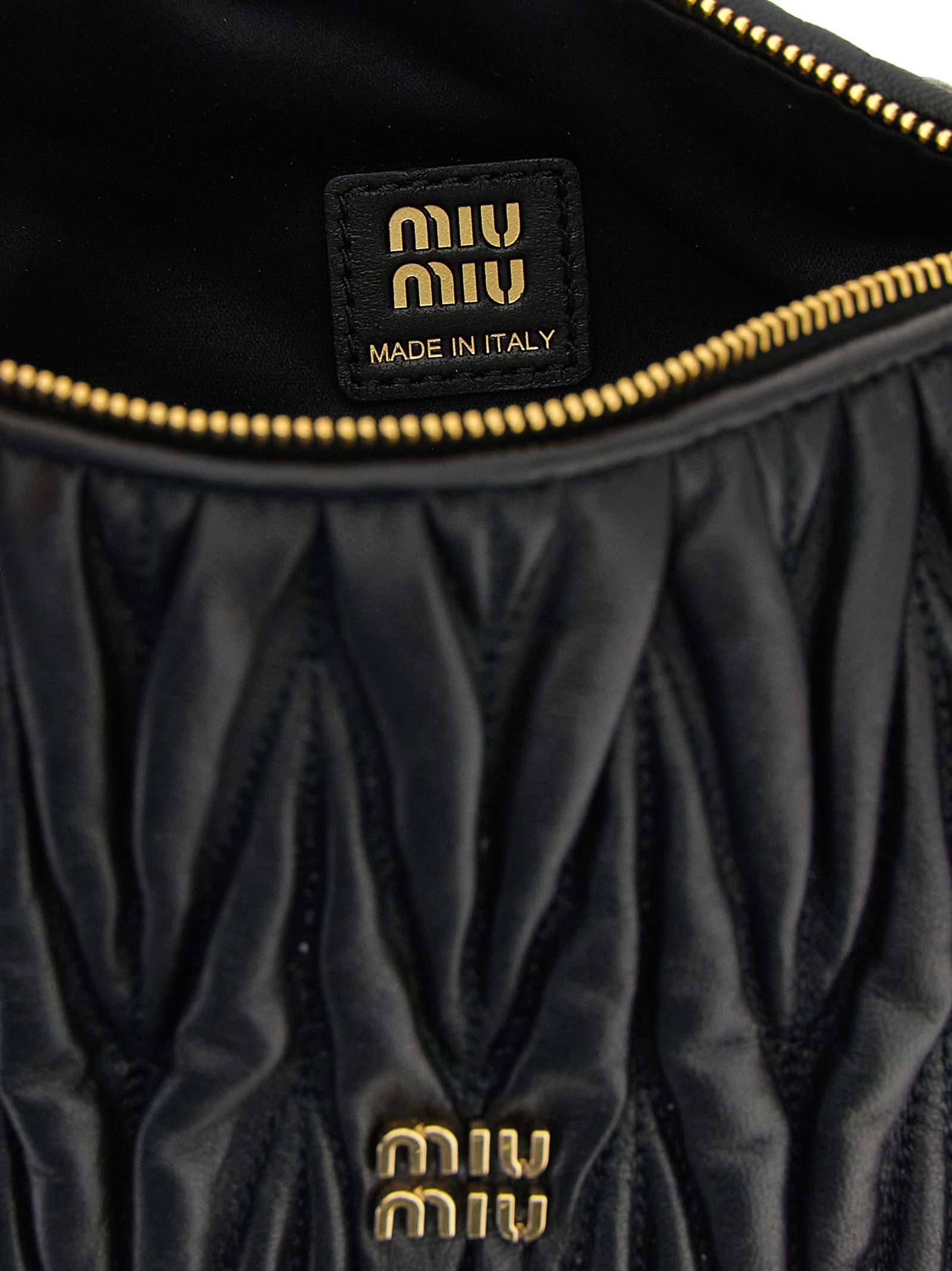 Matelassé nappa pouch, adjustable leather handle, zip closure, front metal lettering logo.