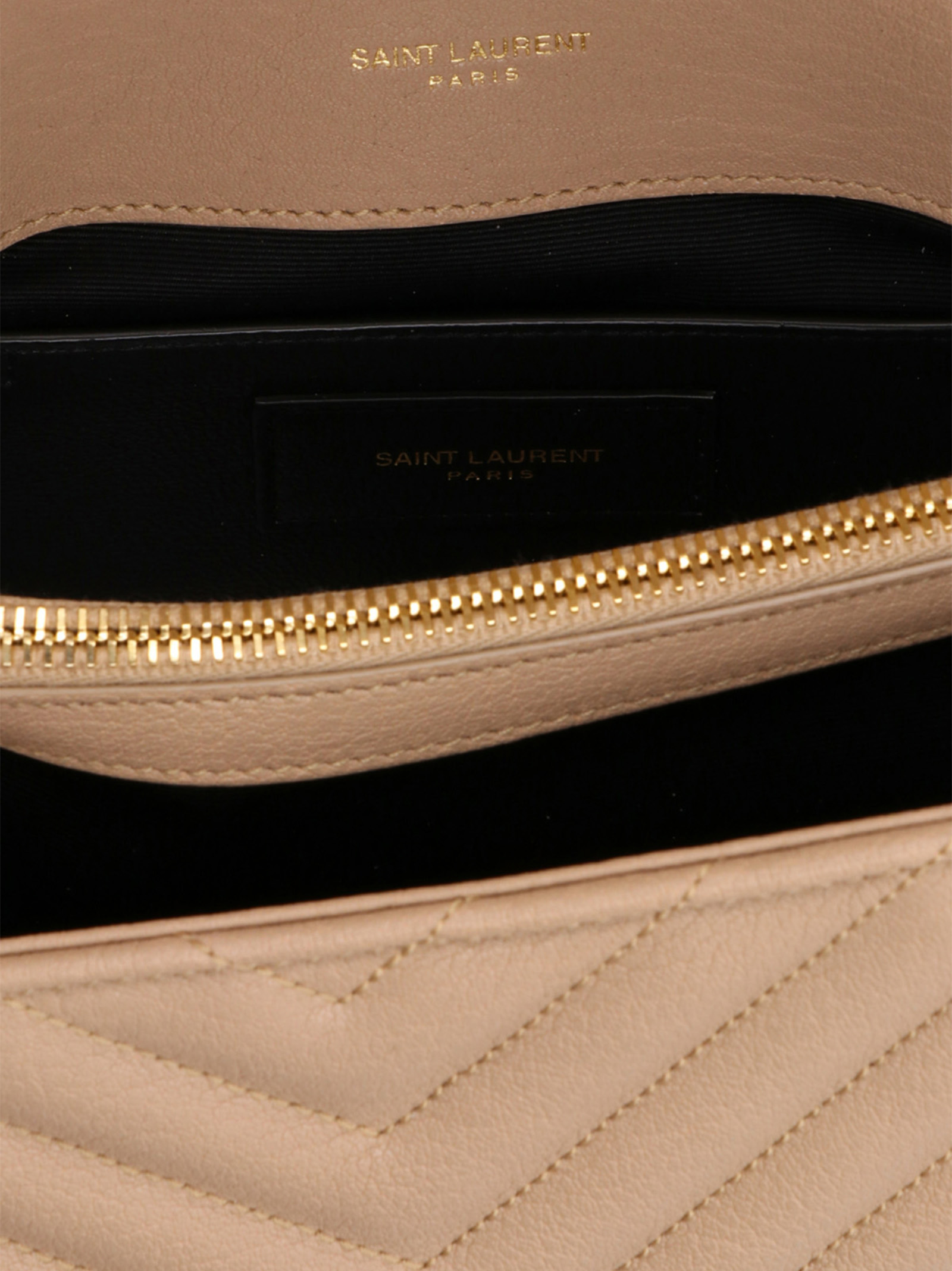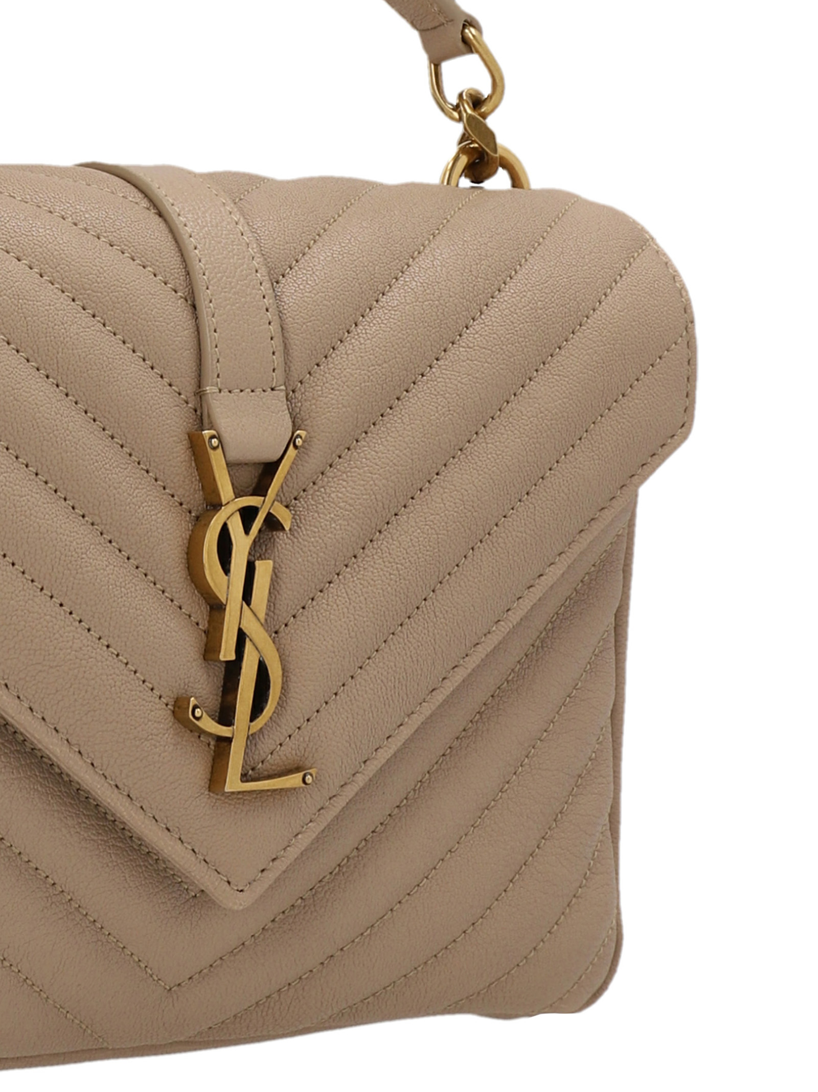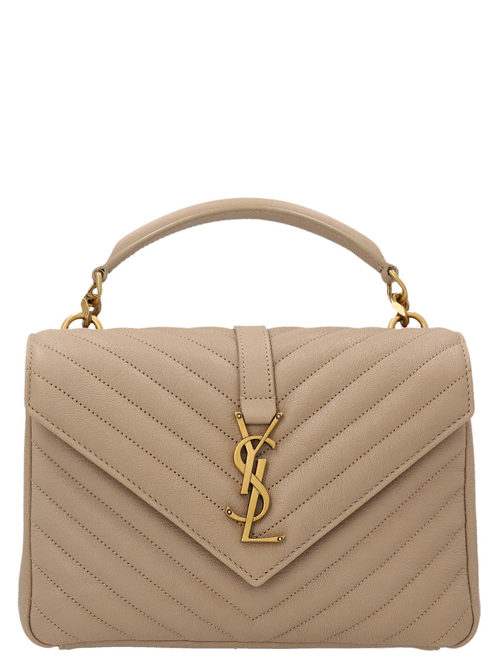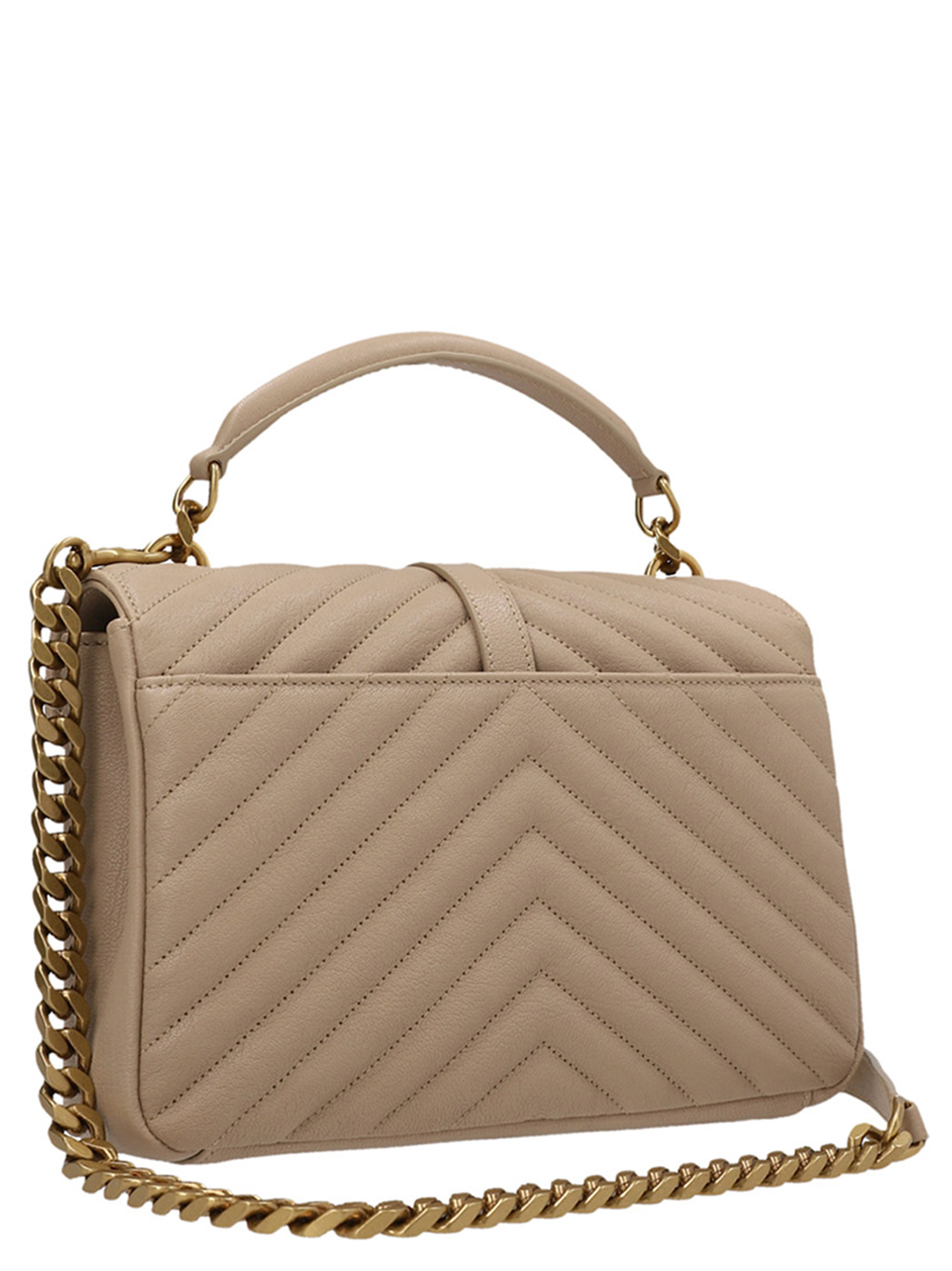 'College' midi crossbody bag in chevron quilted leather with magnetic flap closure with front metal logo, top handle, and removable leather and chain shoulder strap.