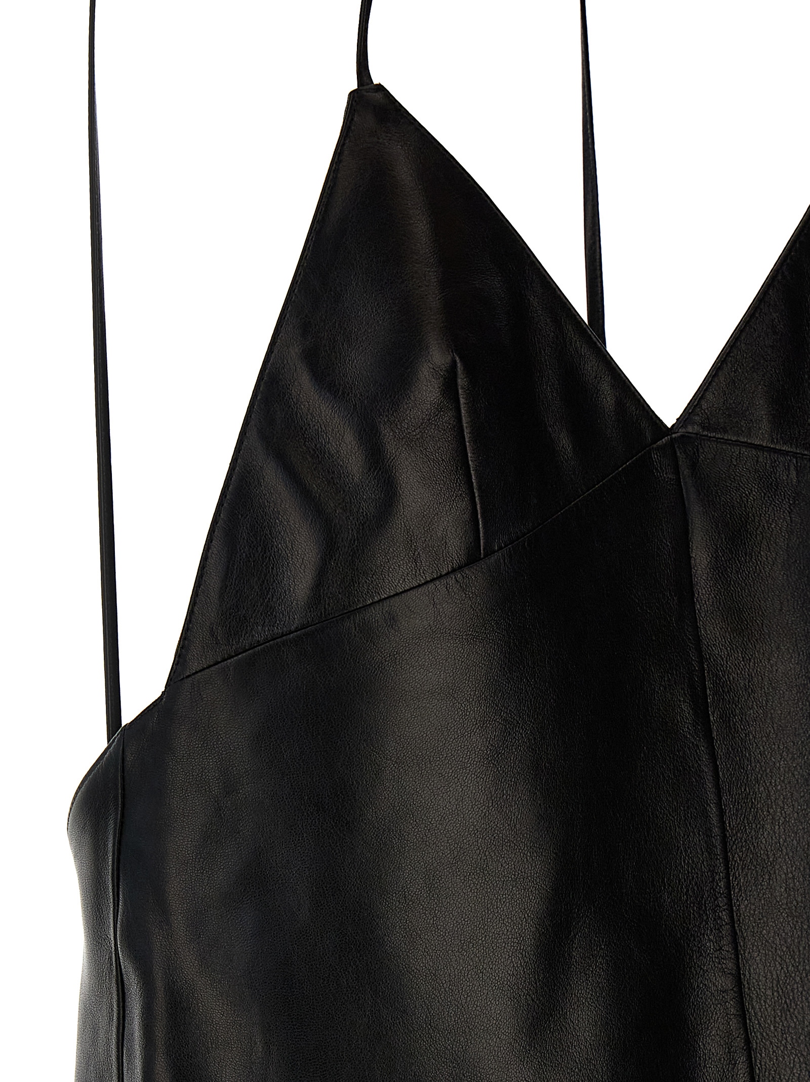 Leather slip dress, V-neck and bare back, thin straps.Өнімнің ерекшеліктері